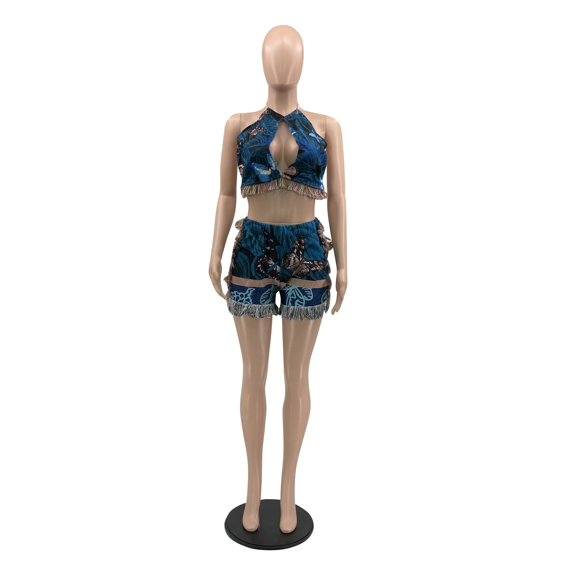 Summer new print tassel fringe vest sleeveless sexy backless crop top and shorts 2 two piece set suit y2k women clothing trend