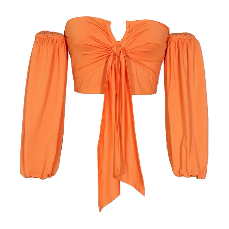 Summer off shoulder Women tops fashionable puff Long Sleeve Crop Tops elegant design Sexy Tie Front Crop Top