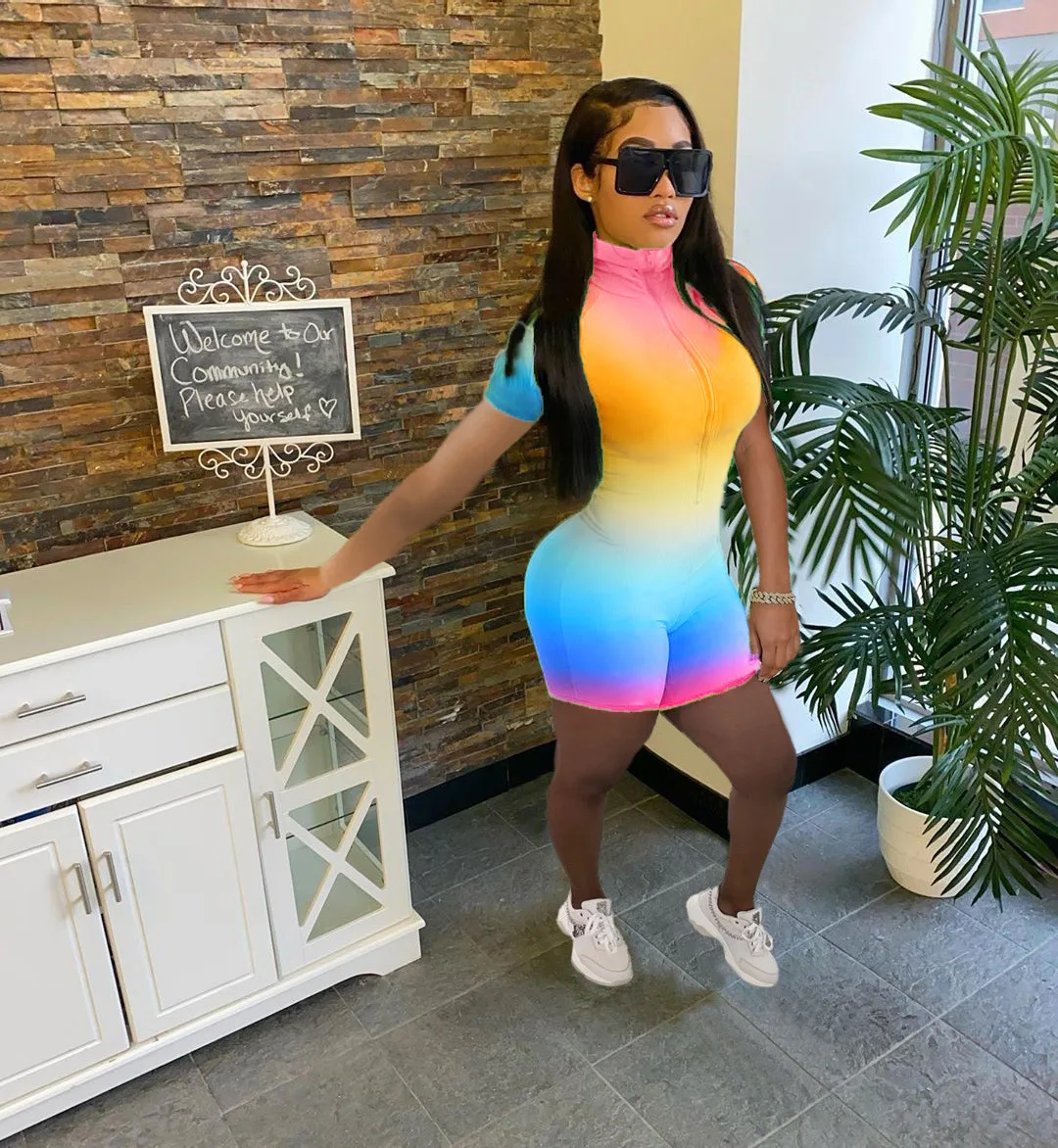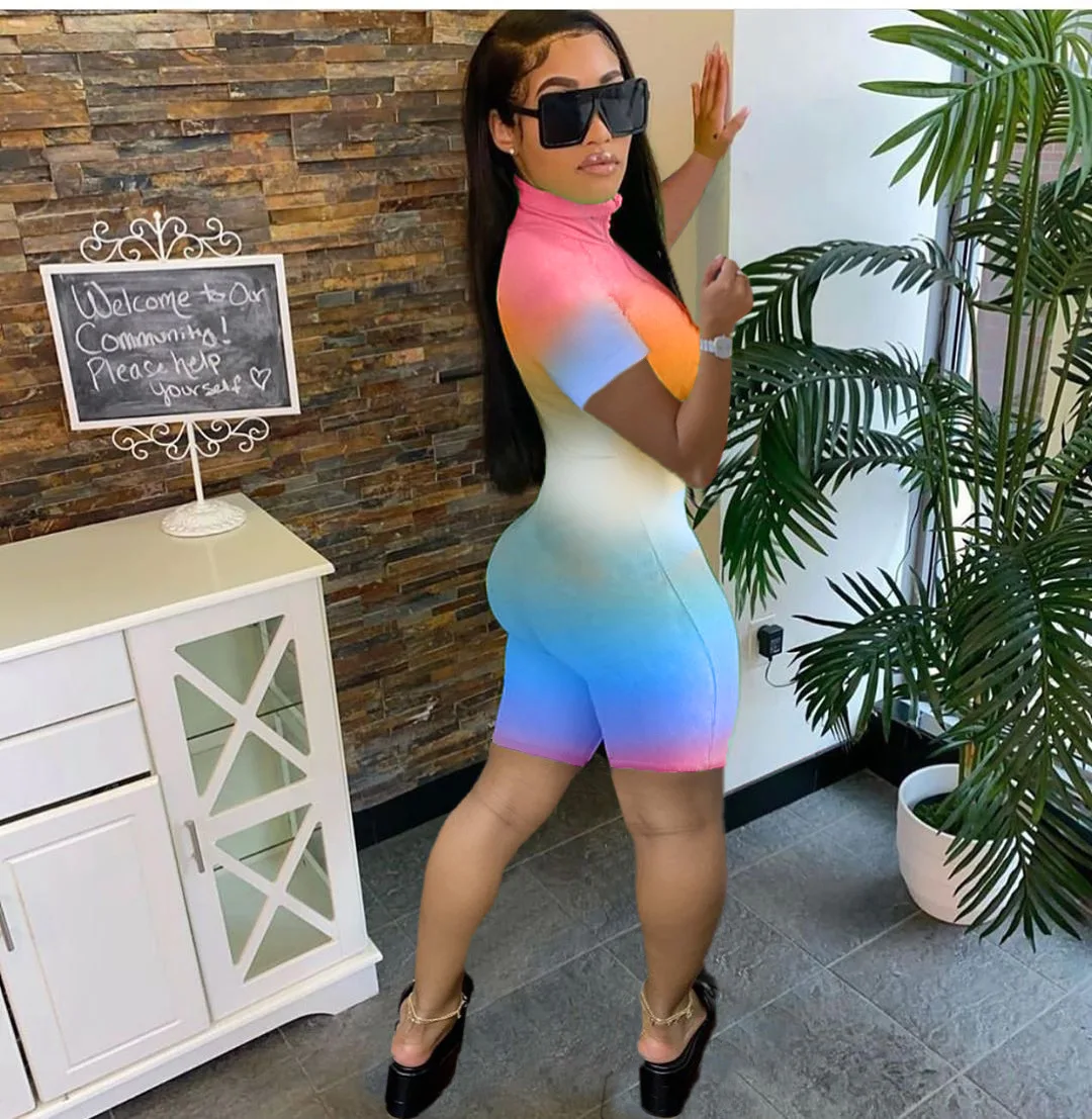 Summer Ombre Zipper Mid Waist Short Sleeve Ladies Rompers Sexy Bodycon Womens One Piece Ladies Jumpsuits