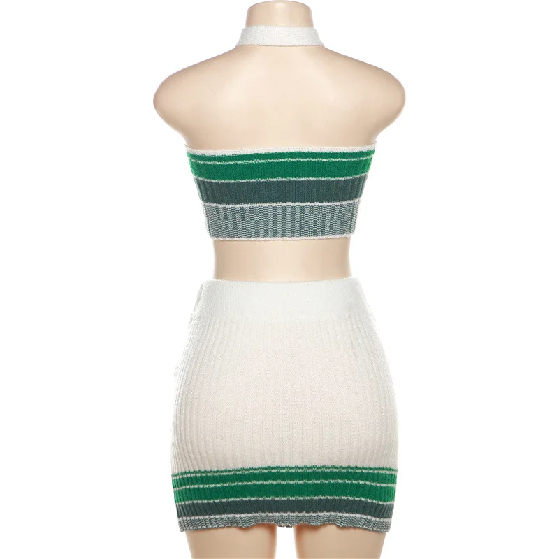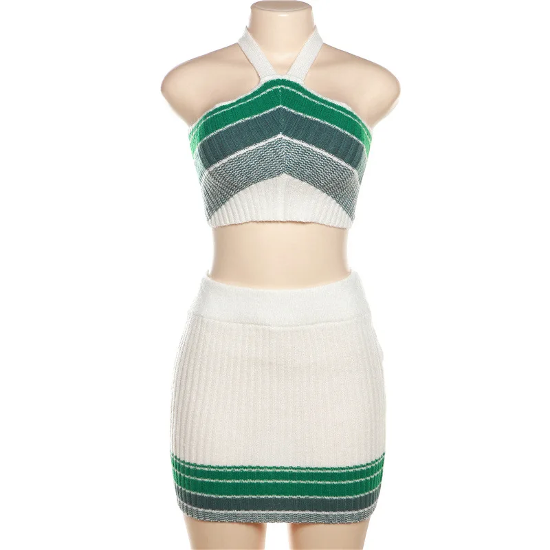 Summer patchwork color block sexy 2 two piece set women clothing knitted halter crop top and skirt set for women