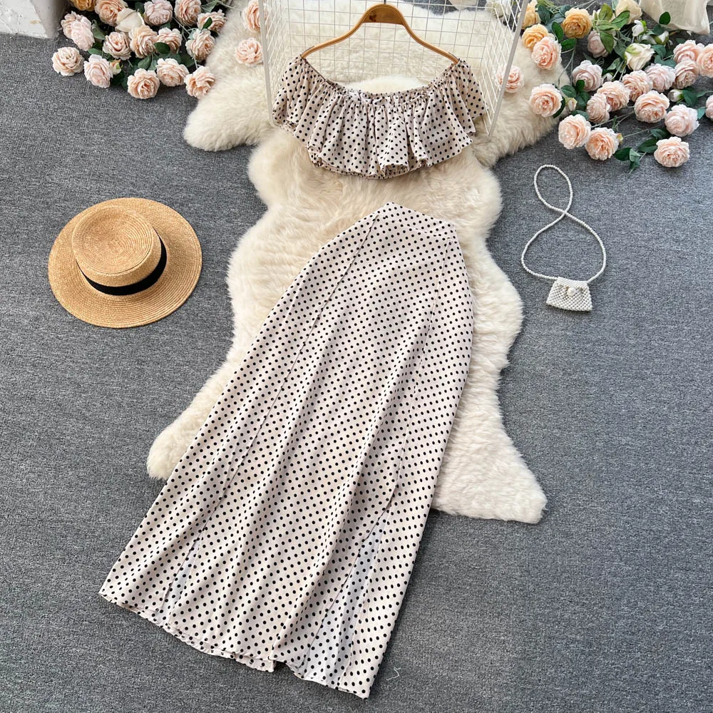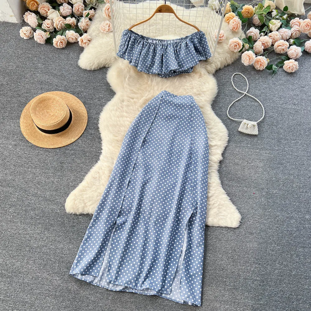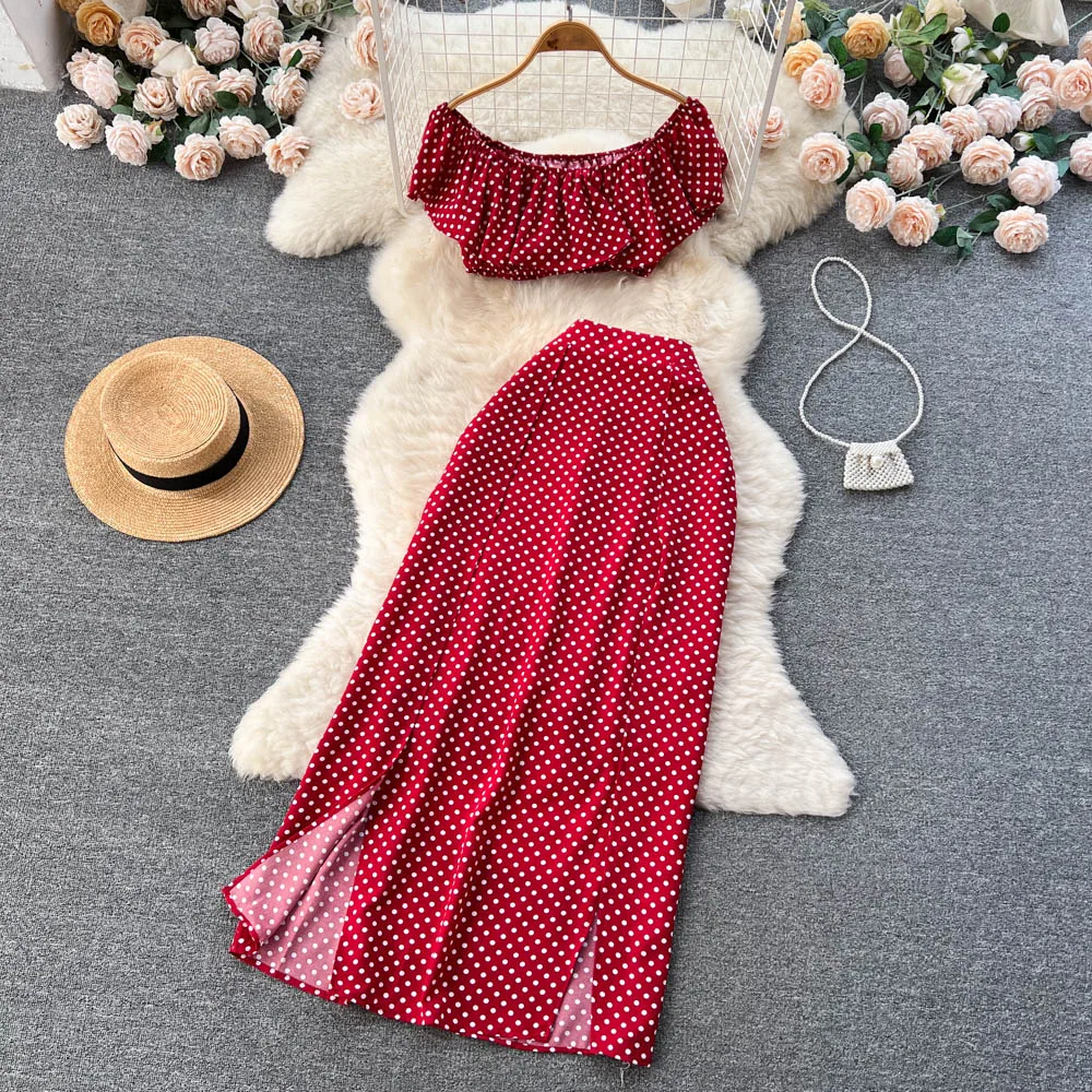 Summer Seaside Resort Storm Point Printed Suit Female Flounce Edge One-Line Shoulder Top + Half Skirt Two-Piece