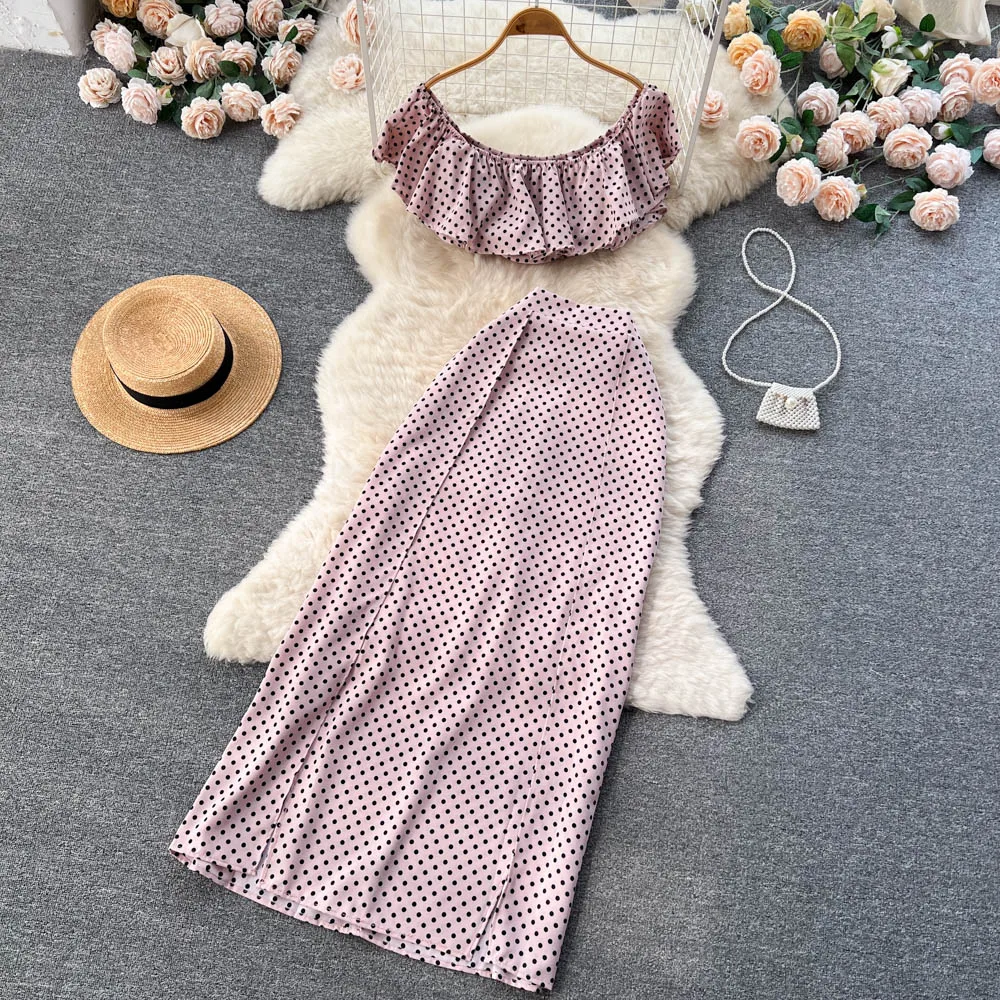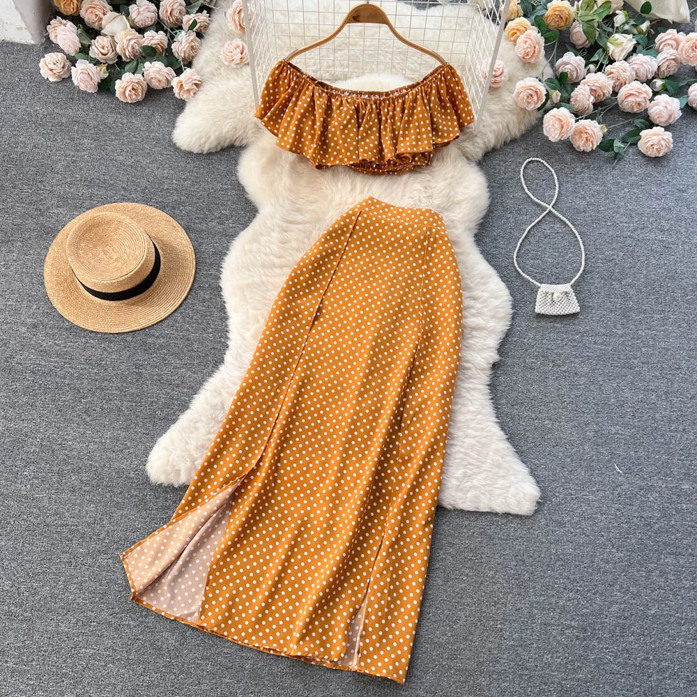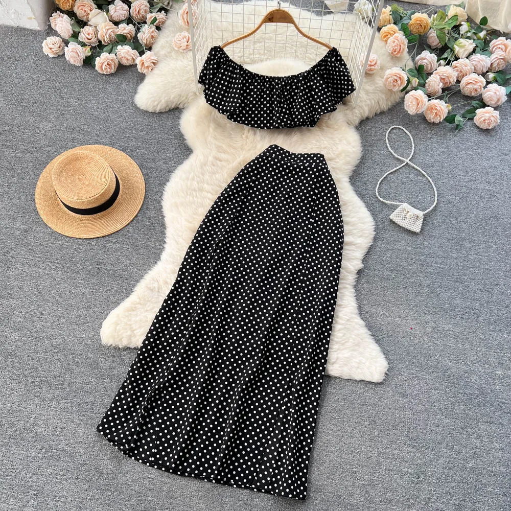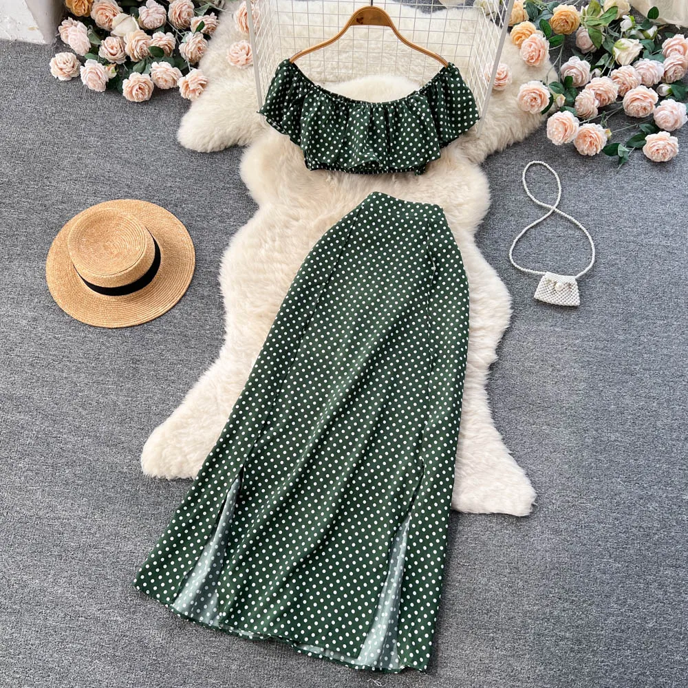 Summer Seaside Resort Storm Point Printed Suit Female Flounce Edge One-Line Shoulder Top + Half Skirt Two-Piece