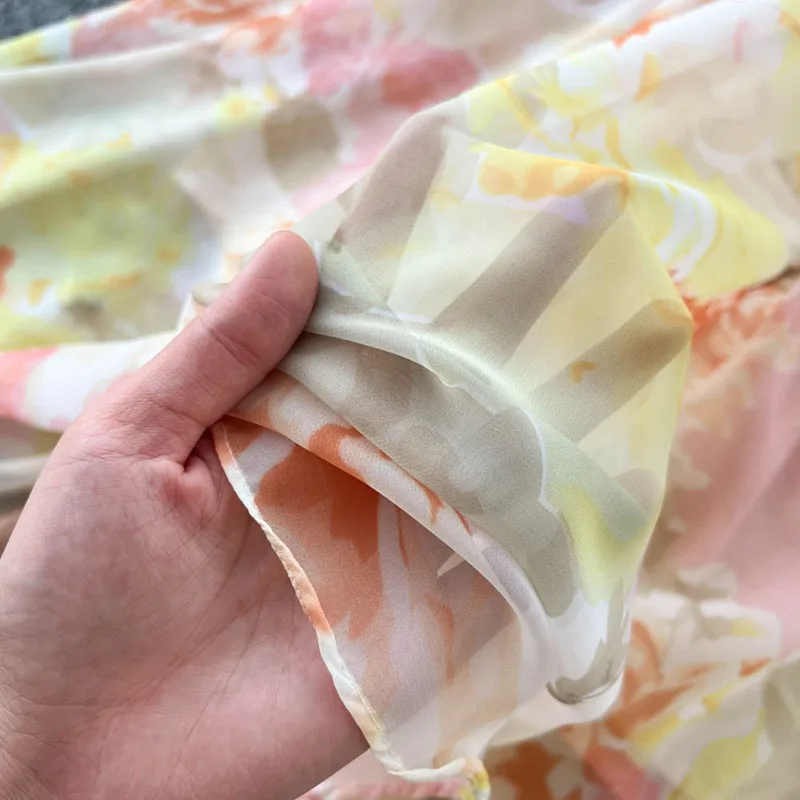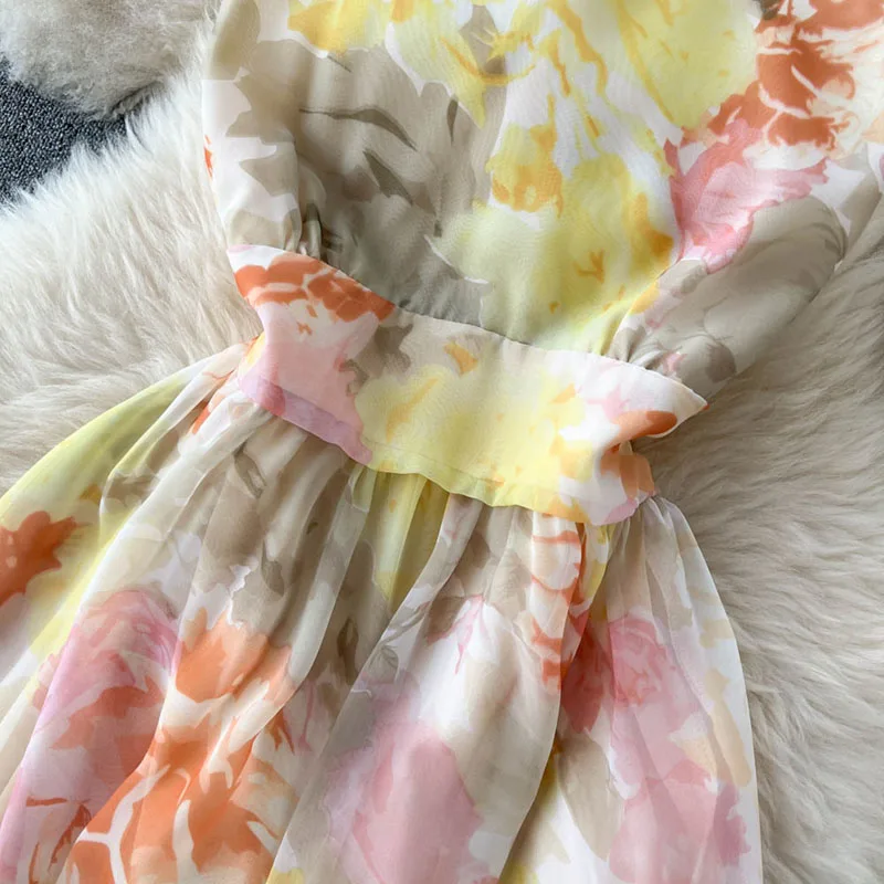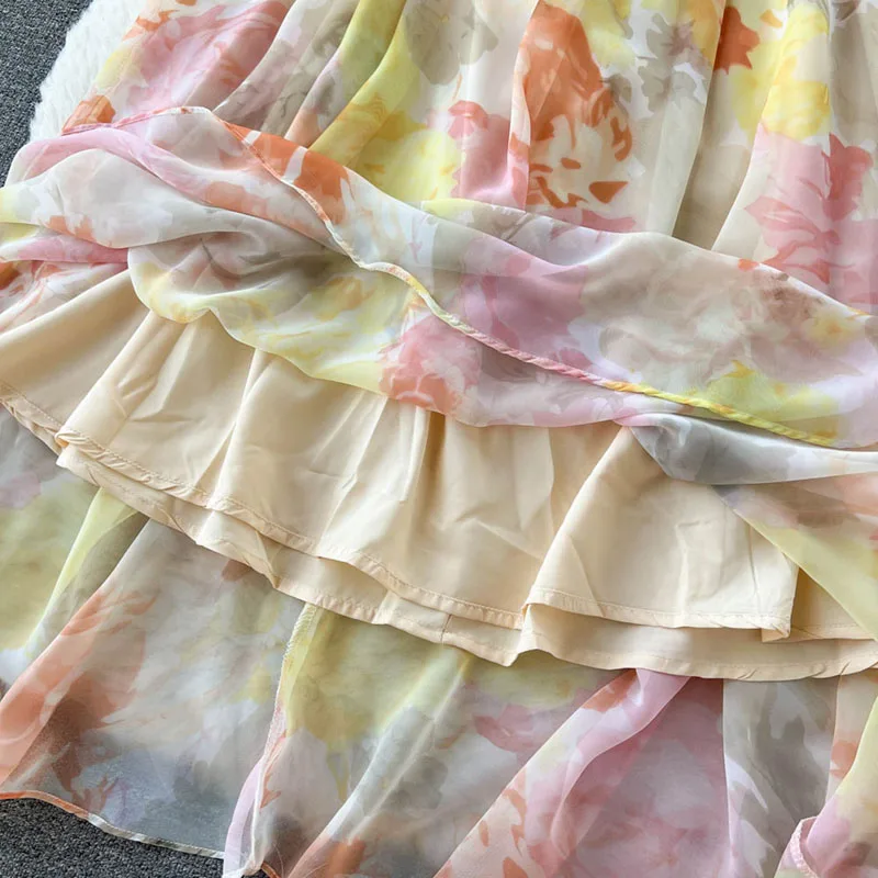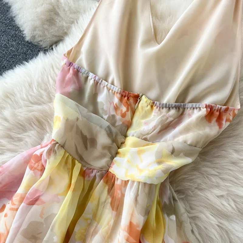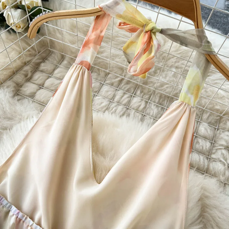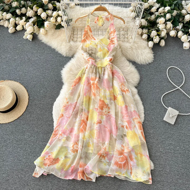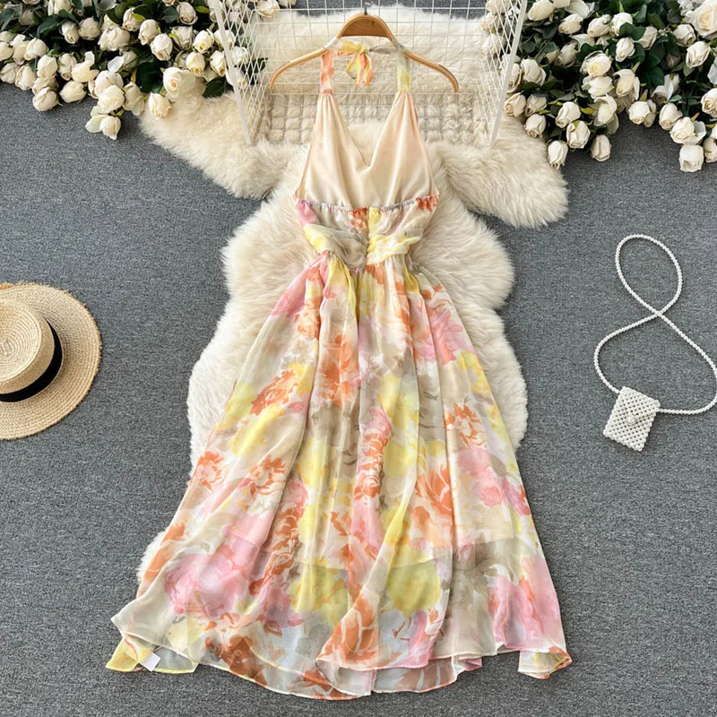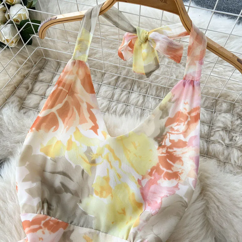 Summer Sexy Halter V Neck High Waist Lower Hem Floral Chiffon Dress Women Sweet Slim Ruffles Sandbeach Holiday Dresses Ladies