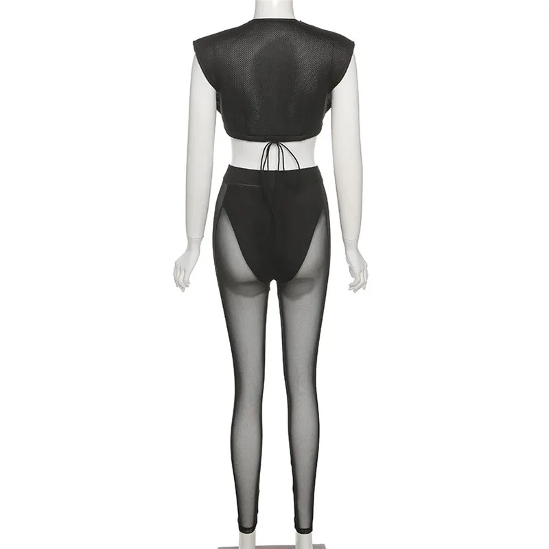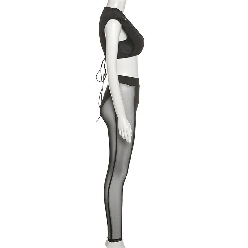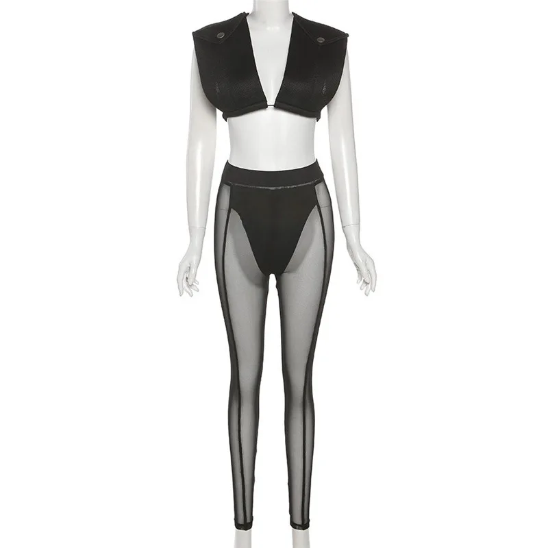 Summer sexy night club wear two piece pants set women clothing sleeveless crop top vest mesh pants set for woman