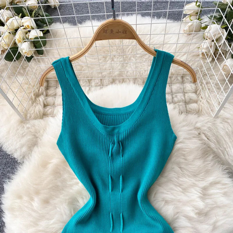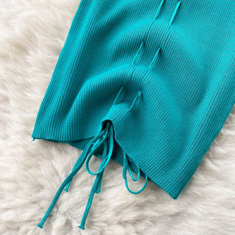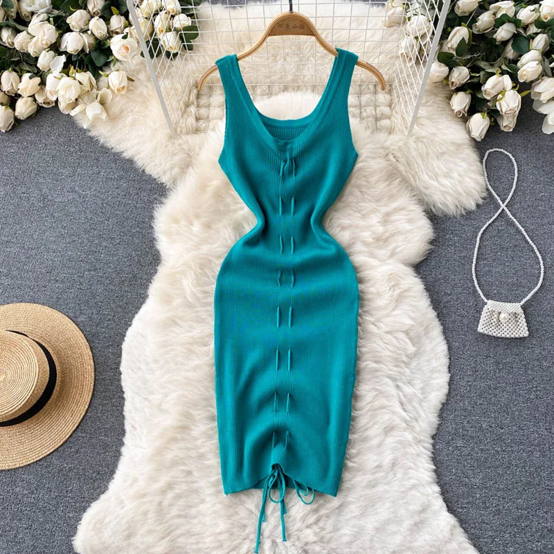 Summer Sexy V Neck Backless Thin Elastic Rib-Knit Drawstring Wrap Vest Dress Women Casual Chic Slim Bodycon Dresses Ladies