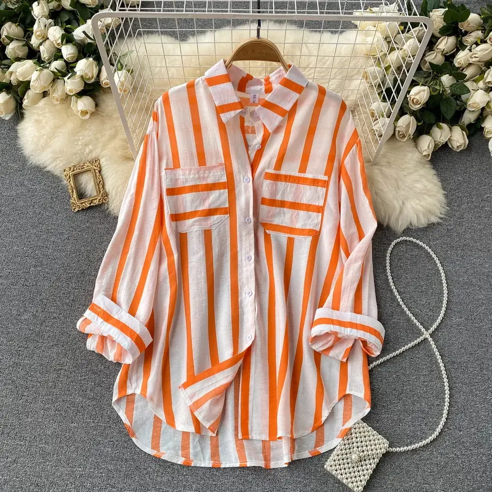 Summer Spring Autumn New Mid-length Vertical Stripes Multi-color Shirt Coat Female Korean Version Casual Loose T-shirt Coat