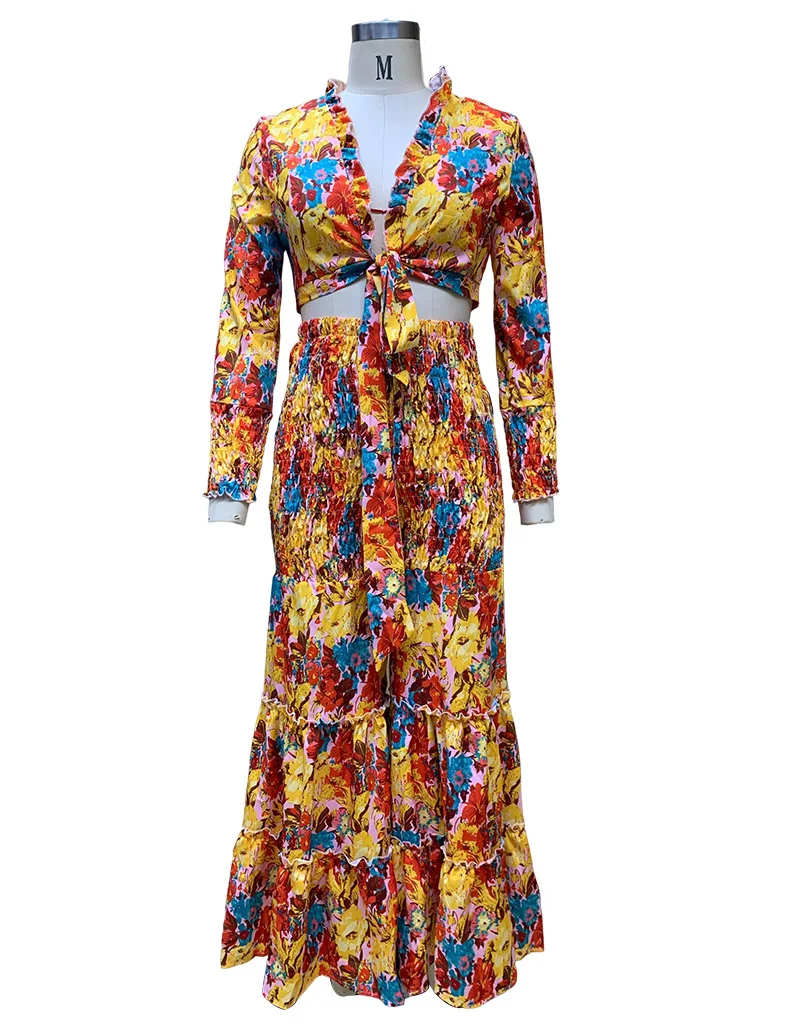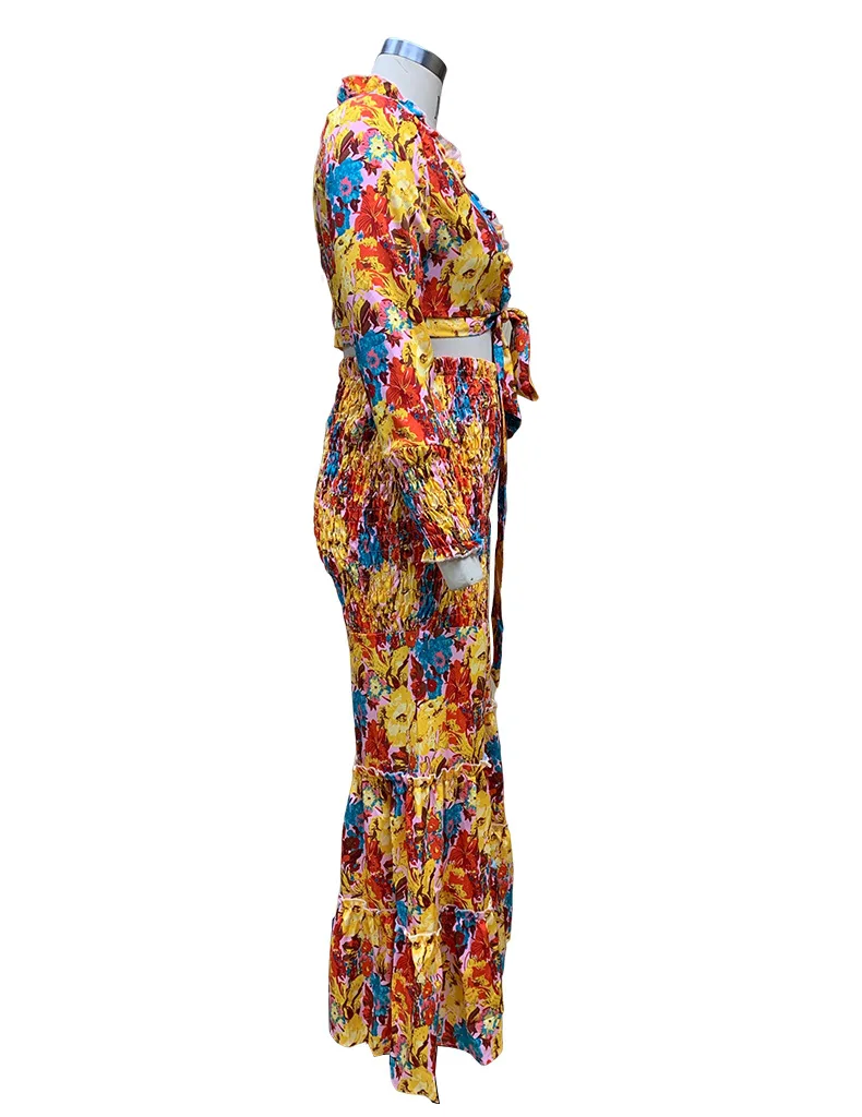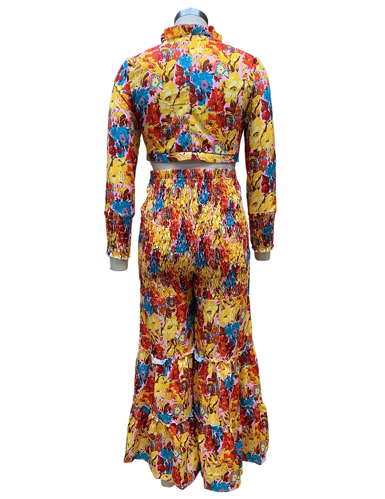 Summer spring ladies casual floral printed V neck long sleeve crop top wide leg flare pant 2 two piece women's sets