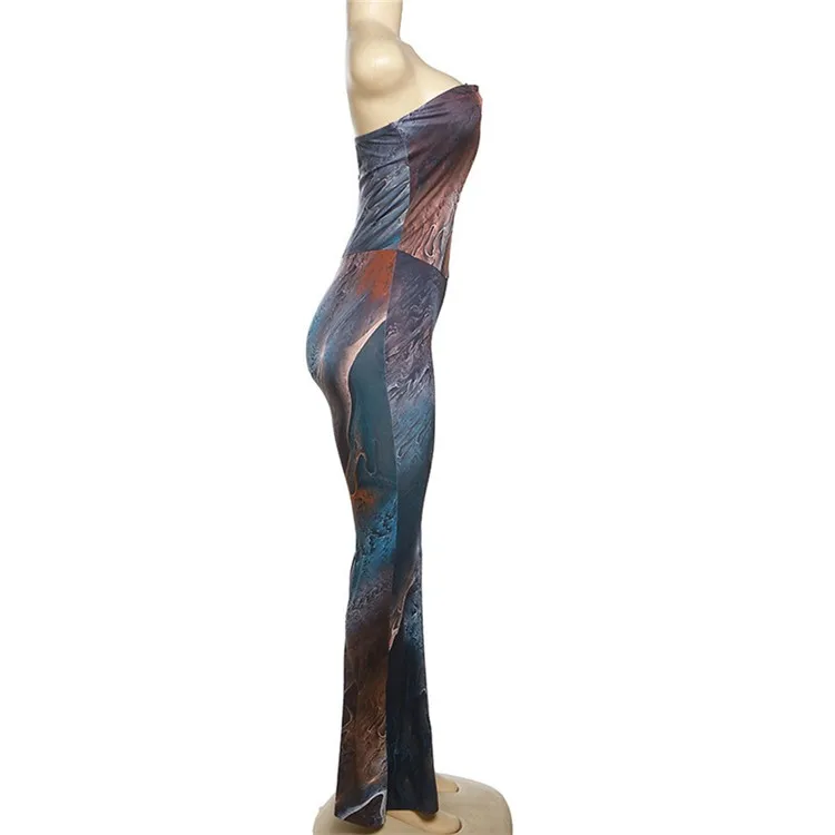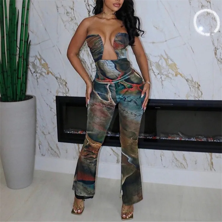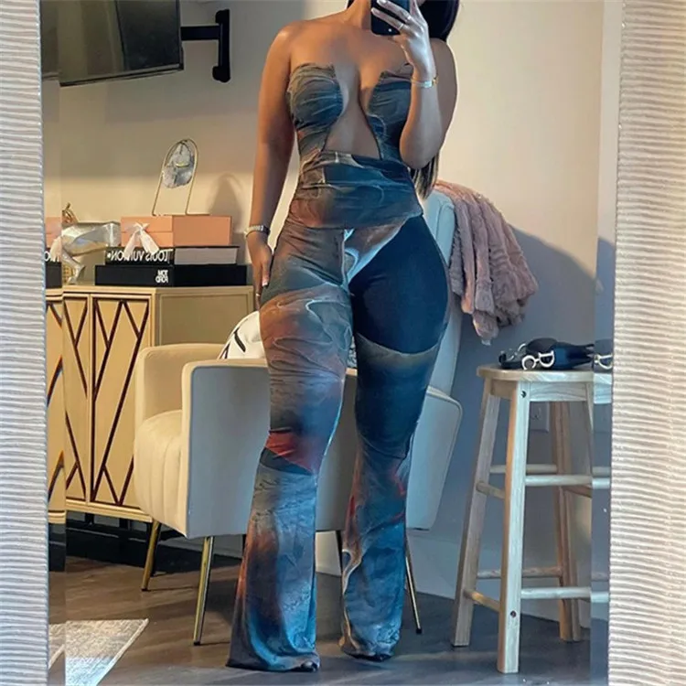 Summer Strapless Open Chest Hollow Out Jumpsuit Women Off the Shoulder Sexy Wide Leg Bodycon Rompers