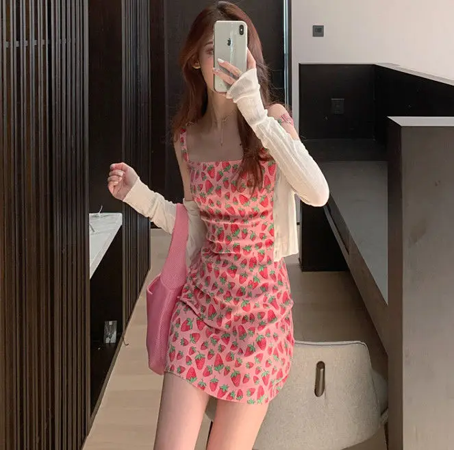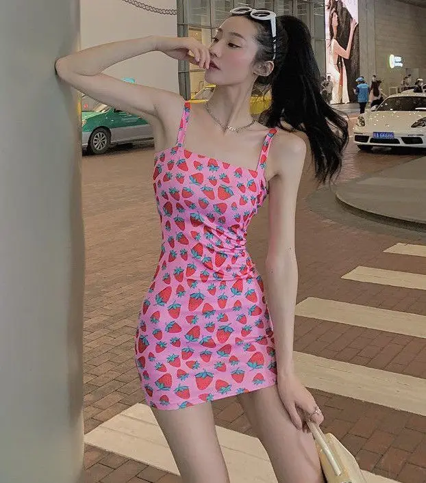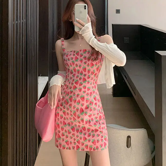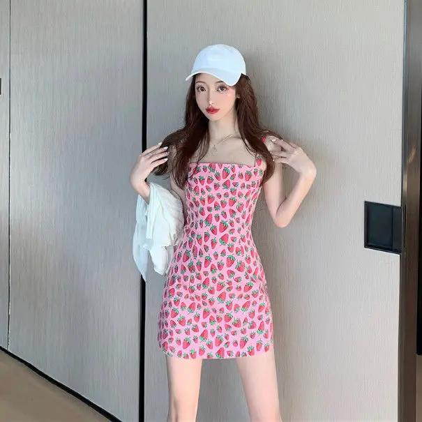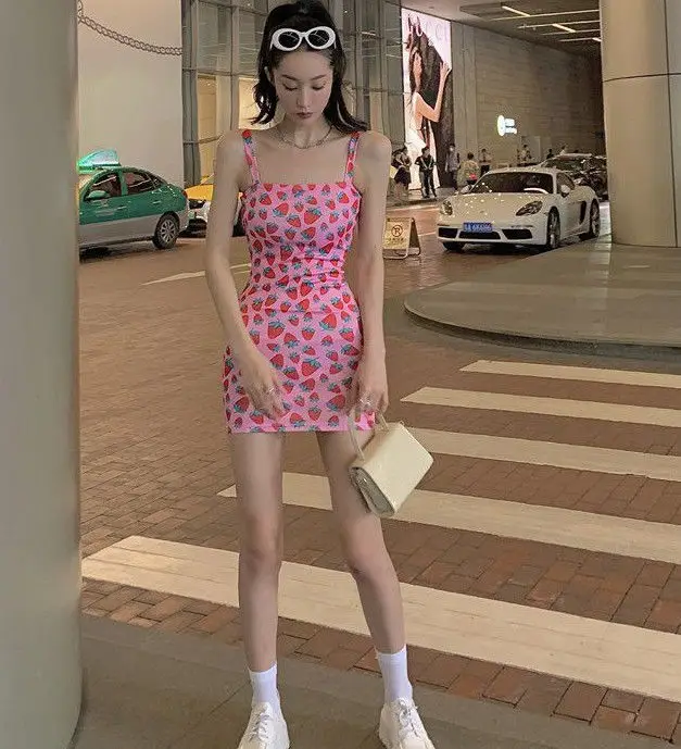 Summer Strawberry Mini Ladies Dress Sexy Bodycon Dress Women Slip Short Womens Dresses Pink Kawaii Cute Streetwear