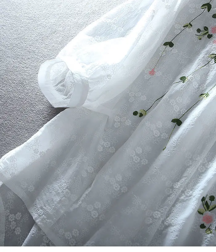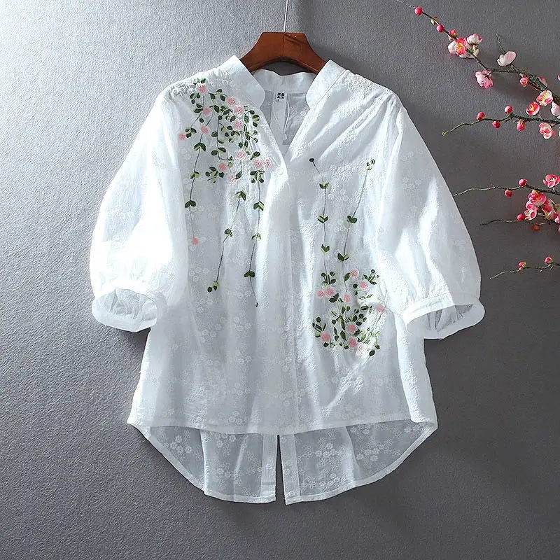 Summer White Cotton Embroidery V-neck Pullover All-match Casual Short mid Sleeve Sunscreen Shirt