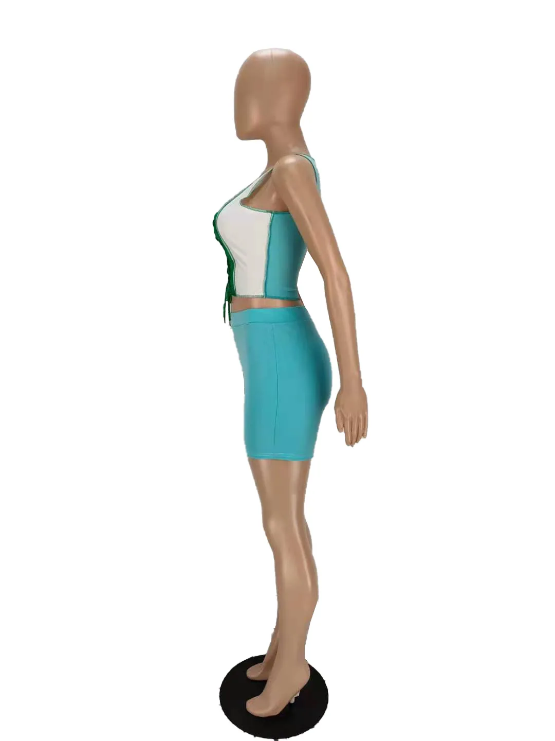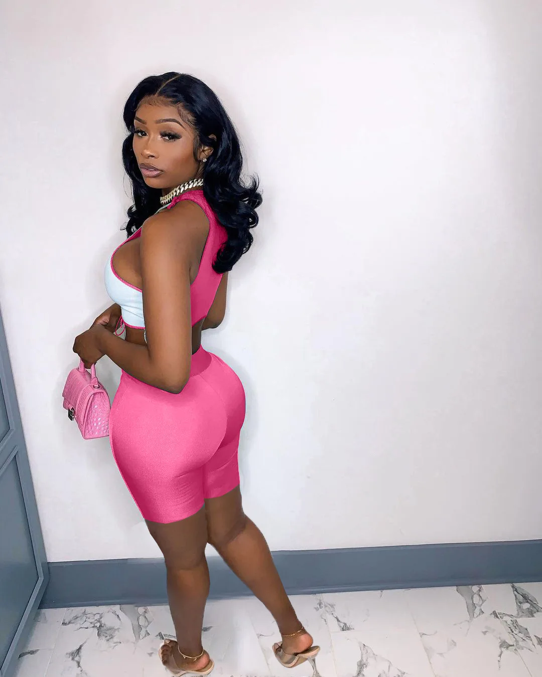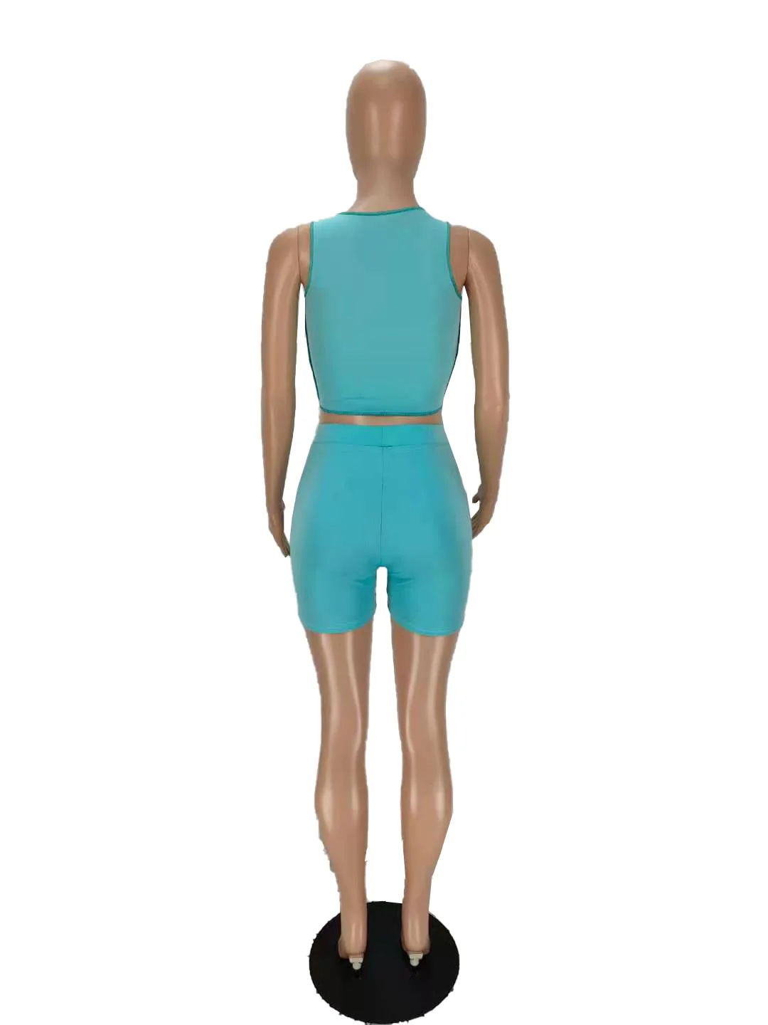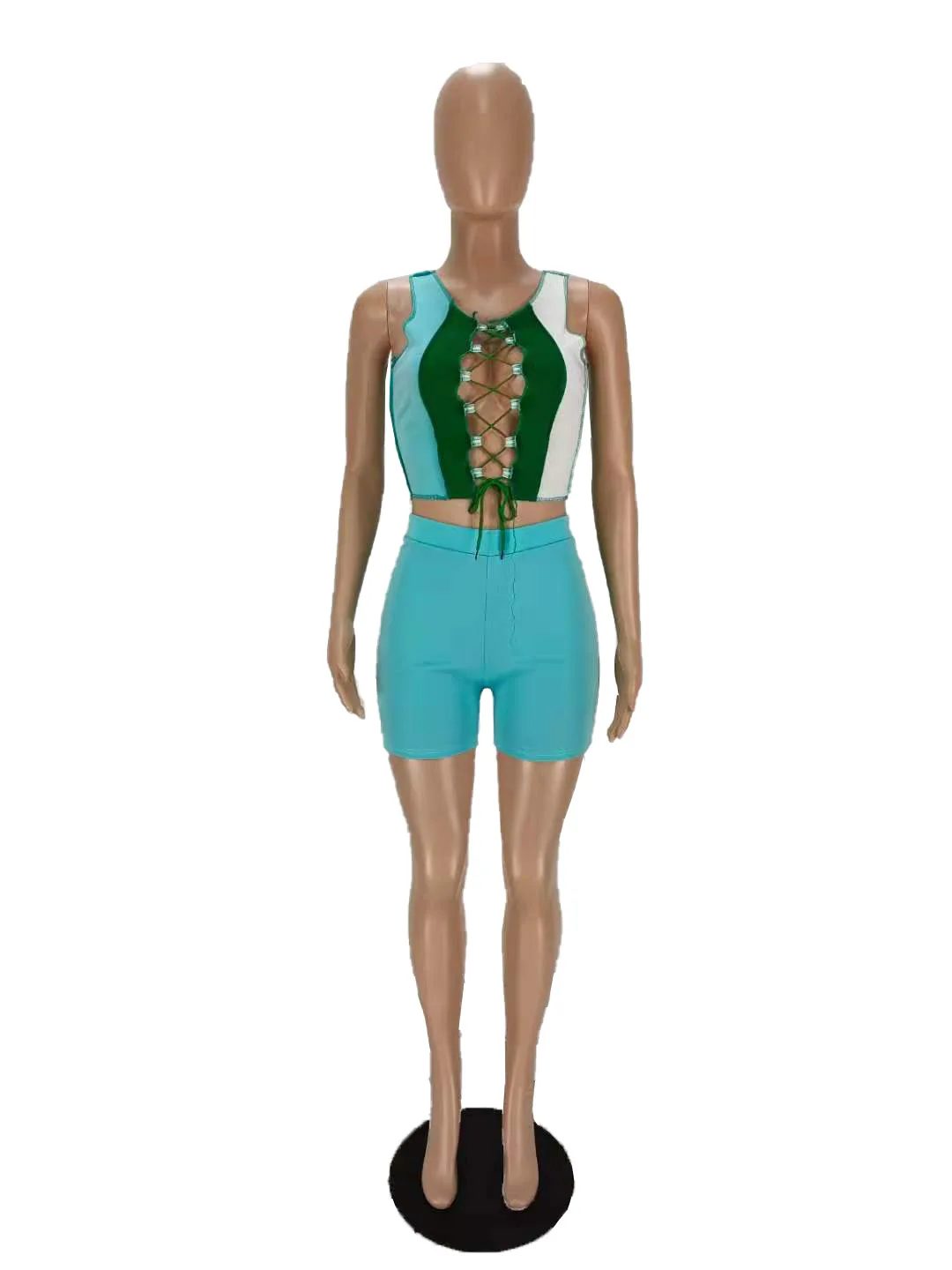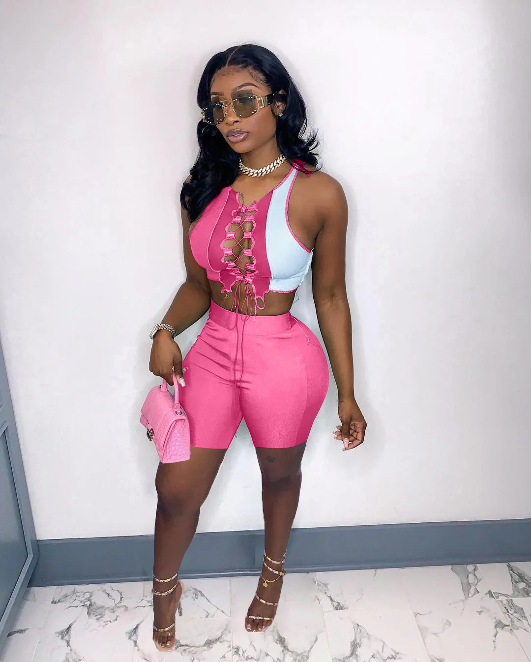 Summer Women Casual Two Piece Short Set Sleeveless Lace Up Crop Top Cut Out Sport Sexy 2 Piece Ladies Outfits