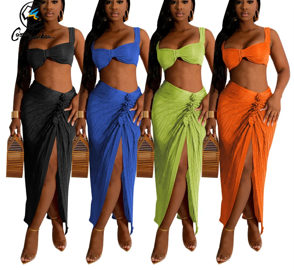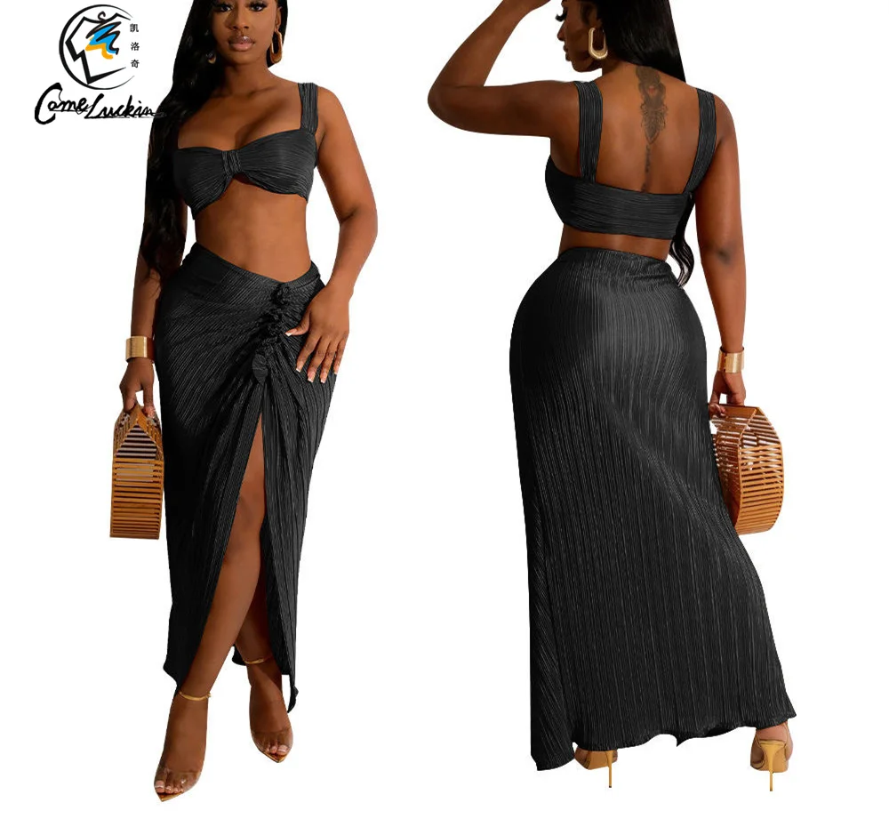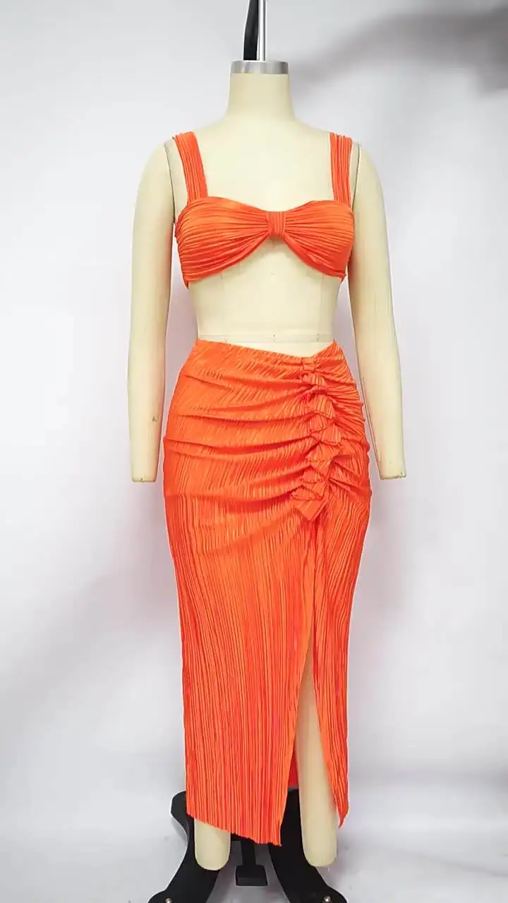 Summer Women Clothing Sexy Beach Wear One Shoulder Tube Top And Split Skirt 2 Piece Set Pleated Suits