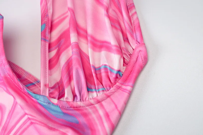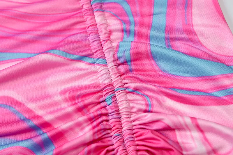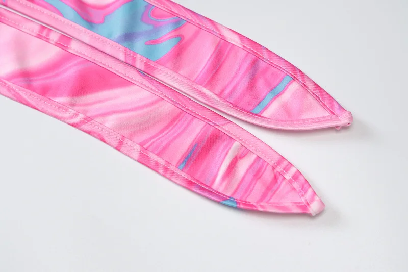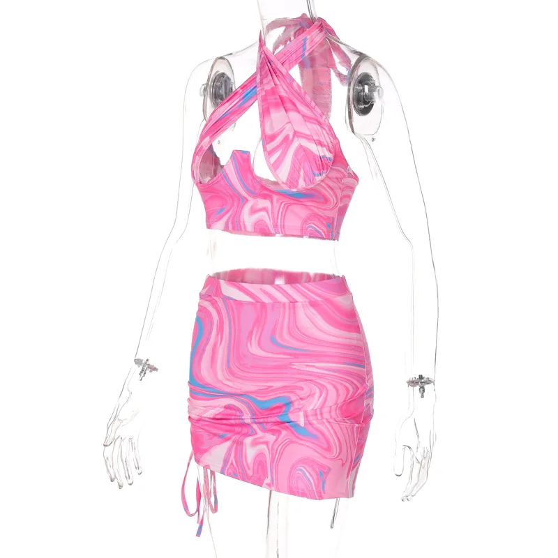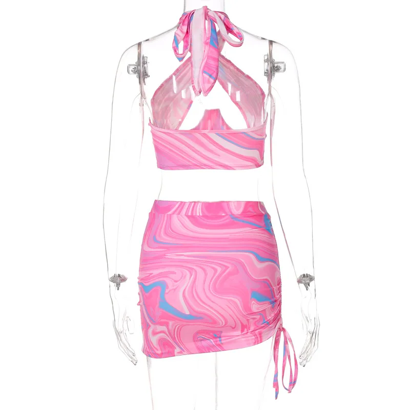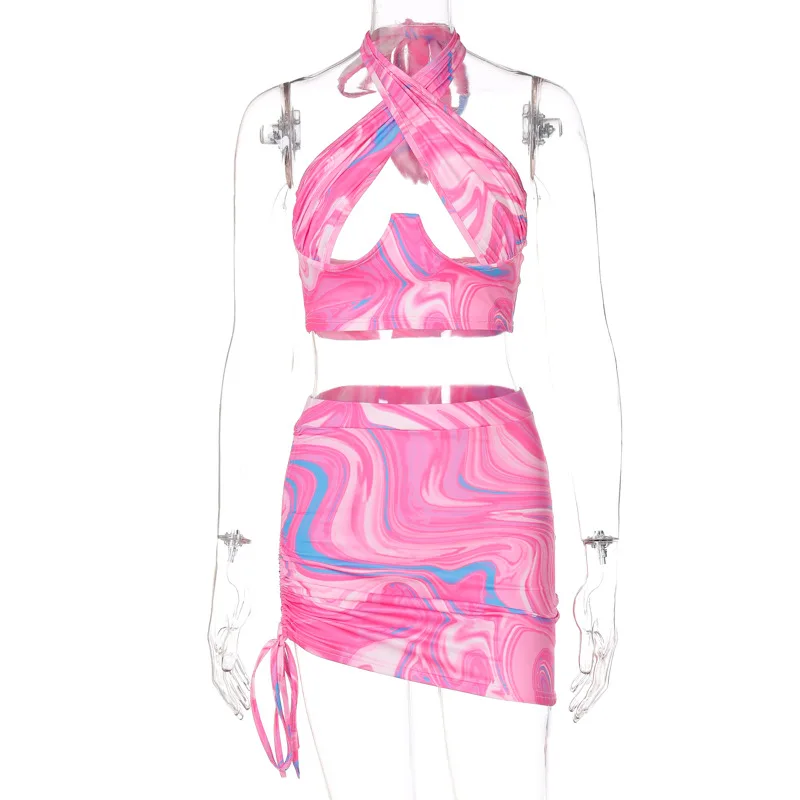 Summer women's two piece skirt set clothing new fashion print crossover halter neck drawstring crop top hip wrap bodycon dress