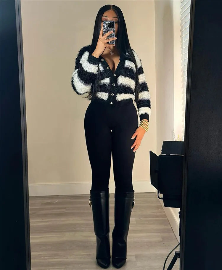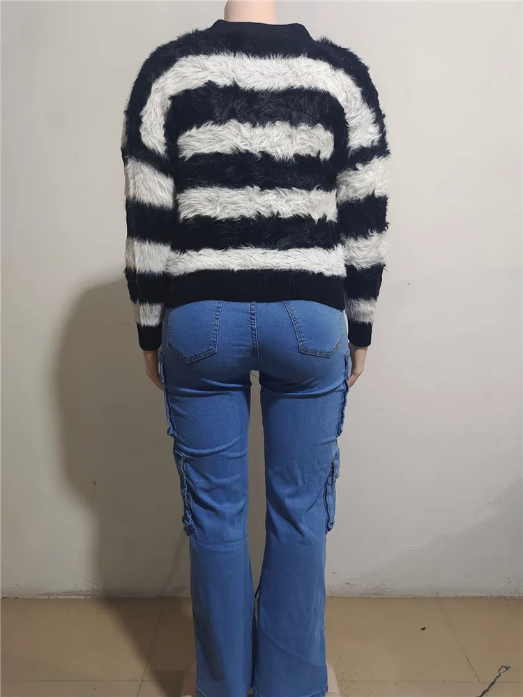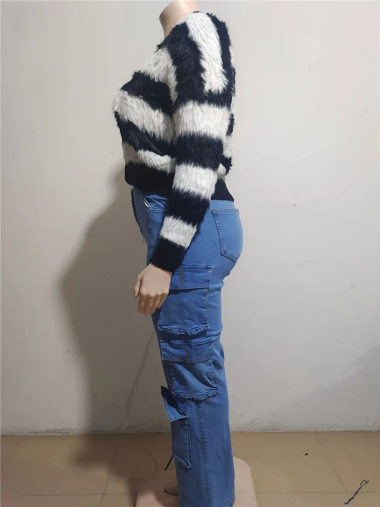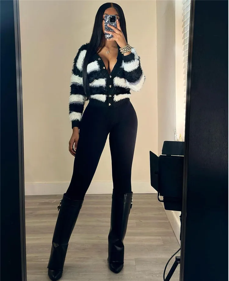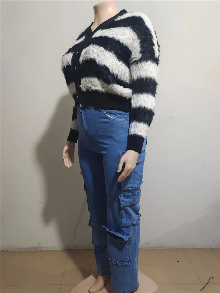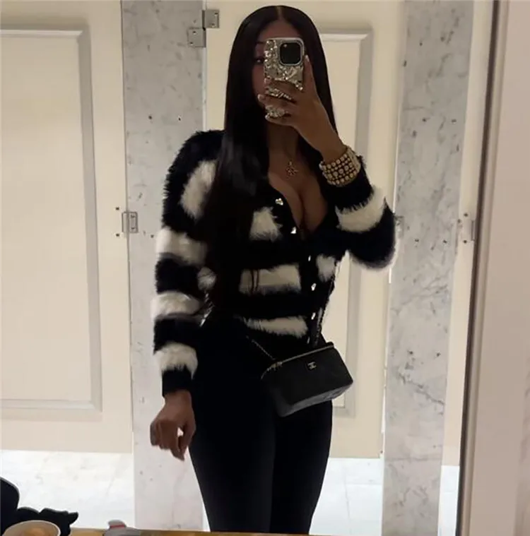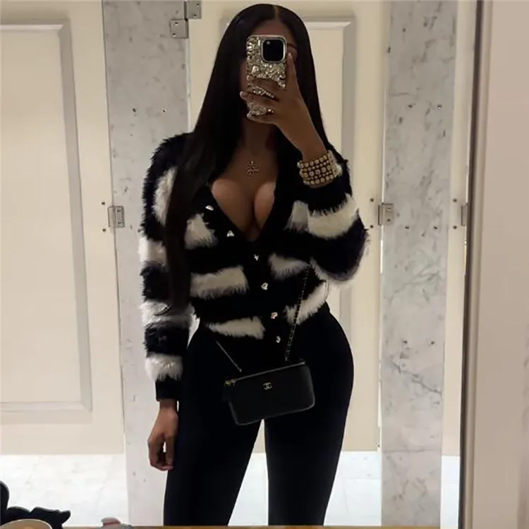 Sweater Women Fashion Woman Cardigan 2024 Cropped Tops Autumn Striped Sweater Faux Fur Knit Coat