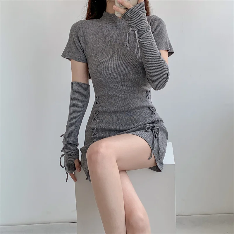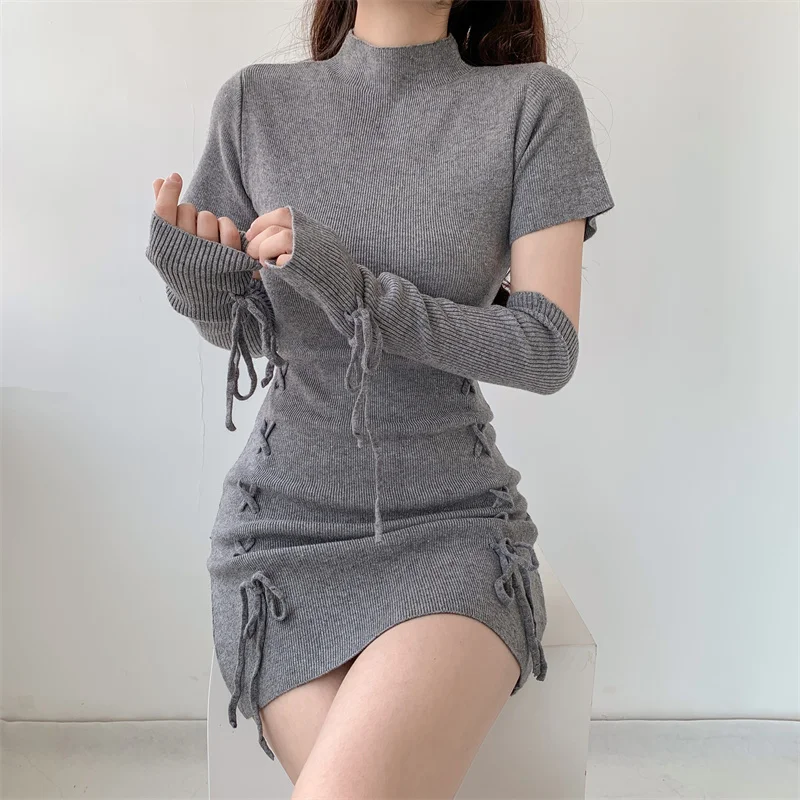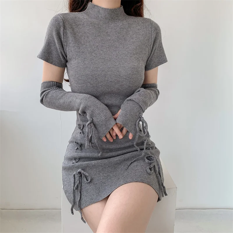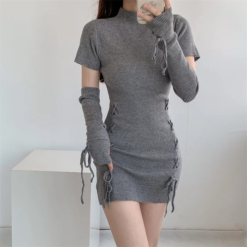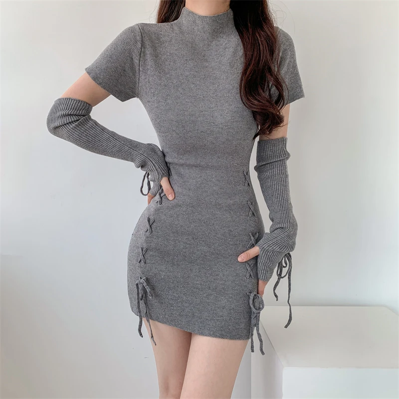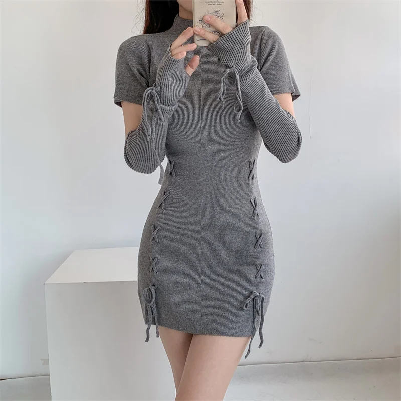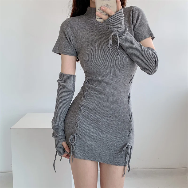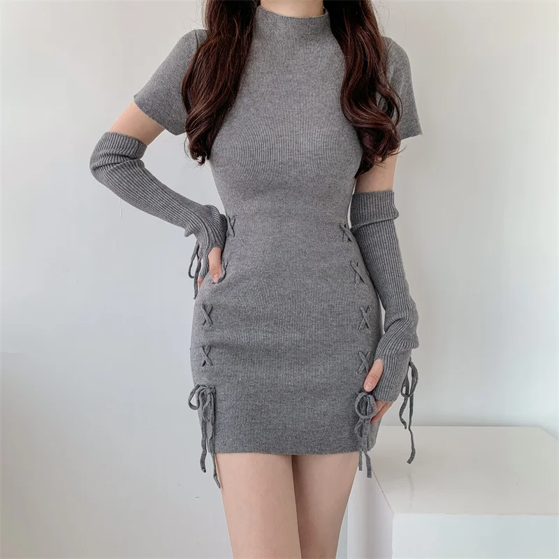 Sweet Cute O-Neck Bodycon Dress for Women Clothing Separate Sleeveless Sweater Pink Sexy Knitted Mini Dress Sexy Winter