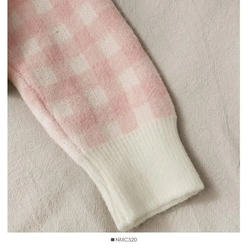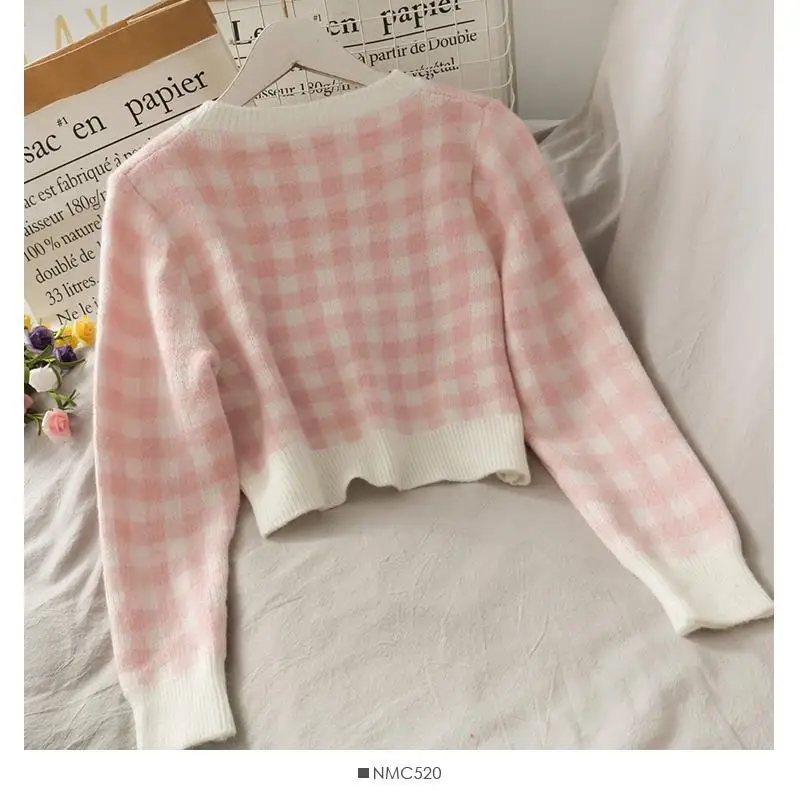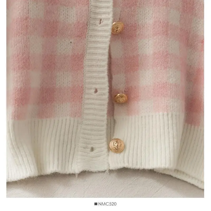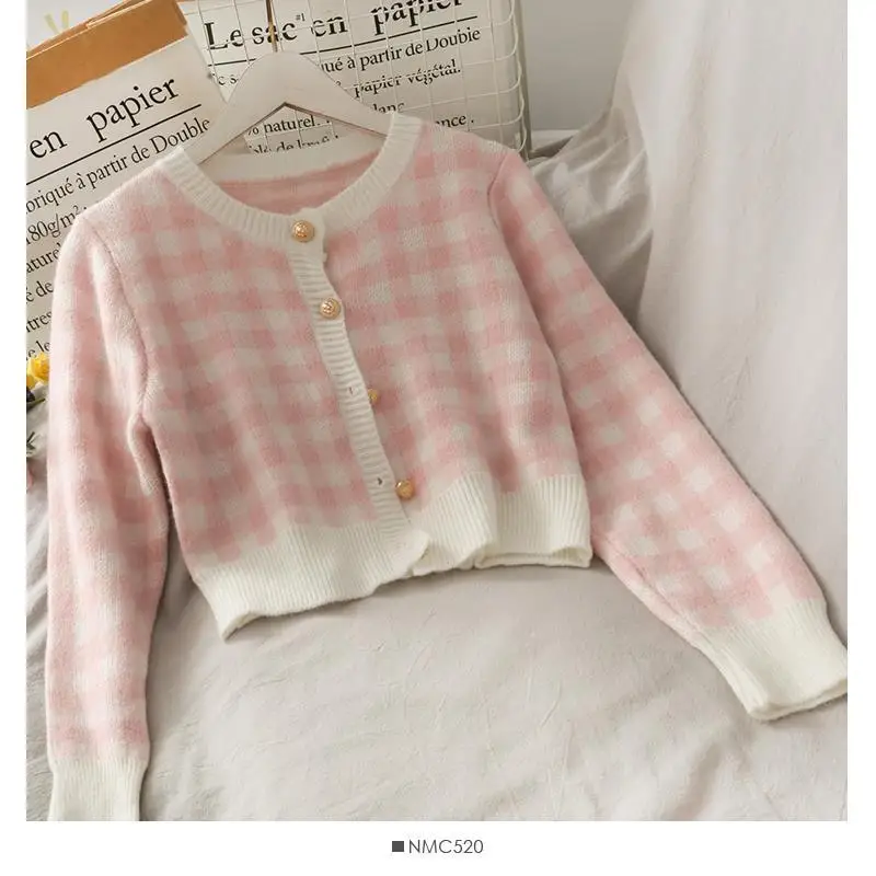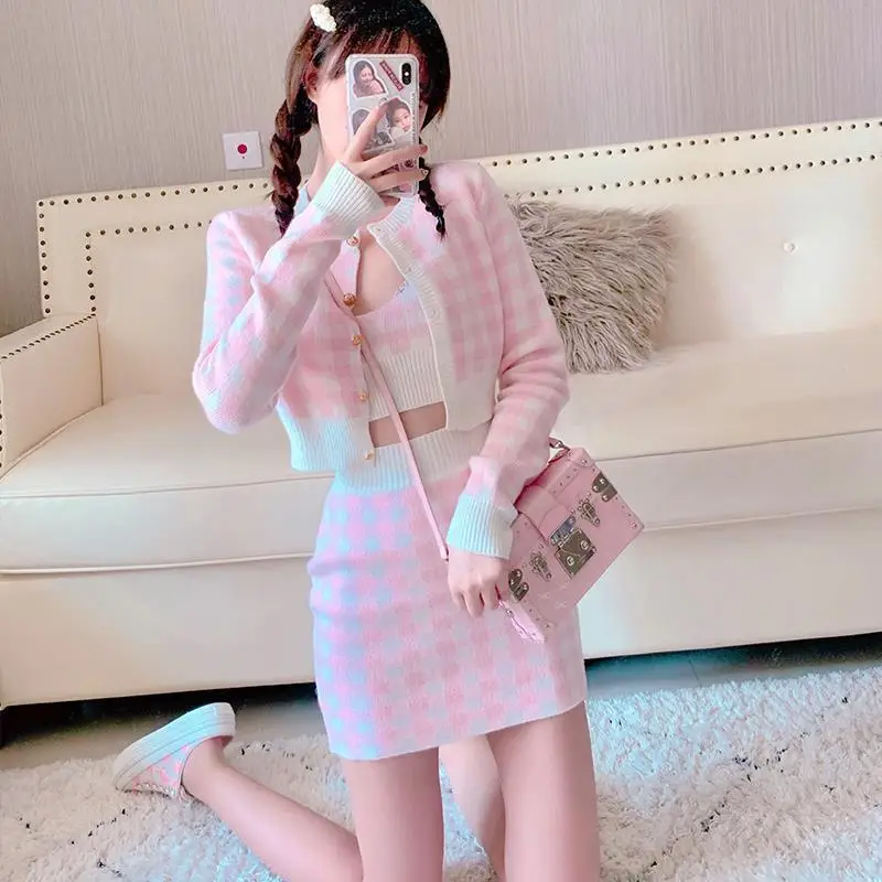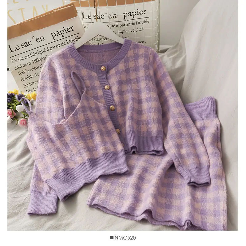 Sweet Plaid Three-Piece Set Women'S New Round Neck Single-Breasted Long-Sleeved Loose Sweater With A Short Suspender Skirt