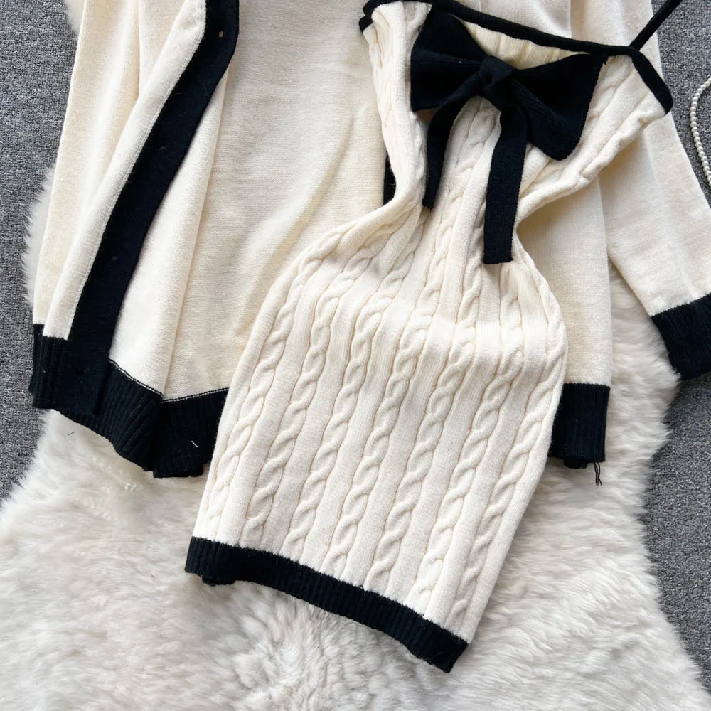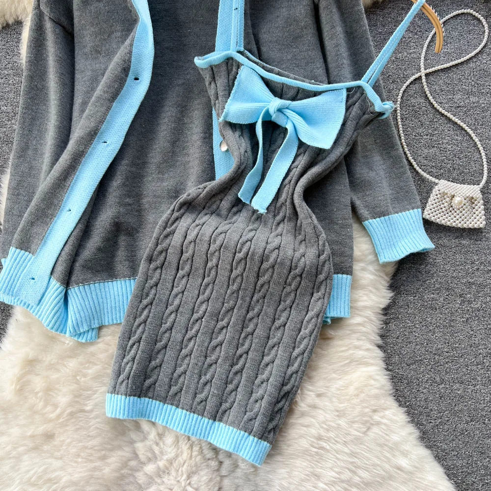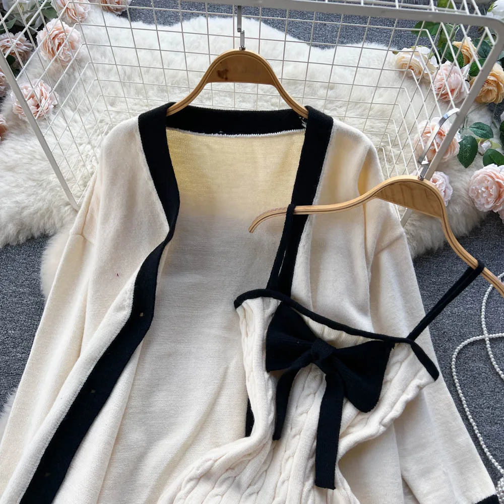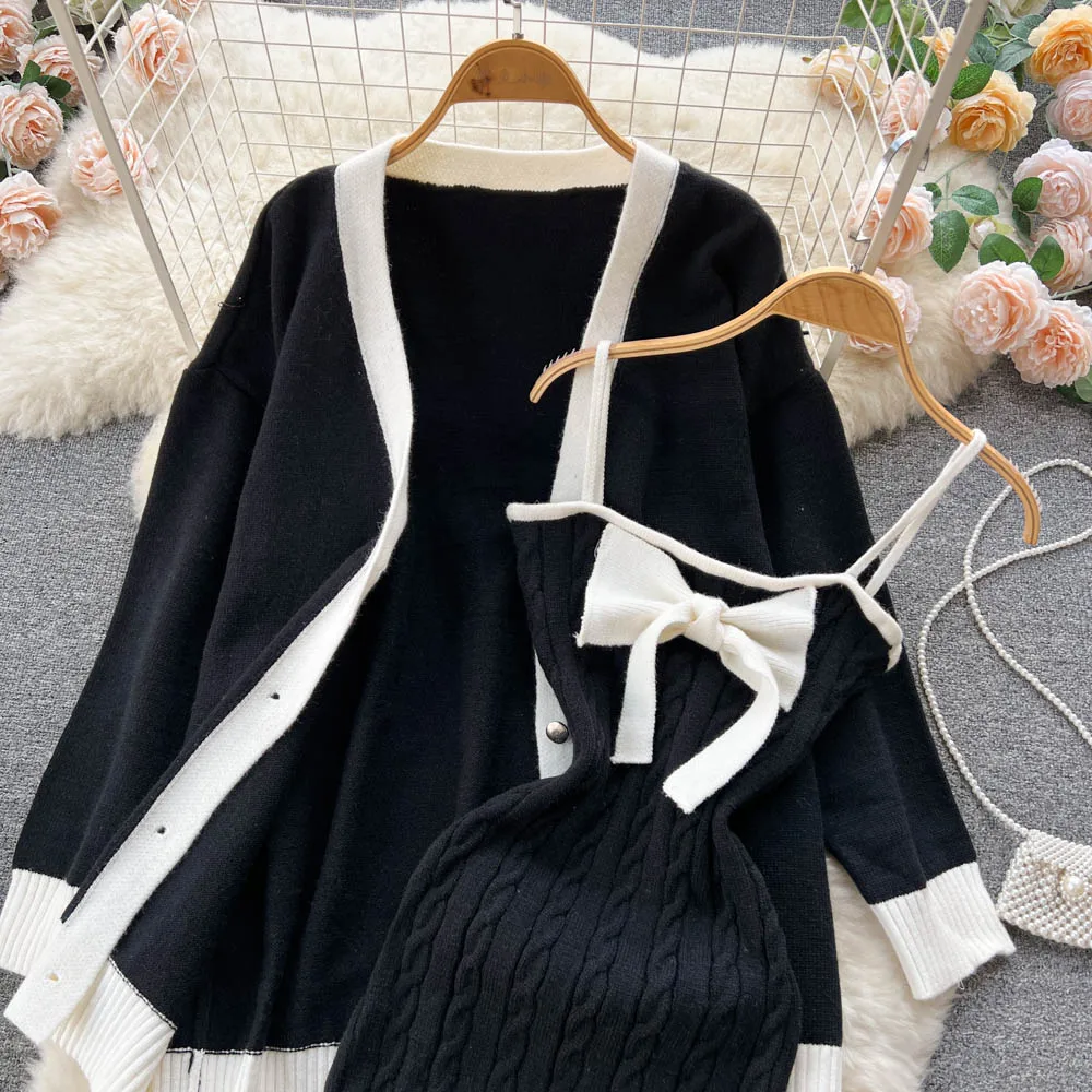 Sweet suit women's bow Fried Dough Twists suspender dress and lazy style knitting cardigan two-piece set
