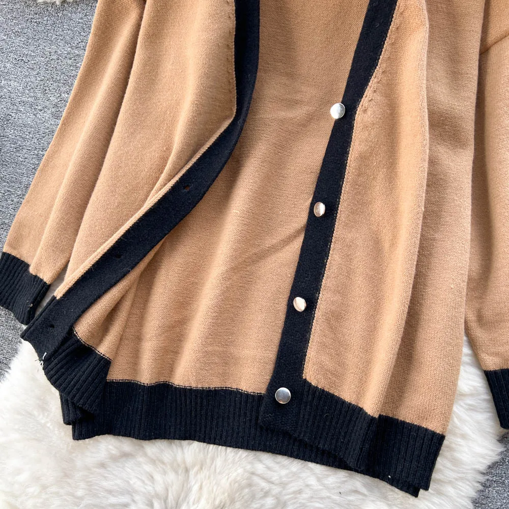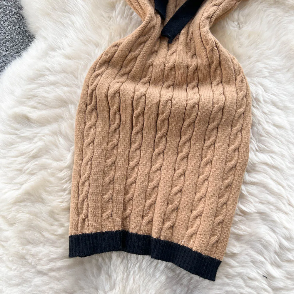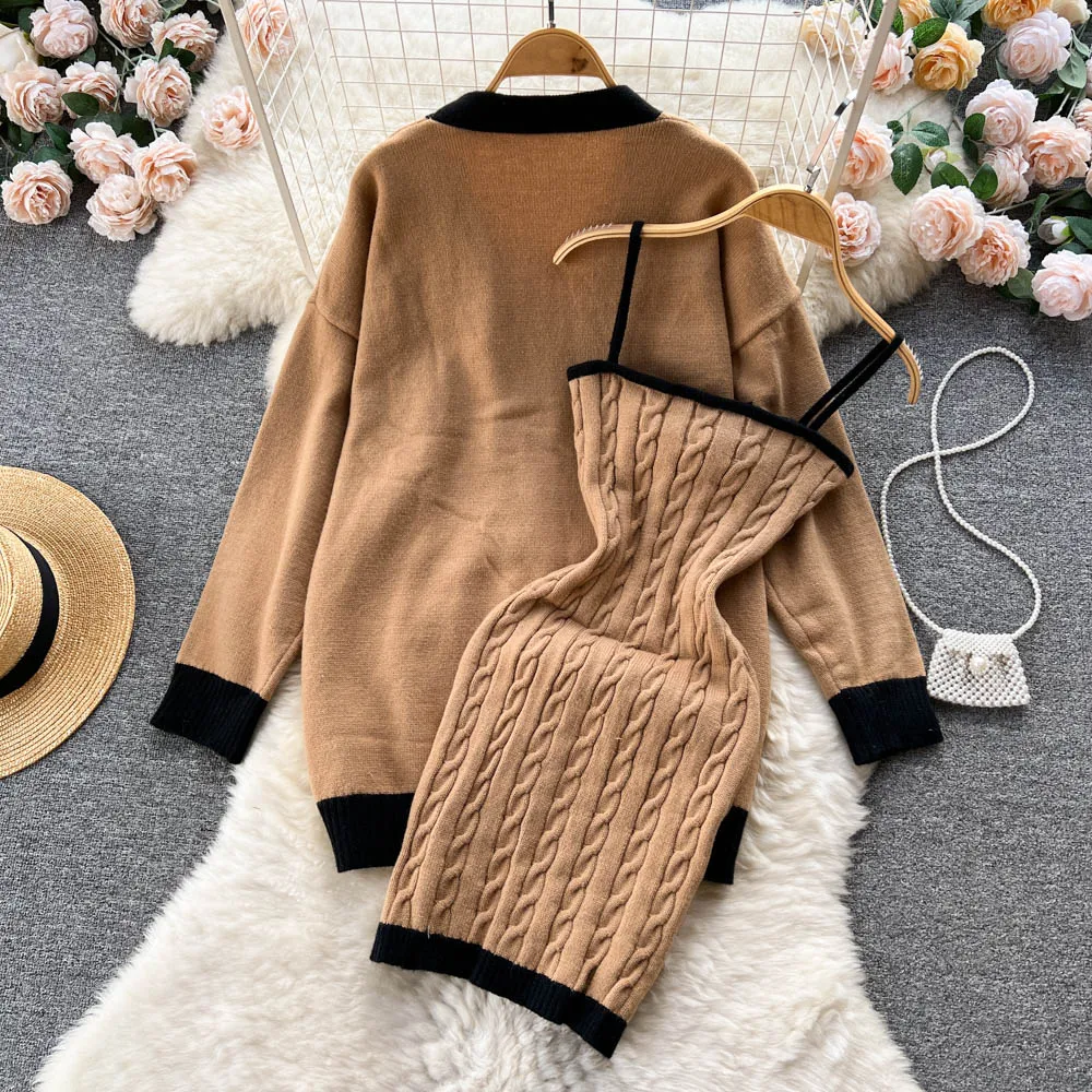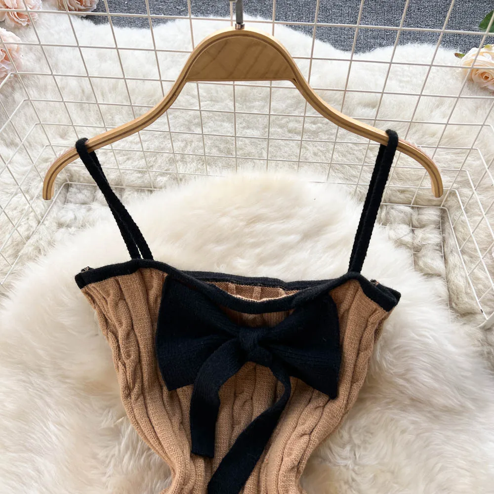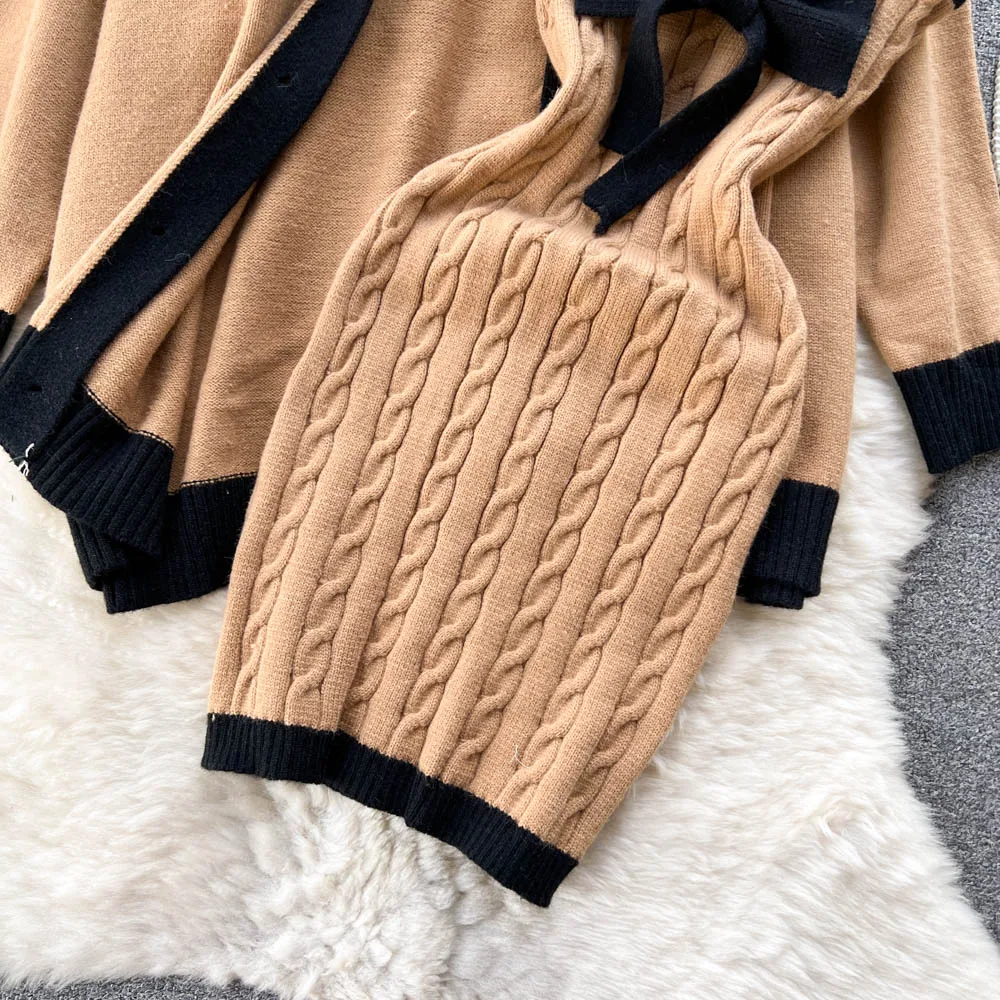 Sweet suit women's bow Fried Dough Twists suspender dress and lazy style knitting cardigan two-piece set