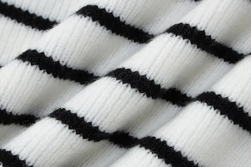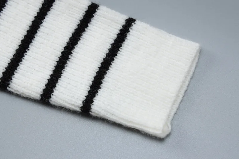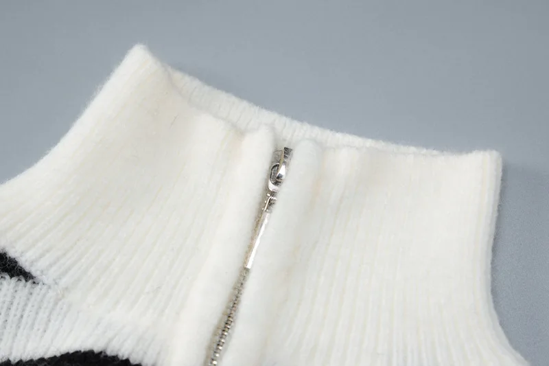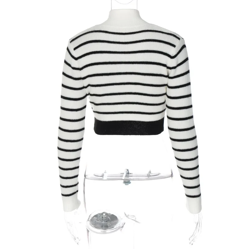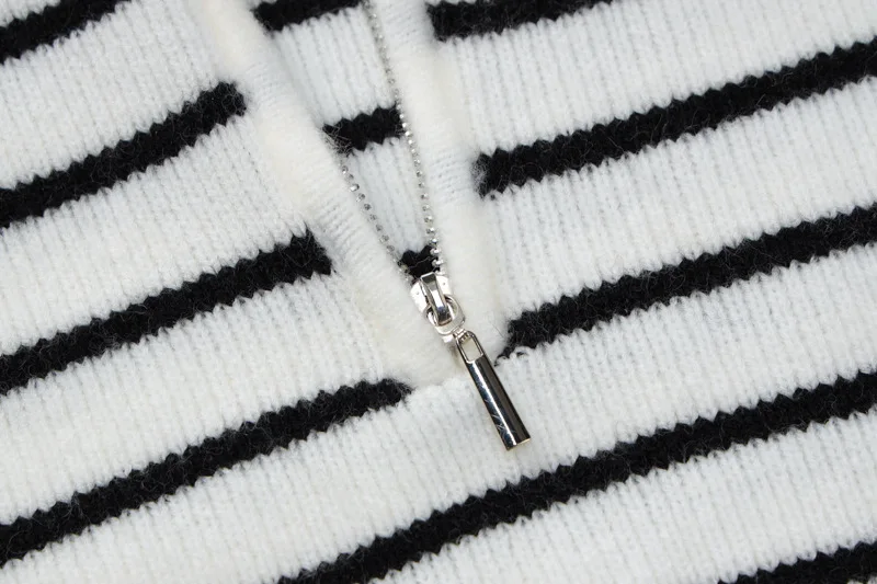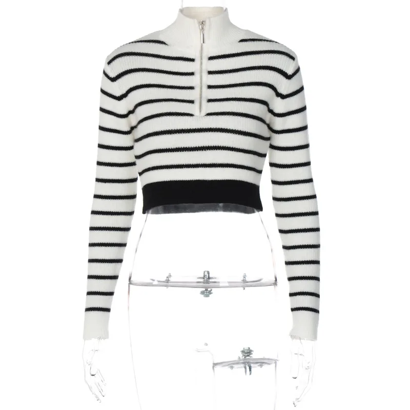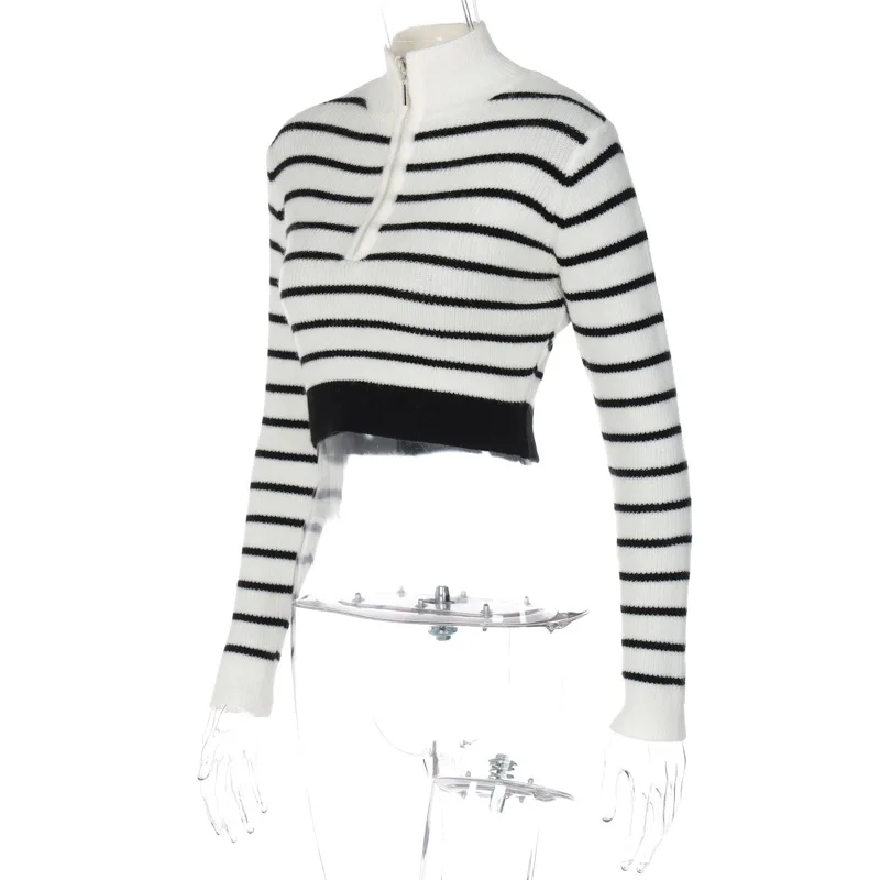 T3813938w Fall New Stylish Women's Striped Sweater Knitting Long Sleeve Zipper Contrast Color Crop Tops For Lady Women