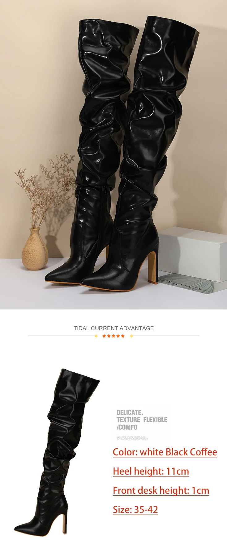 Tallulah Ruched Pointed Toe Block Heel Knee High Long Boot In Black 35-42