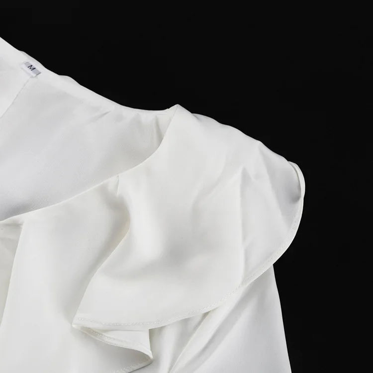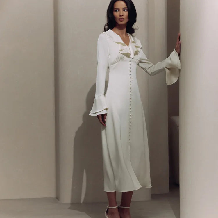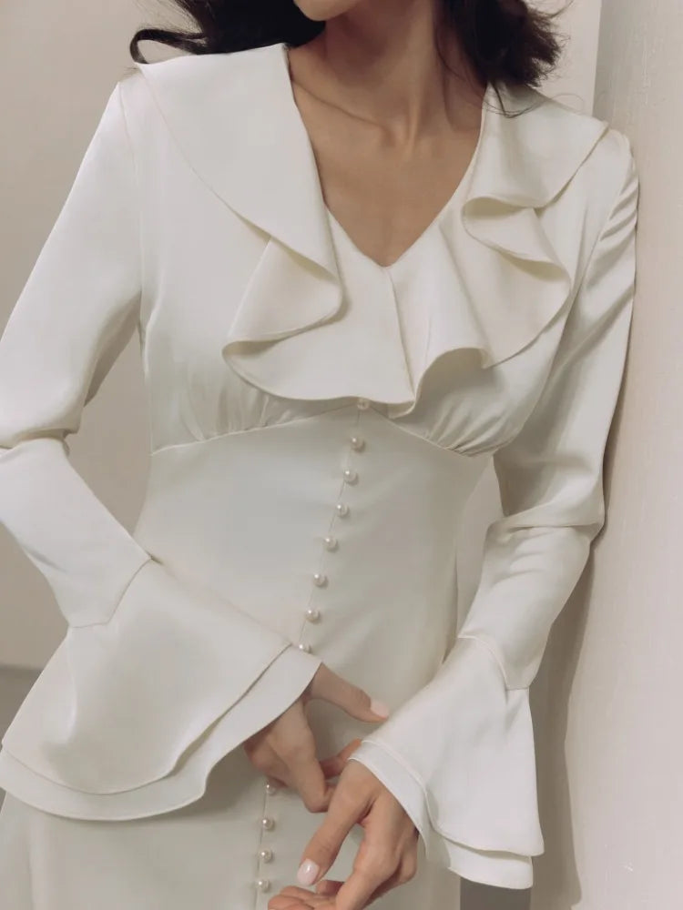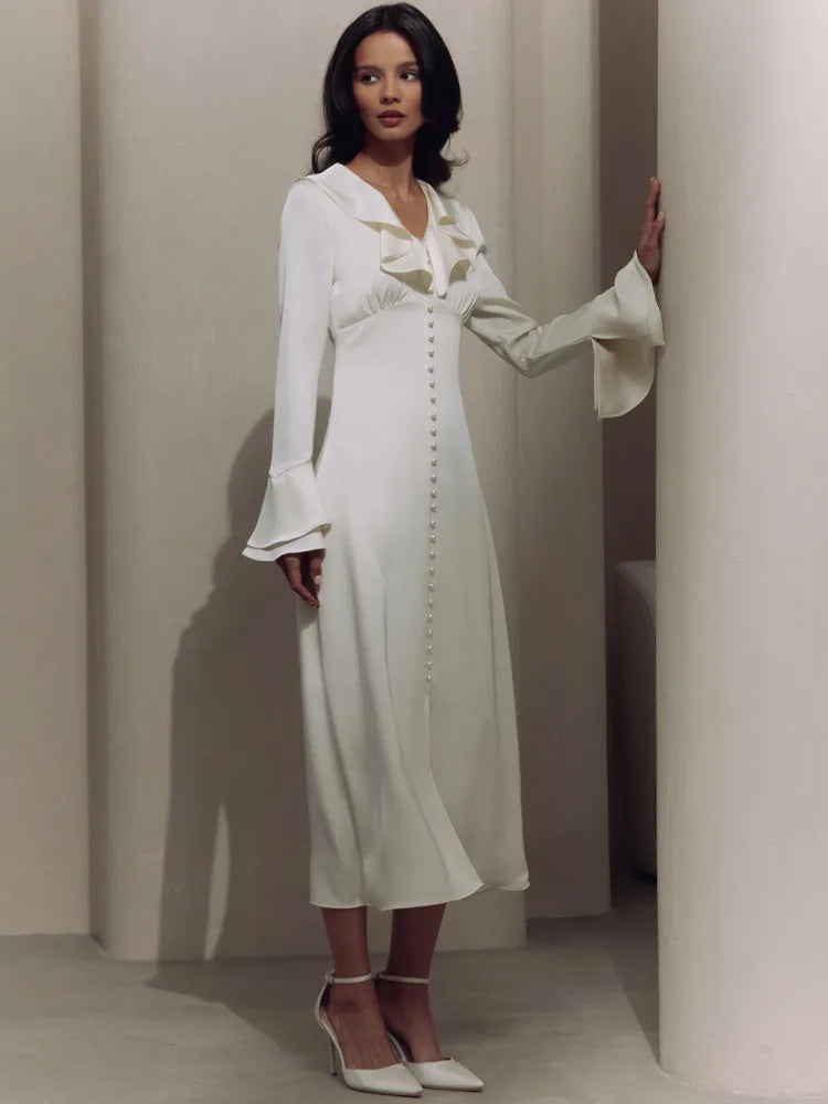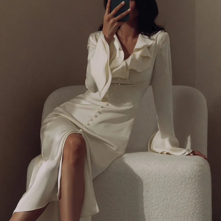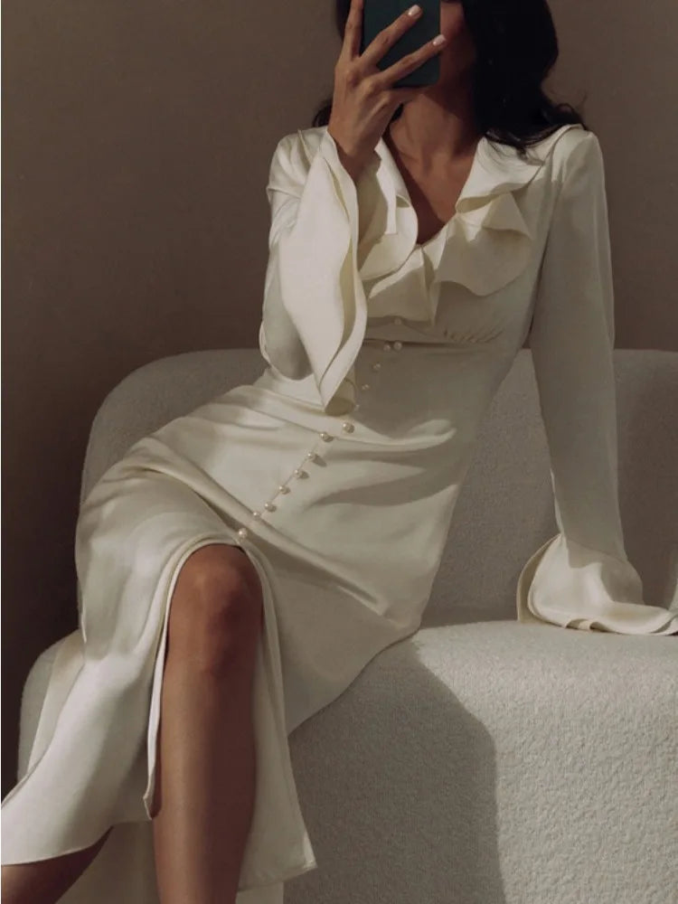 TARUXY Ruffle V Neck Elegant Dress For Women Slim Long Sleeve High Waist Temperament Dresses Femme Party Slit Long Dress Woman