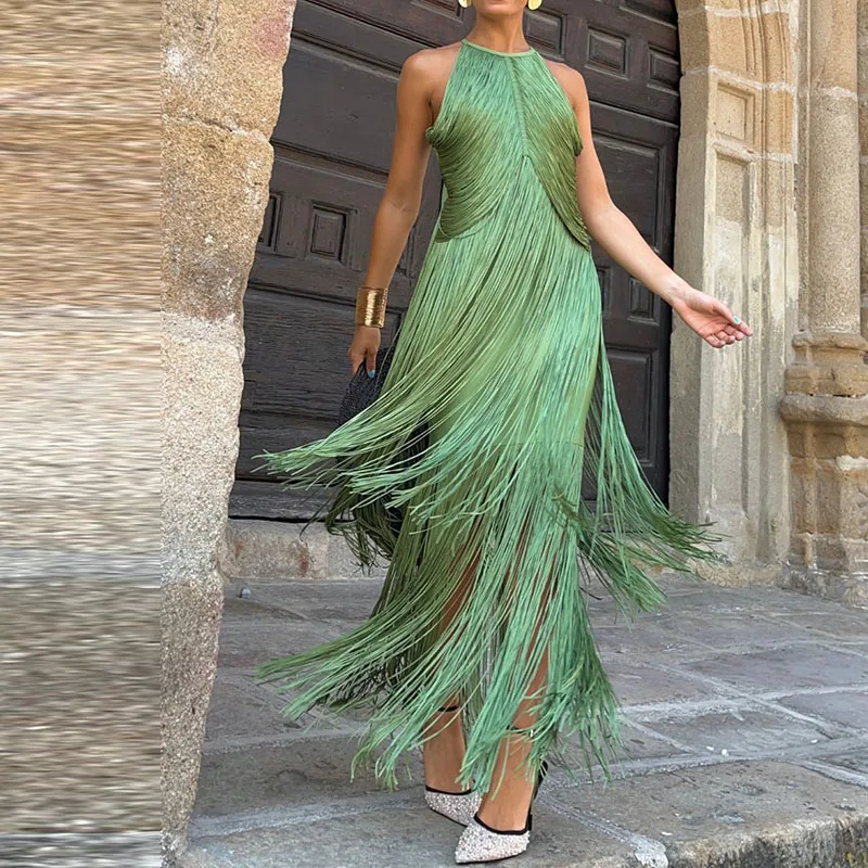Tassel High Waisted Slim Women's Banquet Dress Sexy Hanging Neck Hollow Solid Long Dress Fashion Sleeveless Cocktail Party Dress