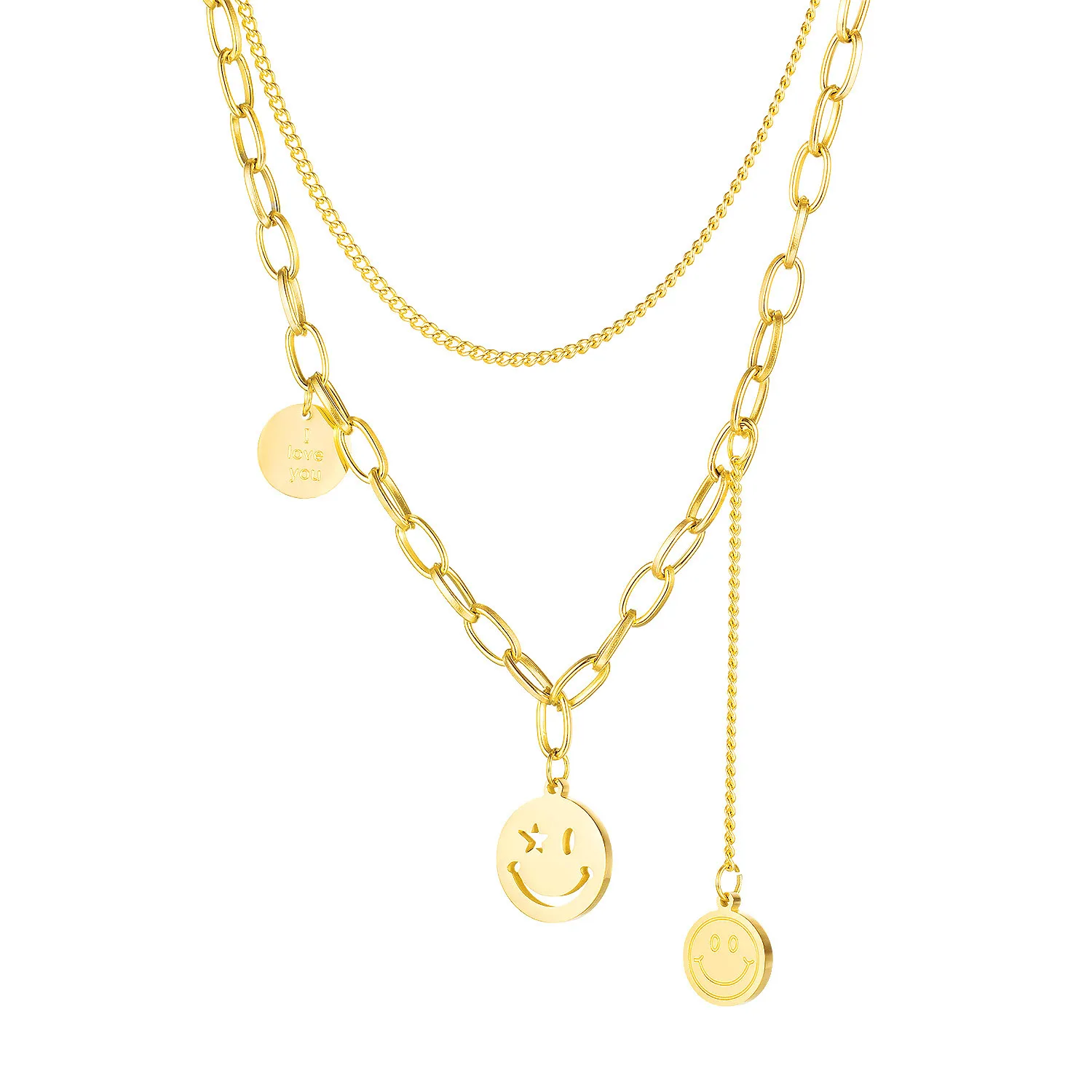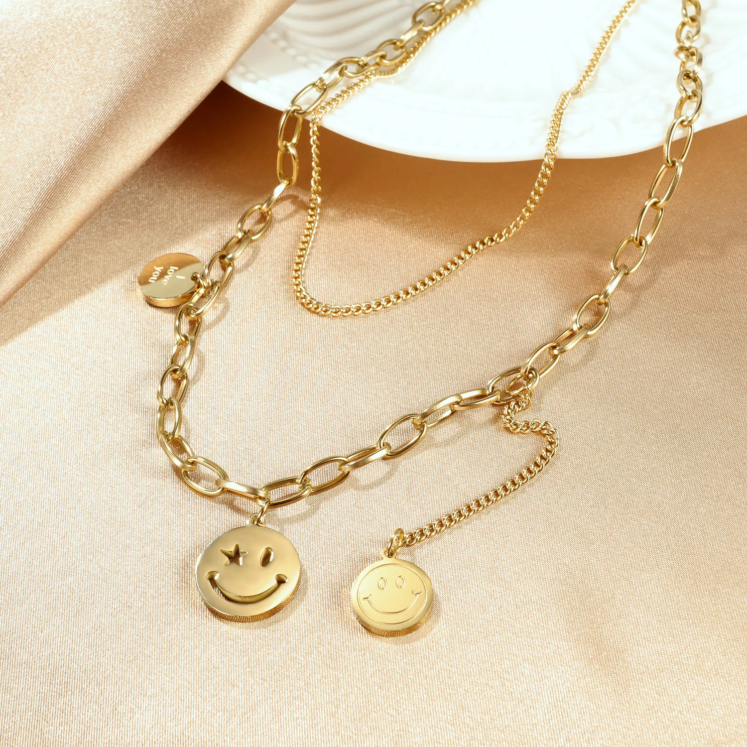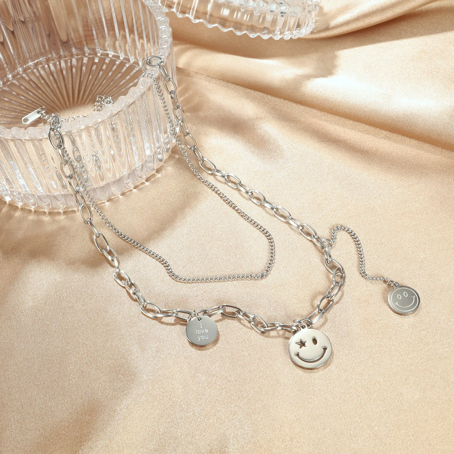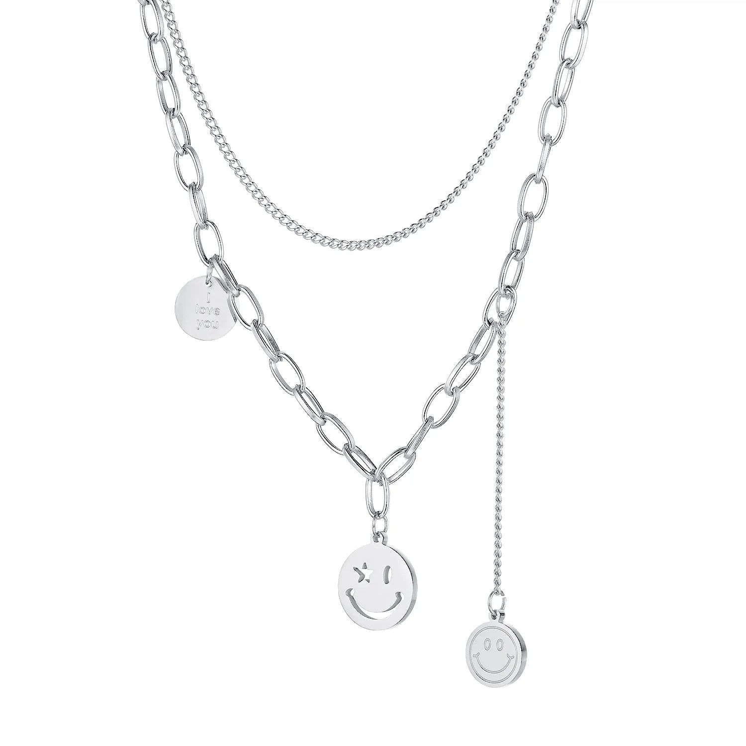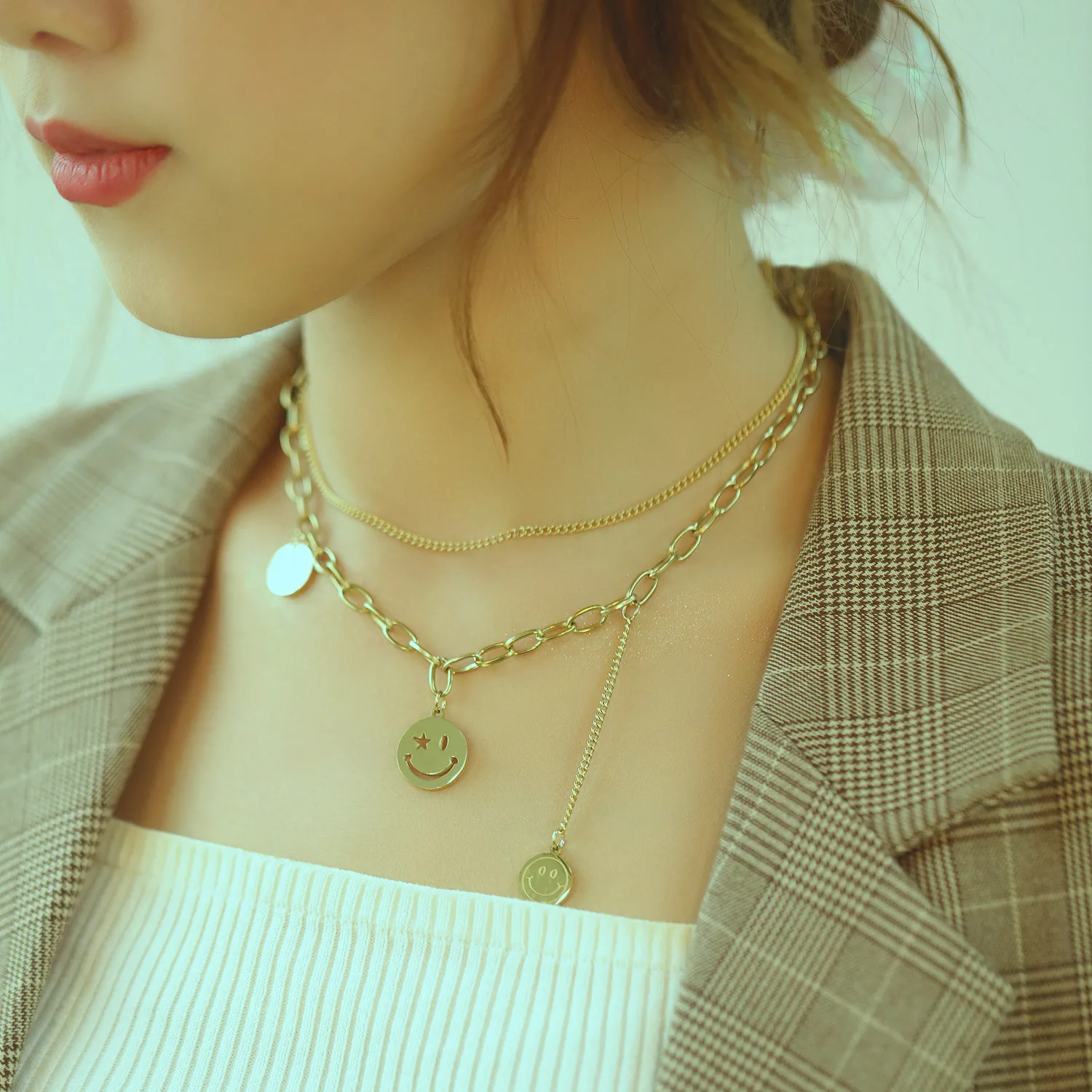 Titanium Steel Round Brand Smiley Face Double-layer Clavicle Chain Women Accessories Gold Color Carton Pendant Necklaces Party