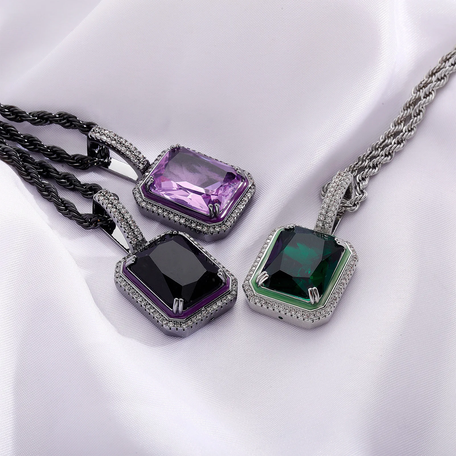 Top Icy Simple Design 18K Gold Plated Luminous Gemstone Pendant Hip Hop Jewelry Square Colorful 5A CZ Gem Pendant Necklace Women