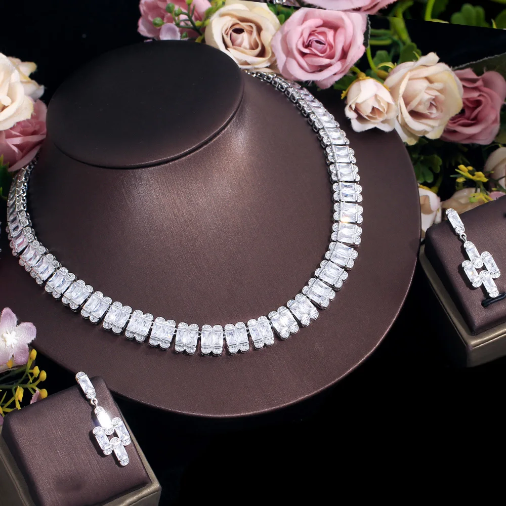 Top Quality White Rectangle Cubic Zirconia Chunky Luxury Tennis Bridal Wedding Party Choker Necklace Jewelry Sets for Women