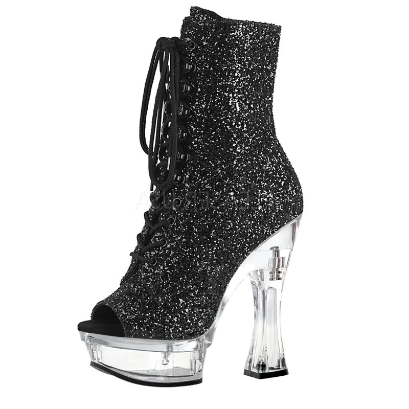 Transparent crystal thick heel 14cm shiny pink black lace up high heels fashion short boots bare boots