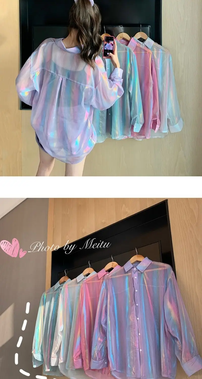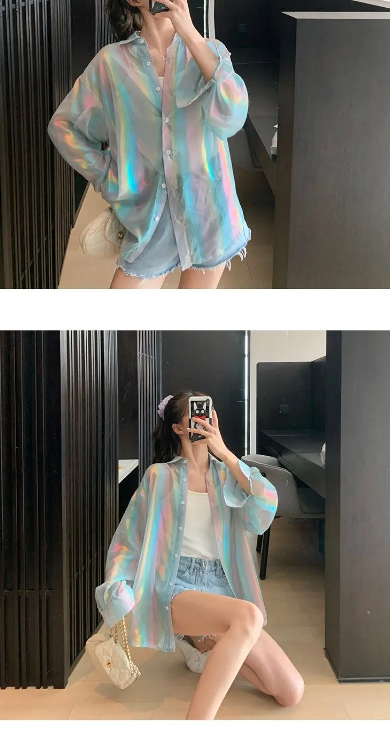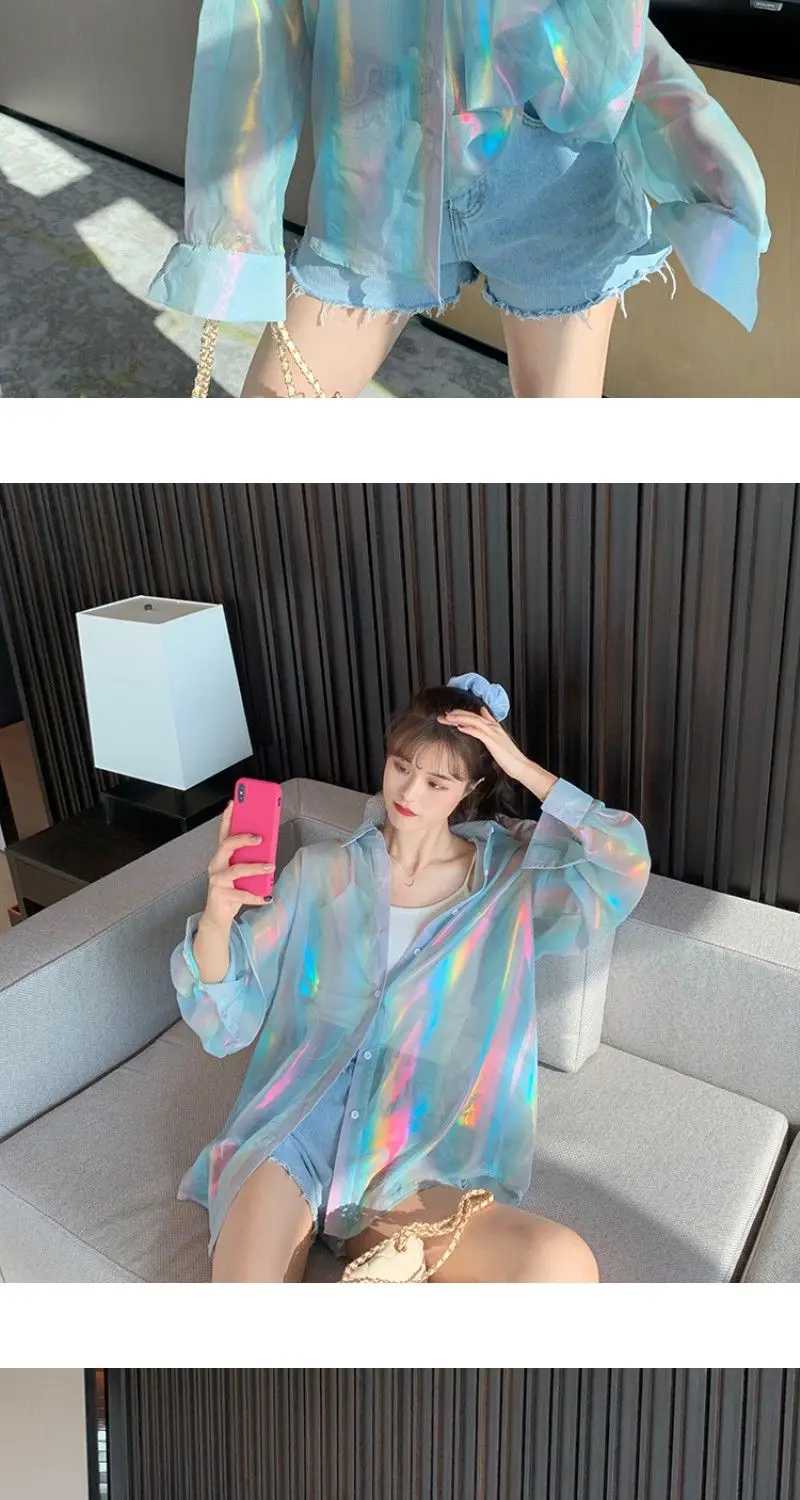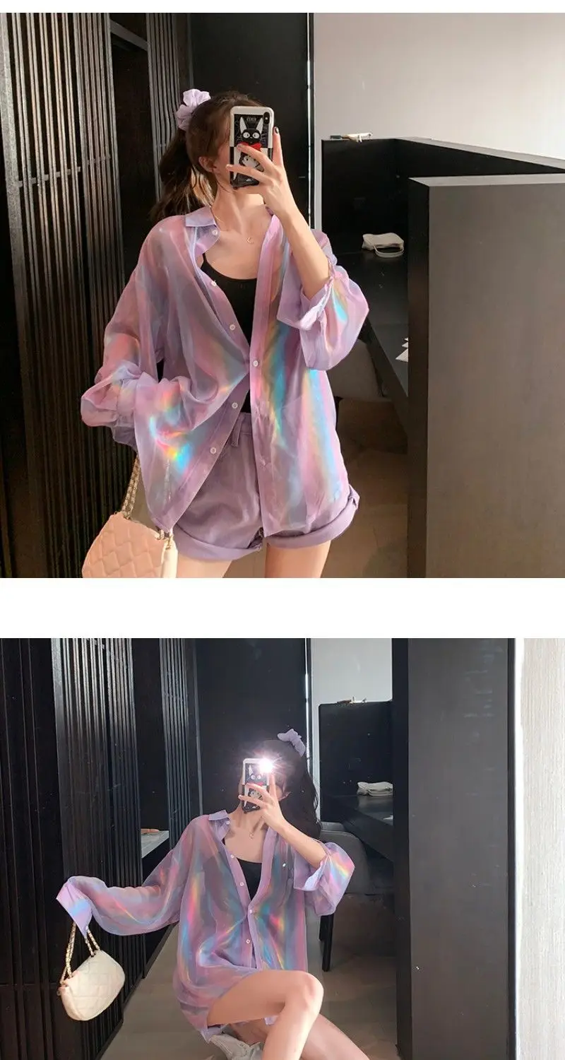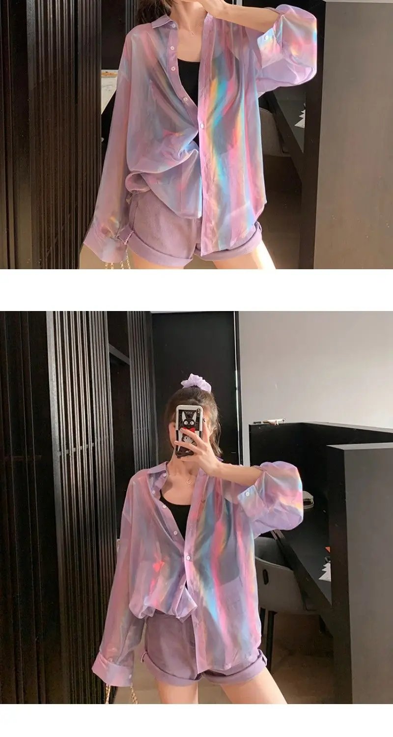 Transparent Shirt Women Beautiful Blouse Sheer Top Ladies Korean Style 2022 Summer Oversized Sun-proof Kawaii Ulzzang
