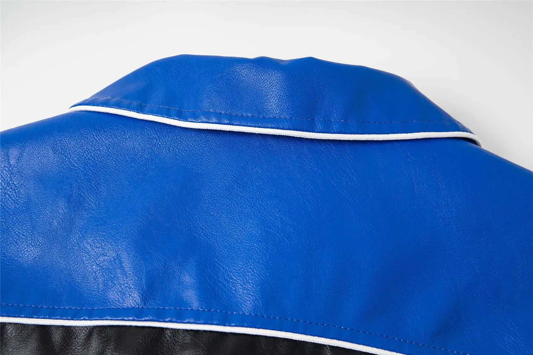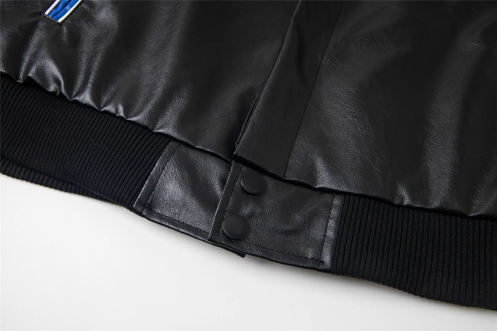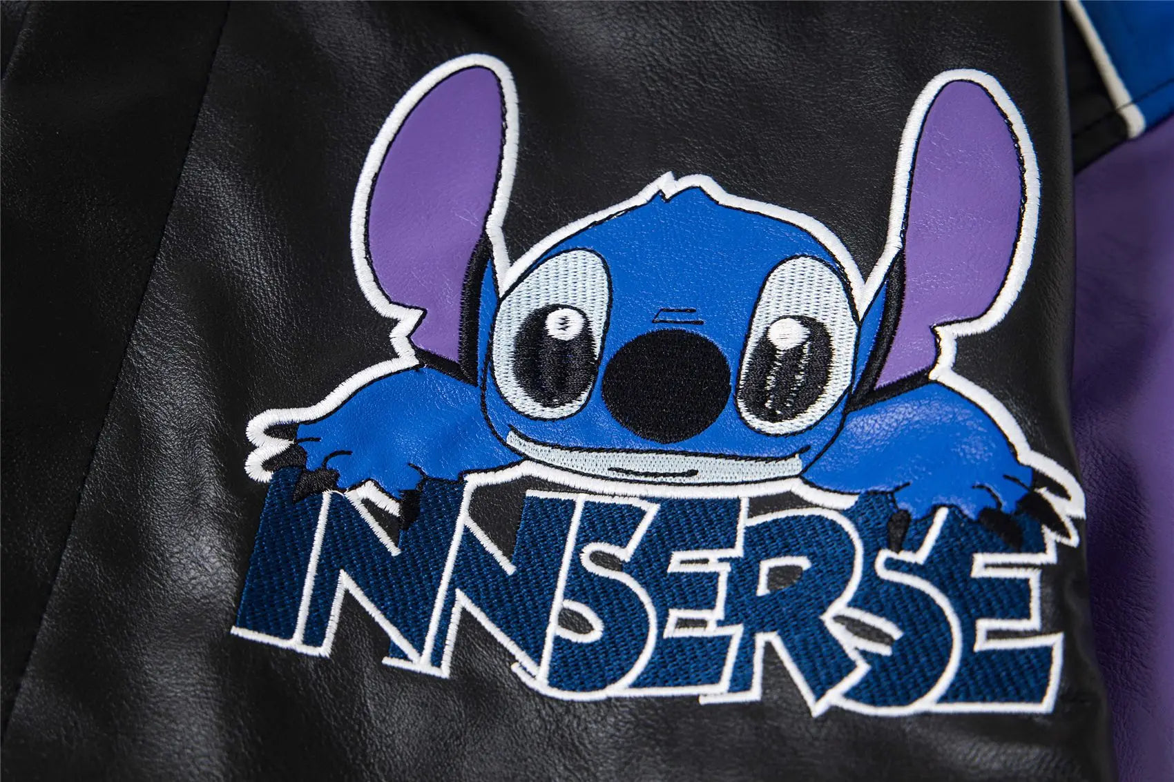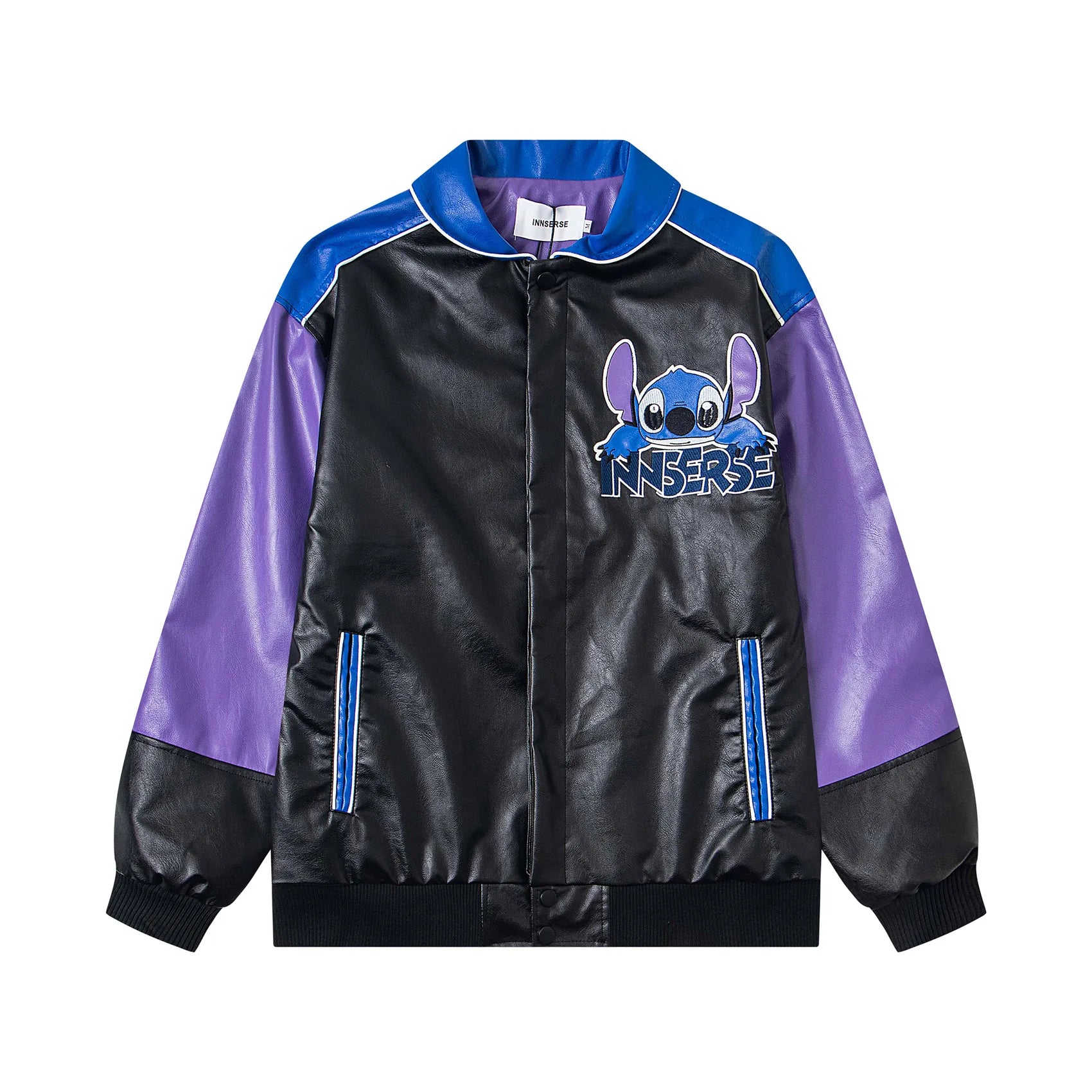 Trendy Cartoon Embroidery Color-Block Stand Collar Jacket Coat for Men and Women Autumn Winter Loose Casual Leather Jacket Coat