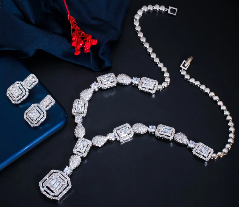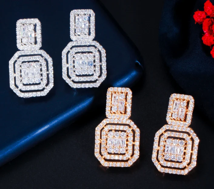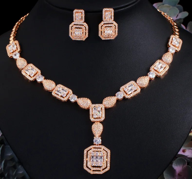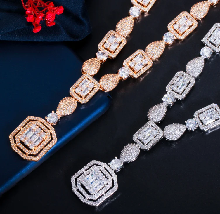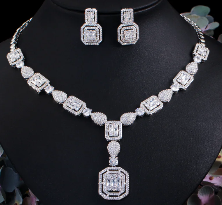 trendy clear gold plated square zircon necklace and earring bridal jewelry set