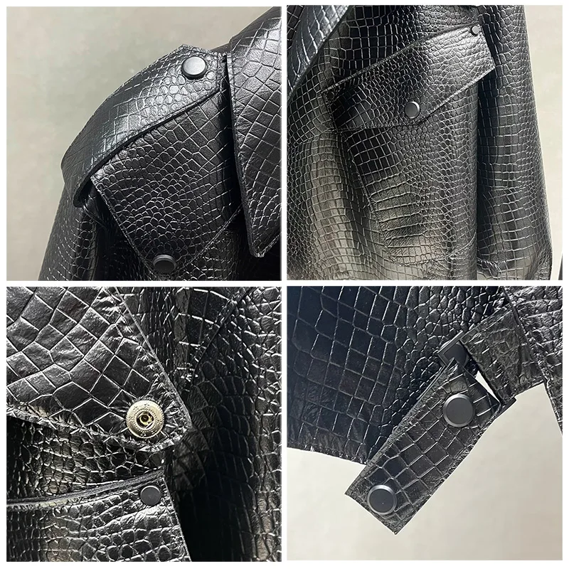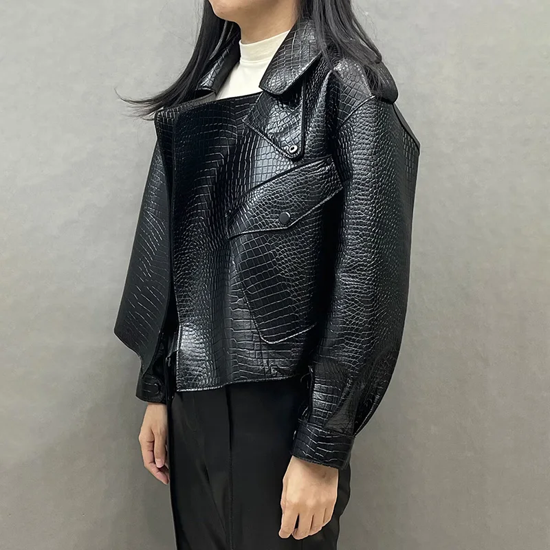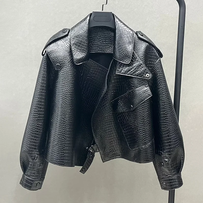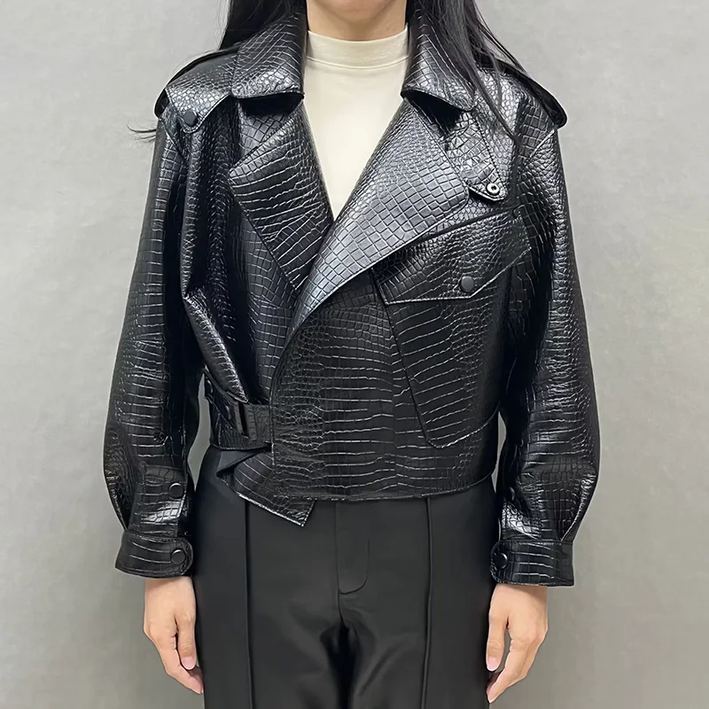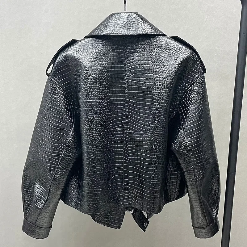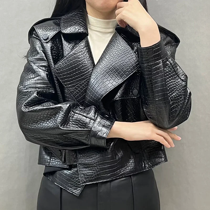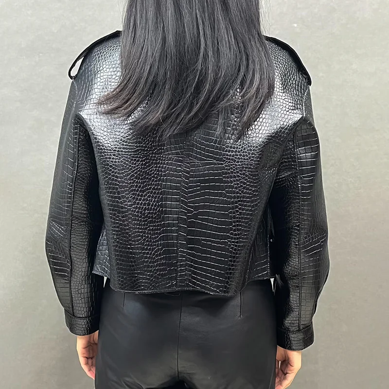 Trendy Crocodile Print Genuine Sheepskin Leather Jacket Black Motorcycle Leather Jacket Women