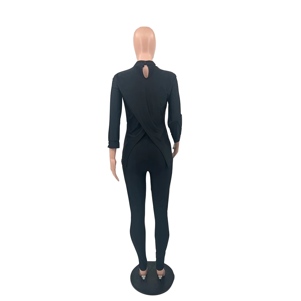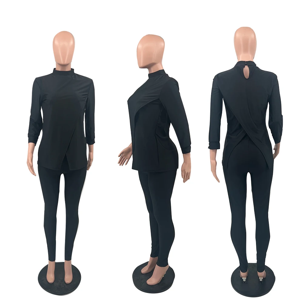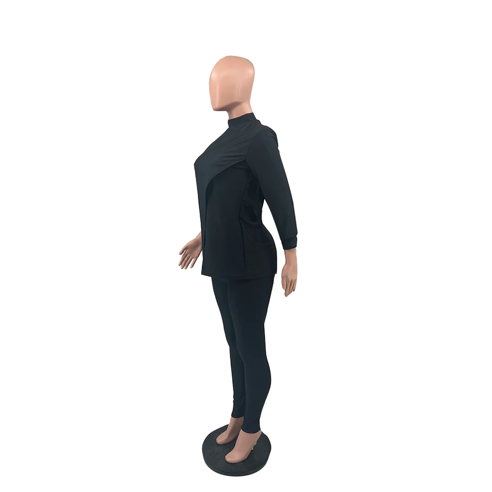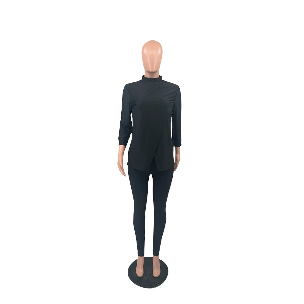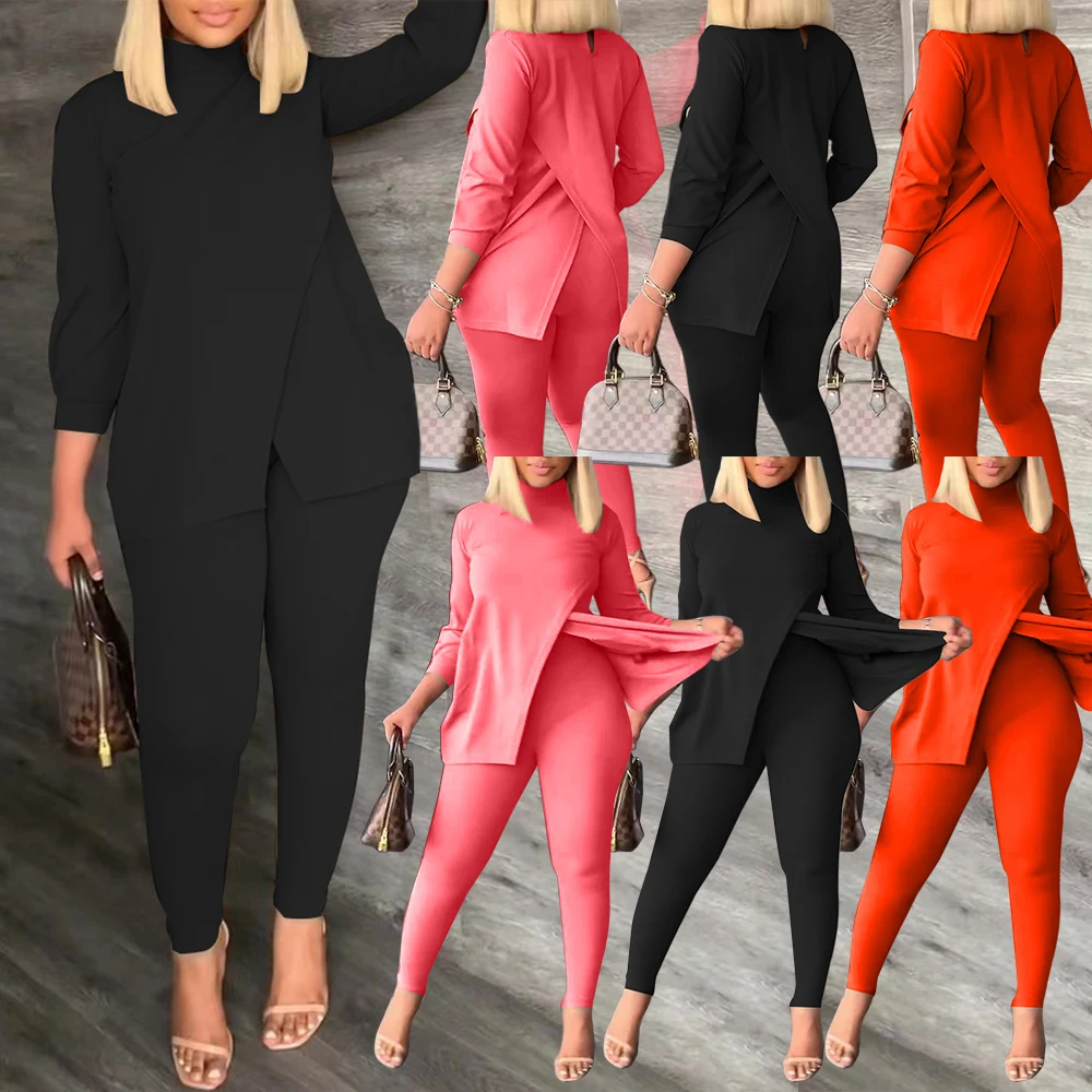 Trendy Women Clothes Casual Daily Solid Slit Turtleneck Long Sleeve Two Pieces Matching Sets