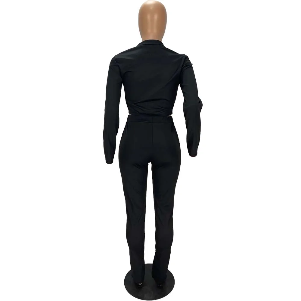 Trendy Women Clothes Fashionable Casual Turn down Neck Zip Up Top & Slits Trousers