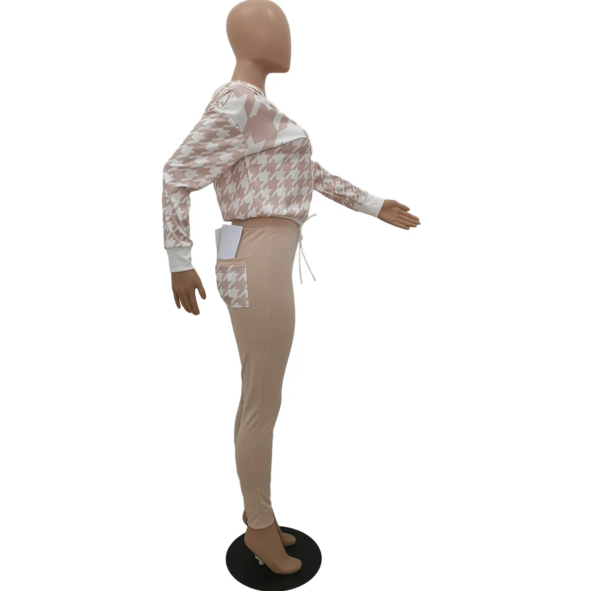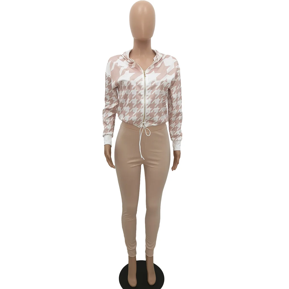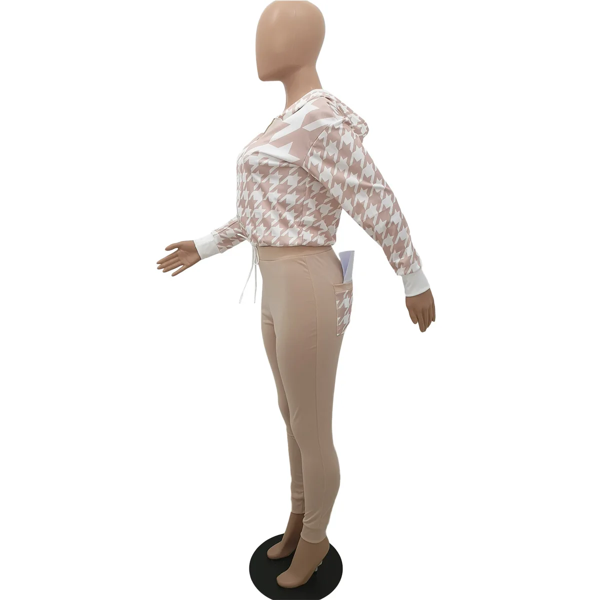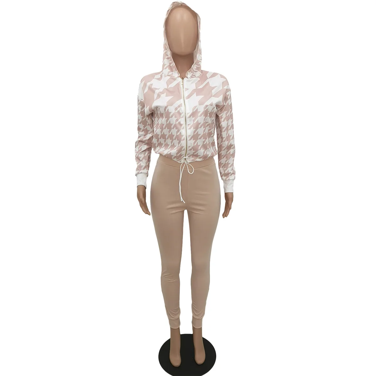 Trendy Women Clothes Houndstooth Print Hooded Long Sleeve Pant Two Piece Set