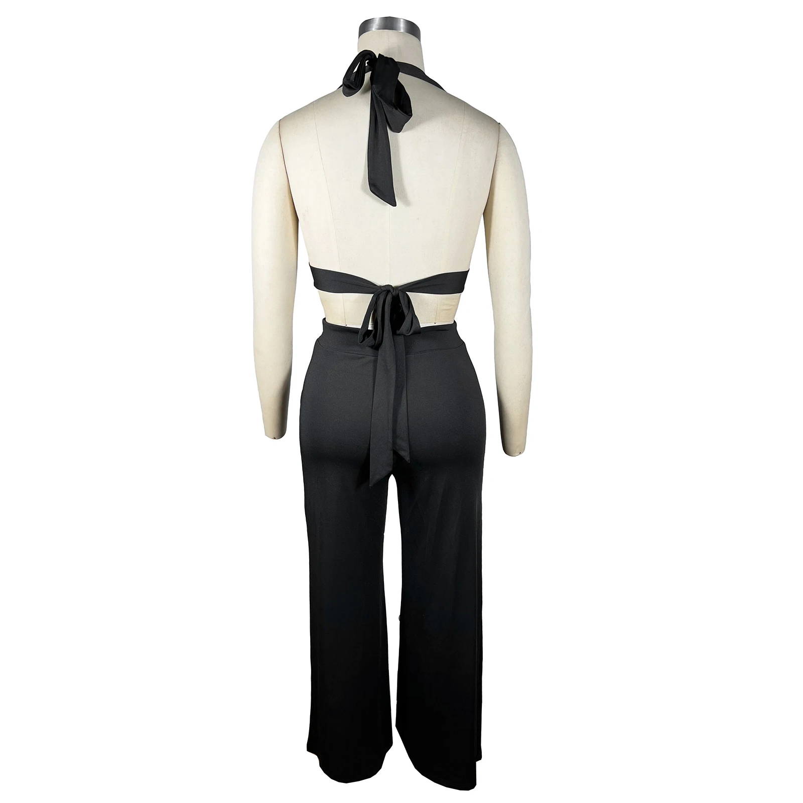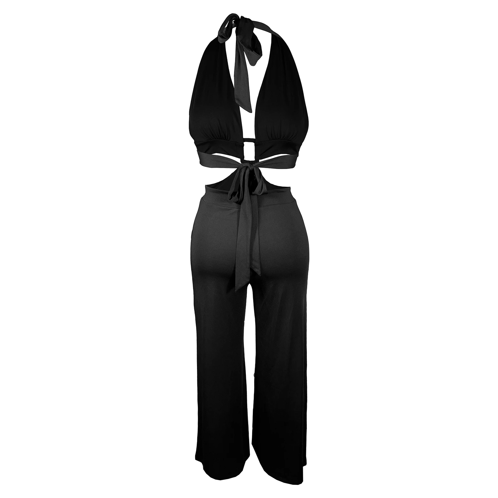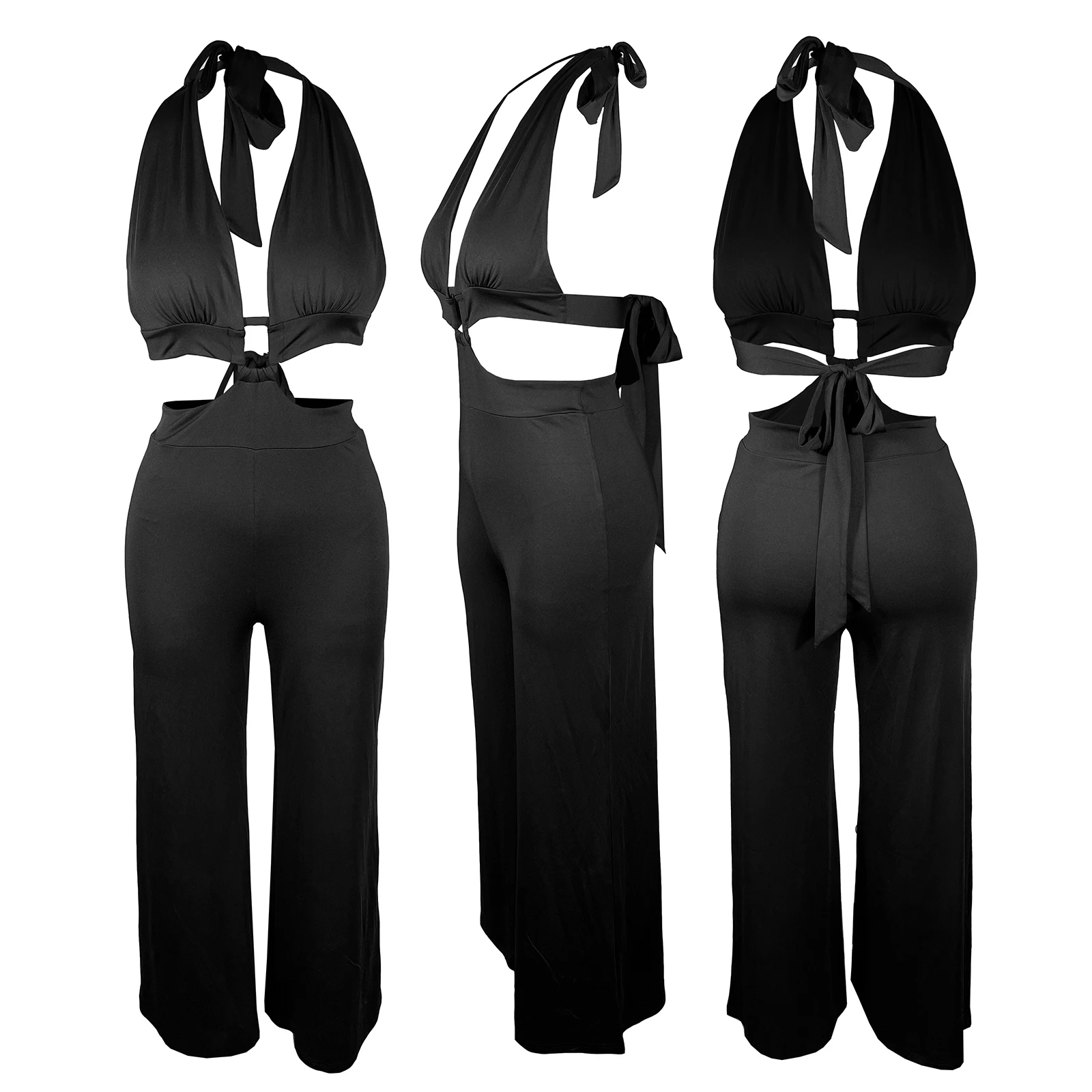 Trendy Women Clothes Solid Color Bandage Halter Backless Wide-leg Jumpsuit