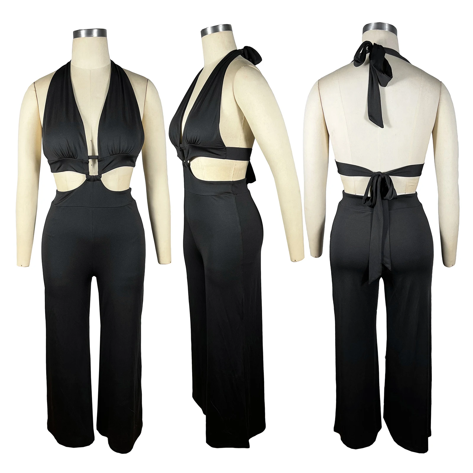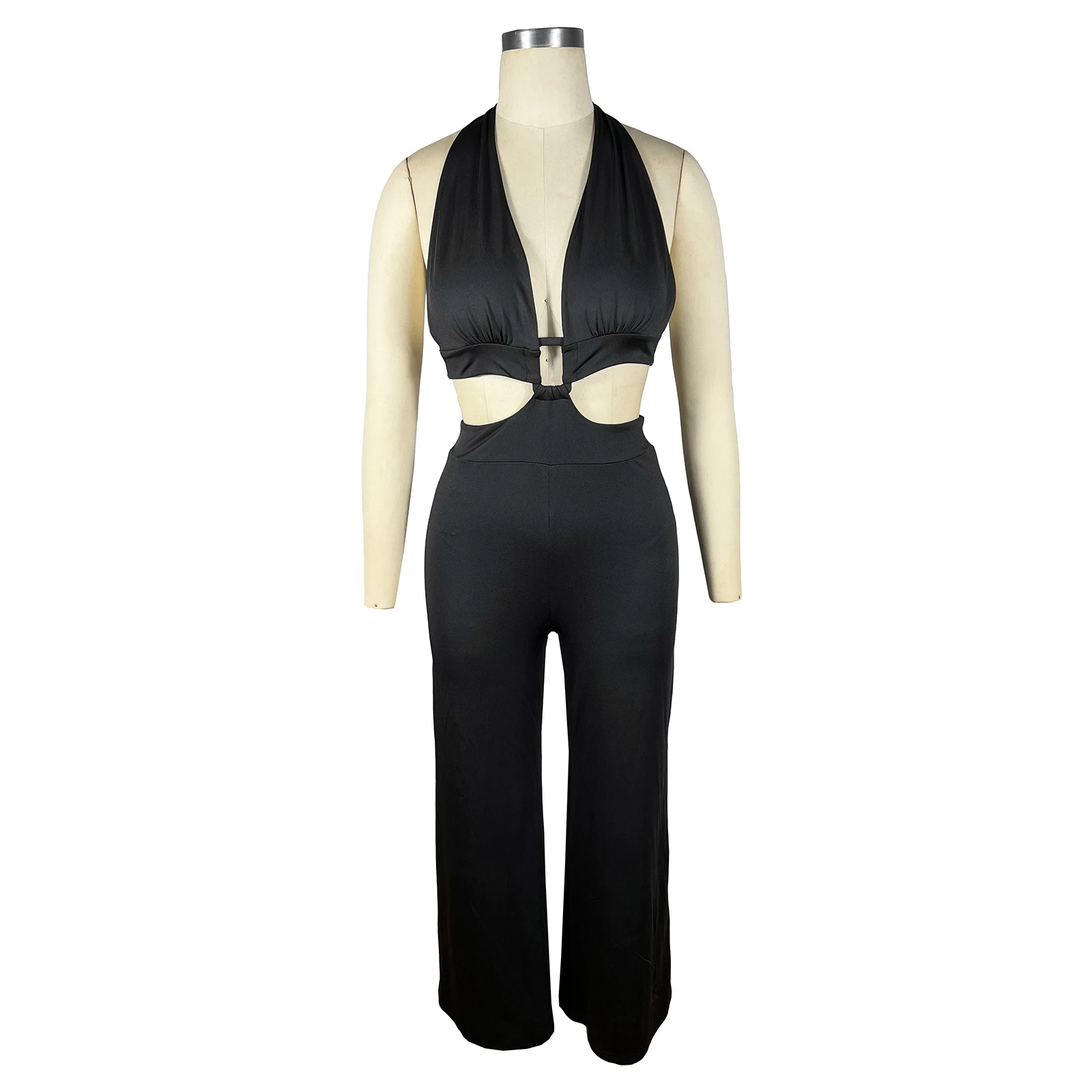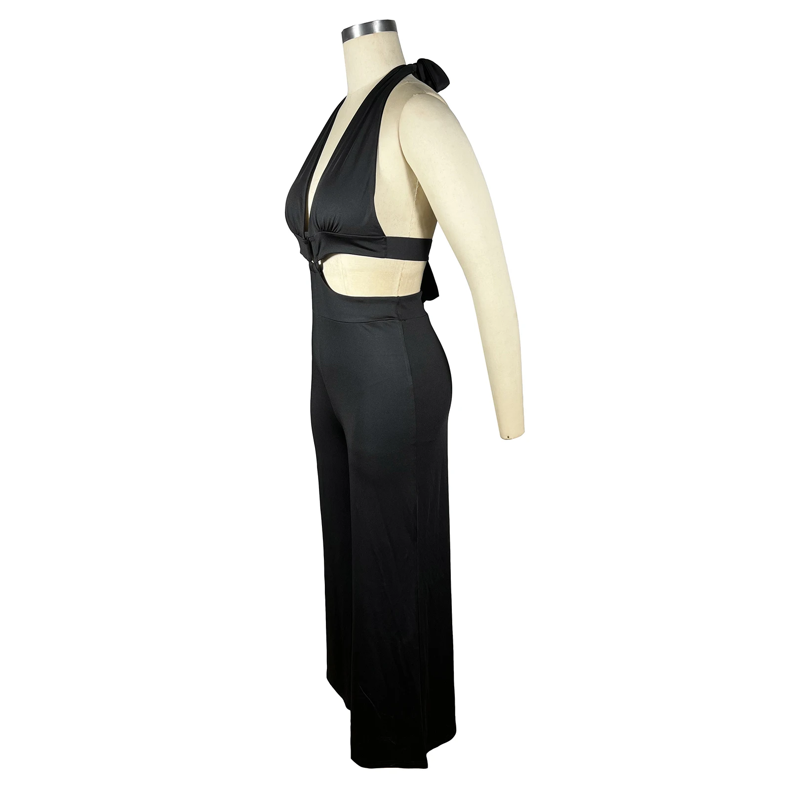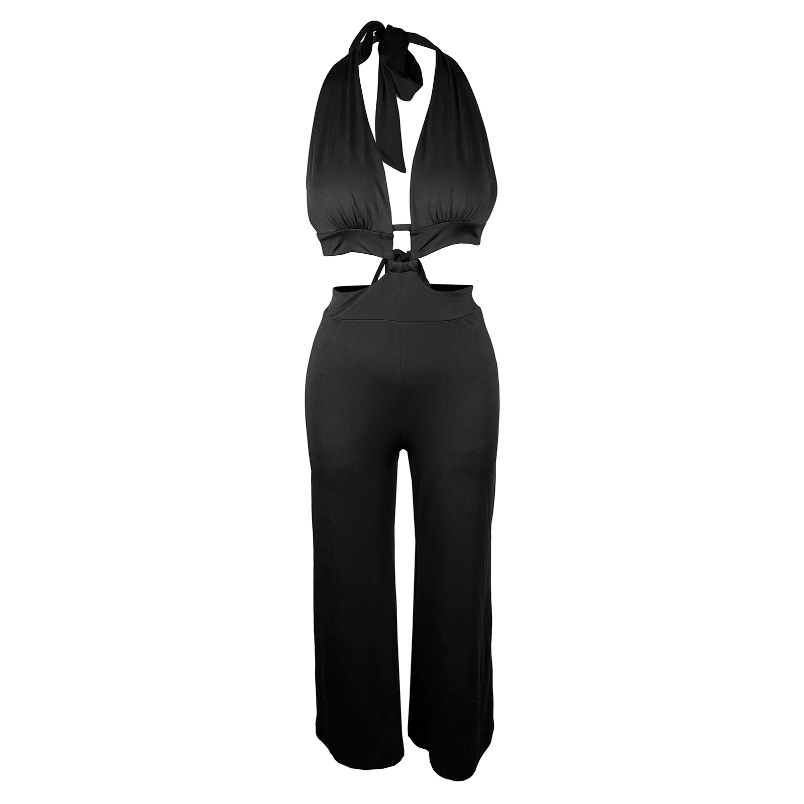 Trendy Women Clothes Solid Color Bandage Halter Backless Wide-leg Jumpsuit
