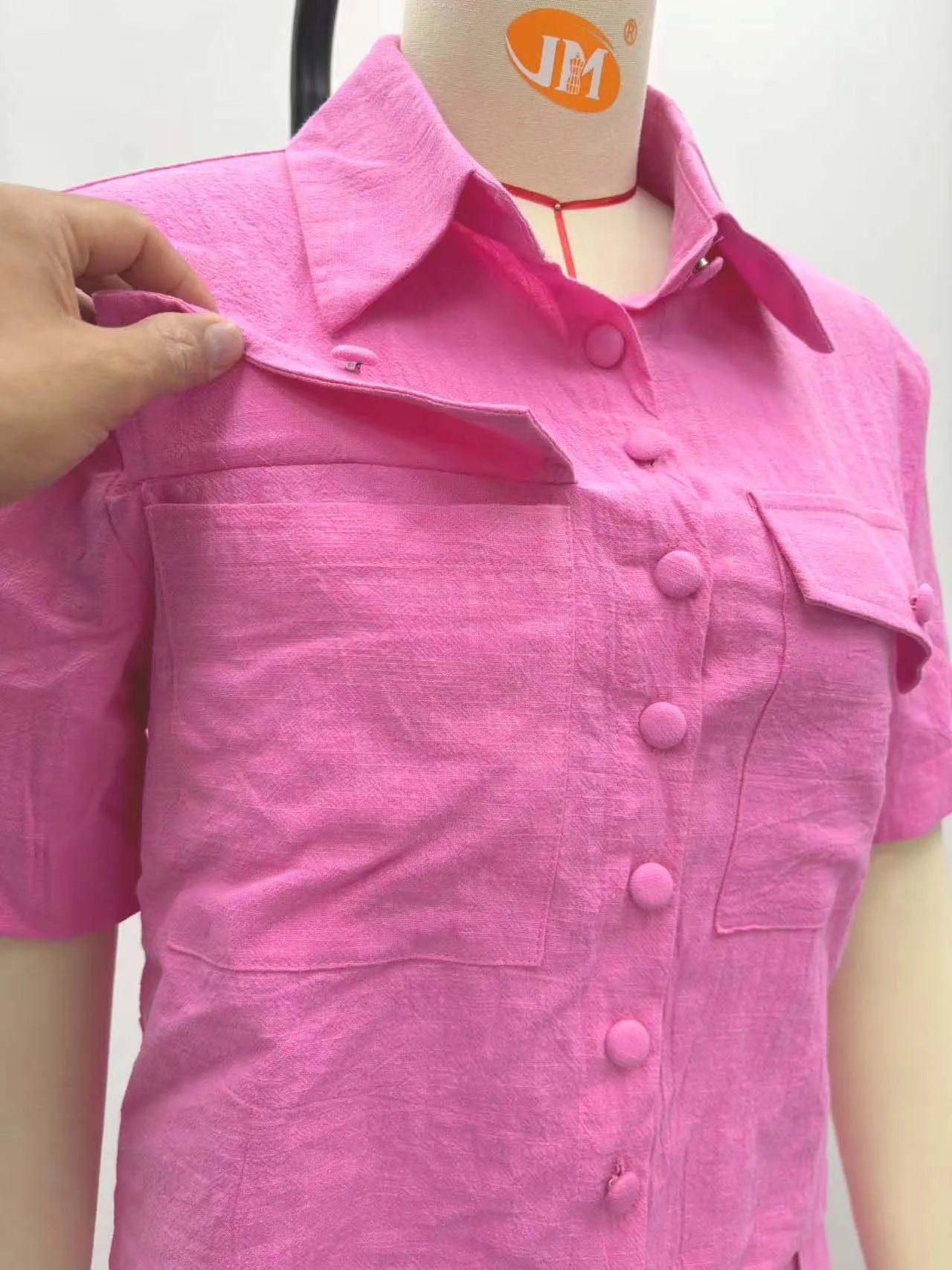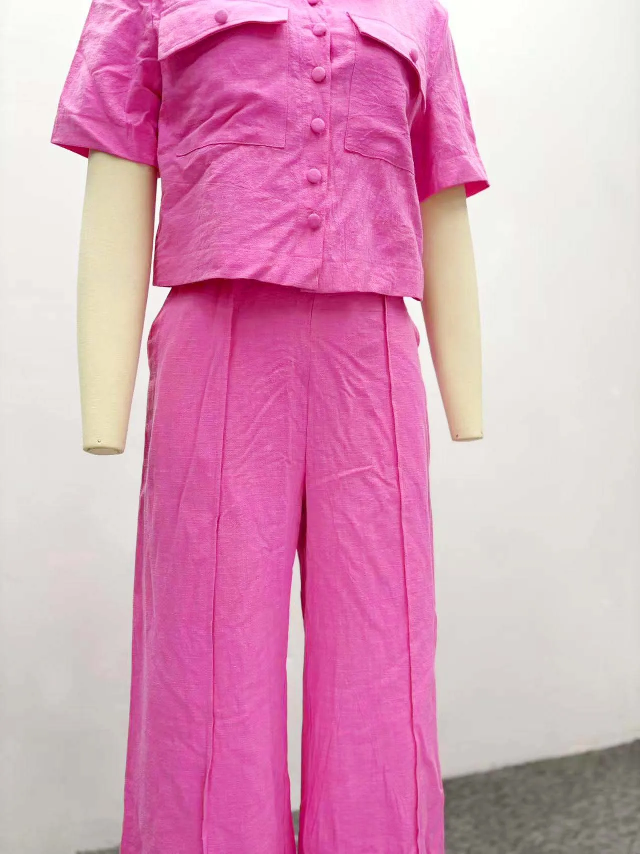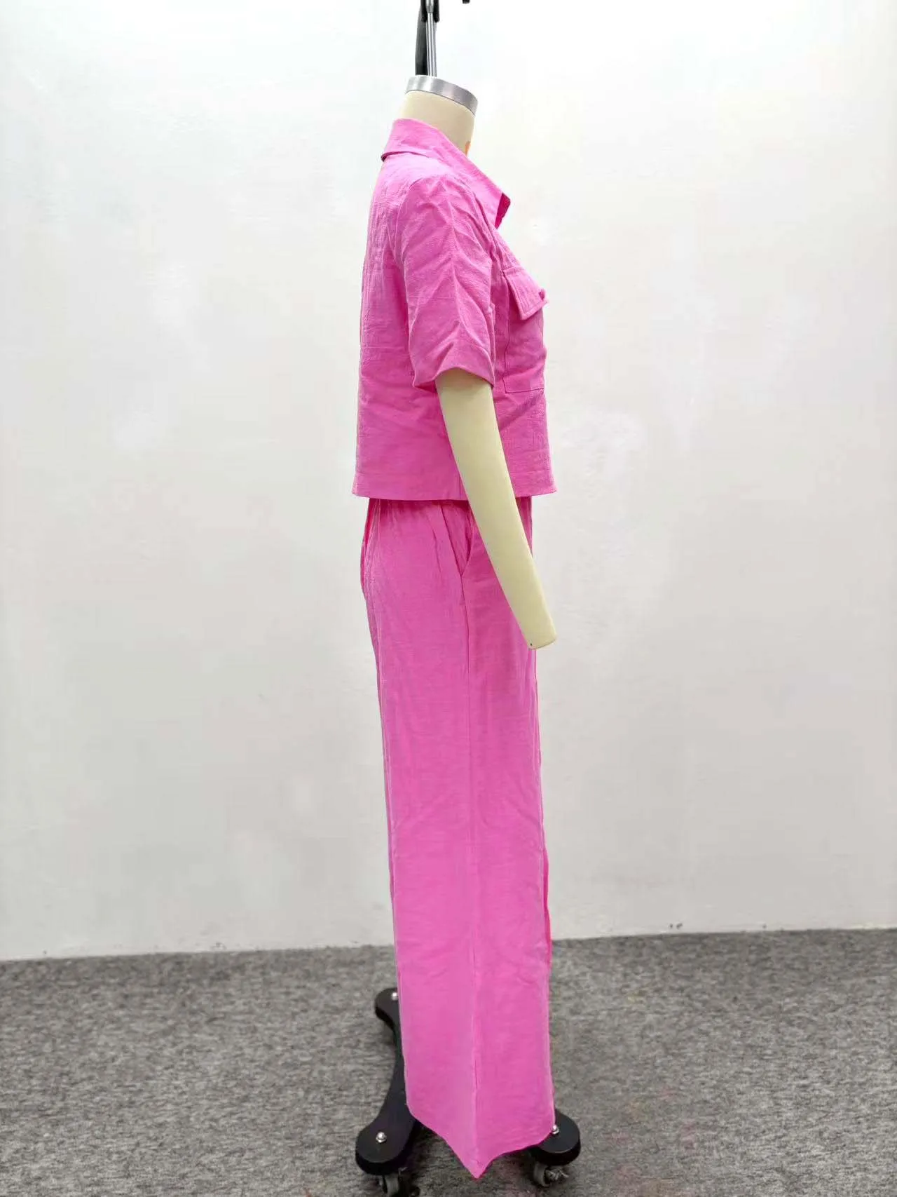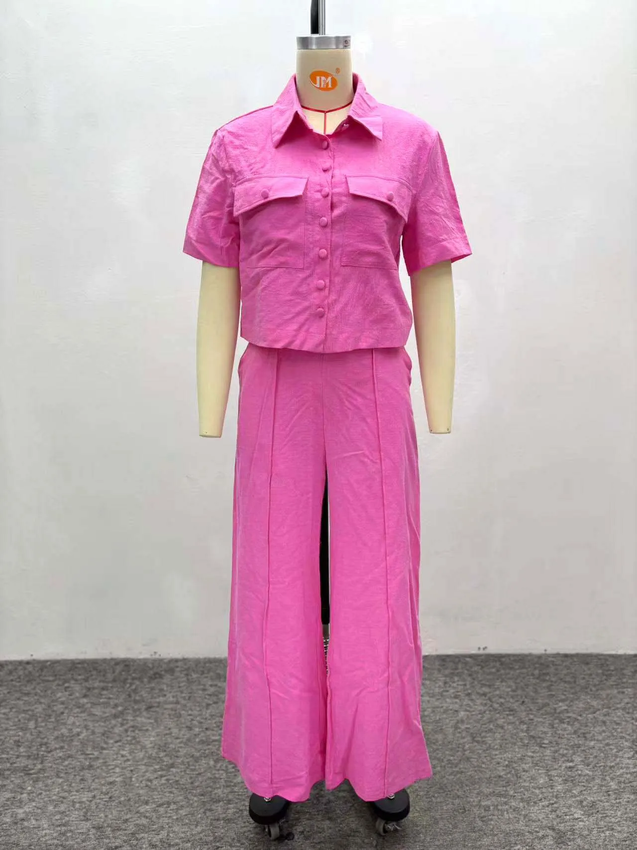 Two Pieces Women Pant Sets Solid Matching Sets Pocket Button Short Sleeve Top Empire Waist Wide Leg Pants Loose Fit 2025 Summer