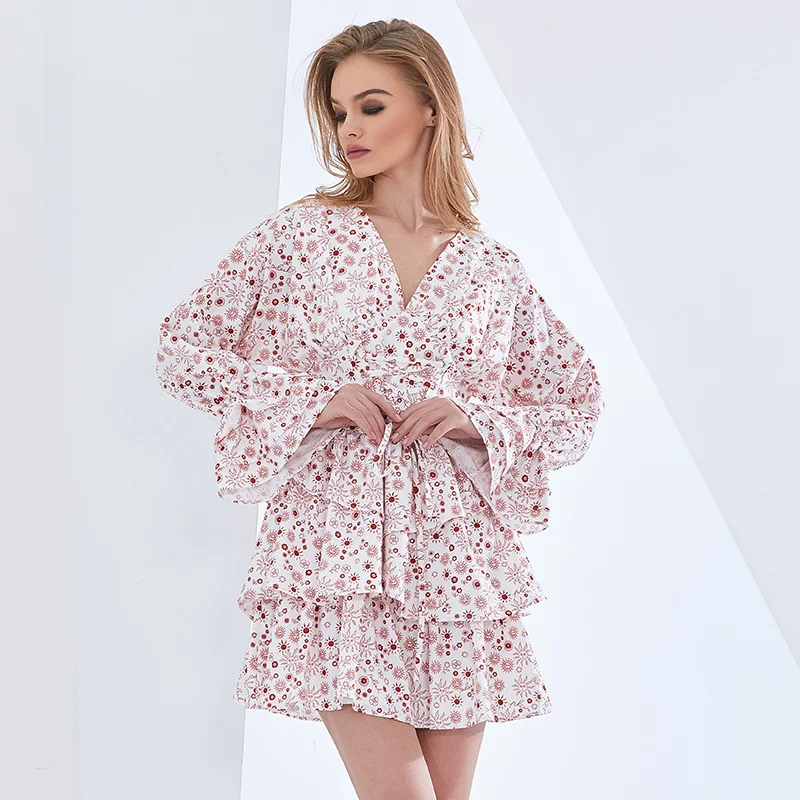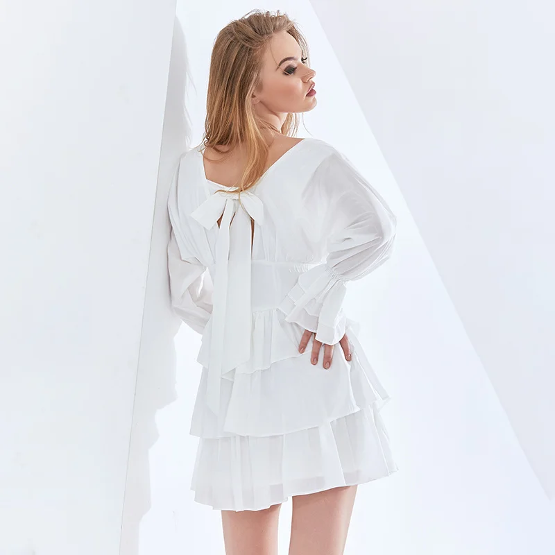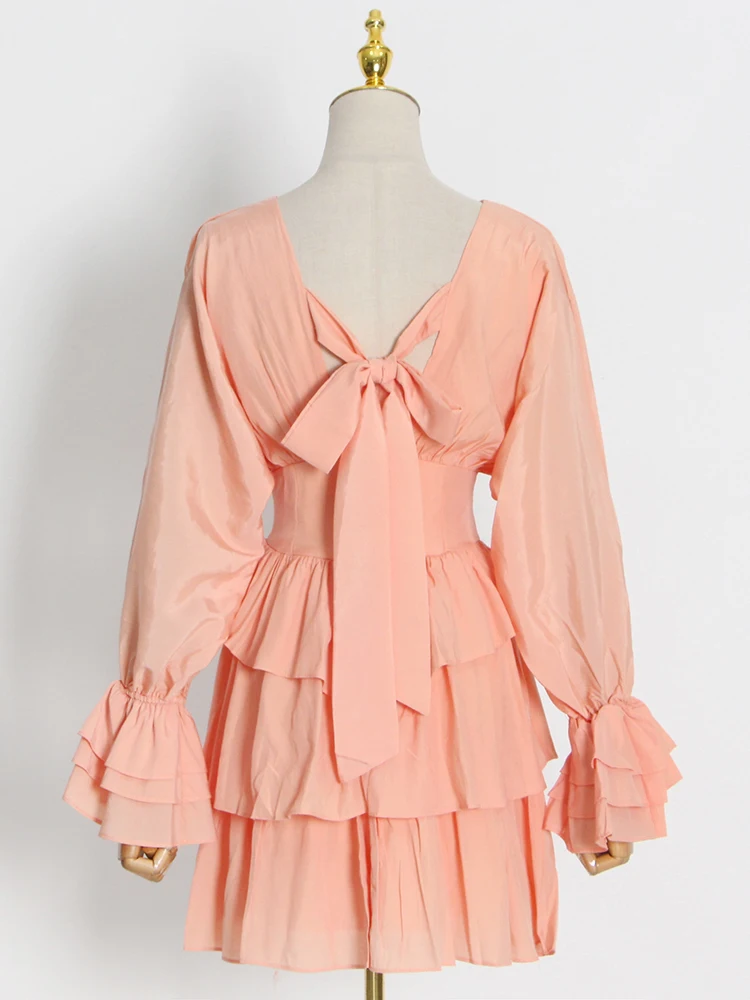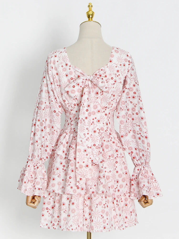 TWOTWINSTYLE Backless Bowknot Print Dress For Women V Neck Long Sleeve High Waist Patchwork Dresses