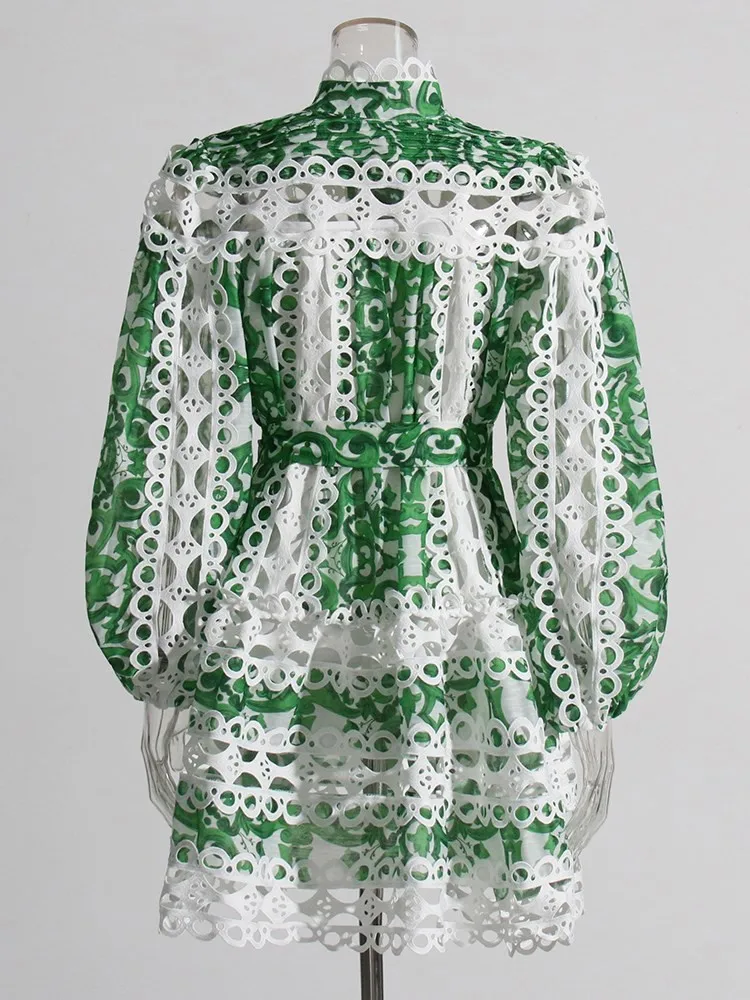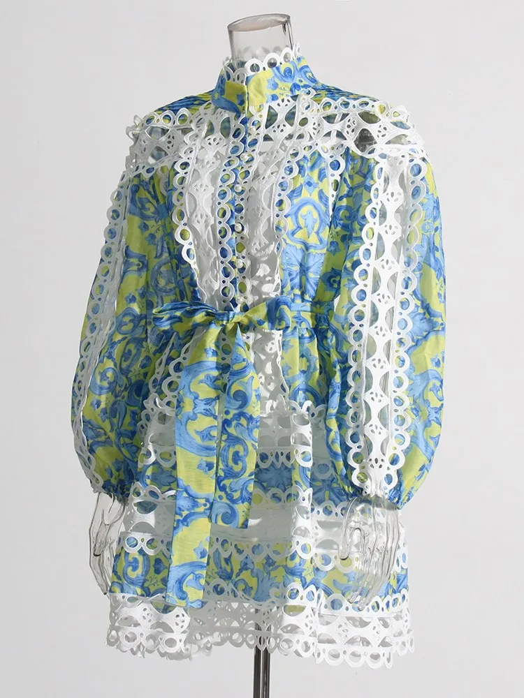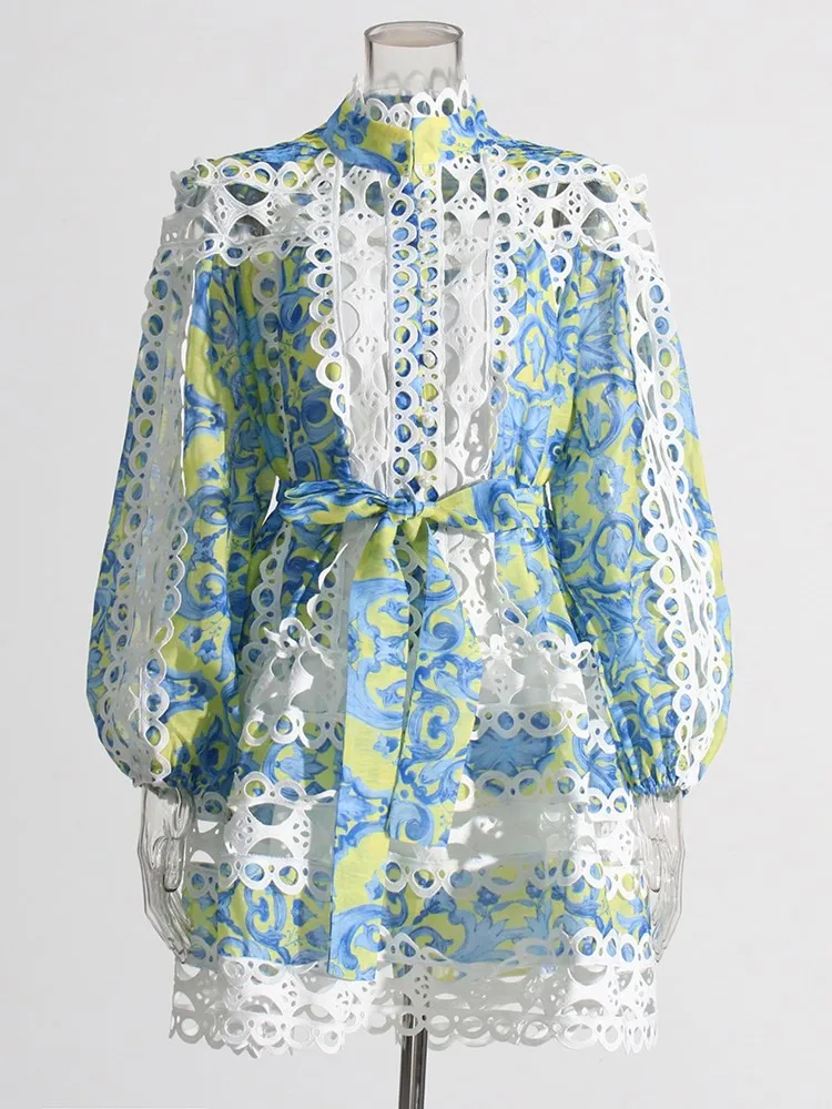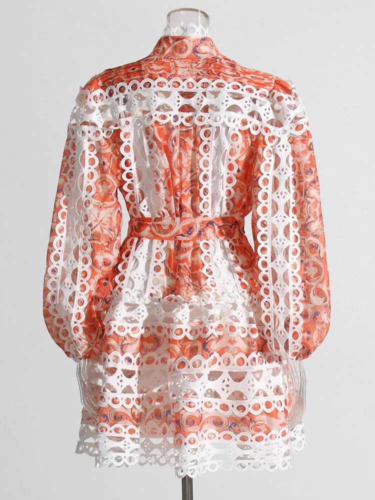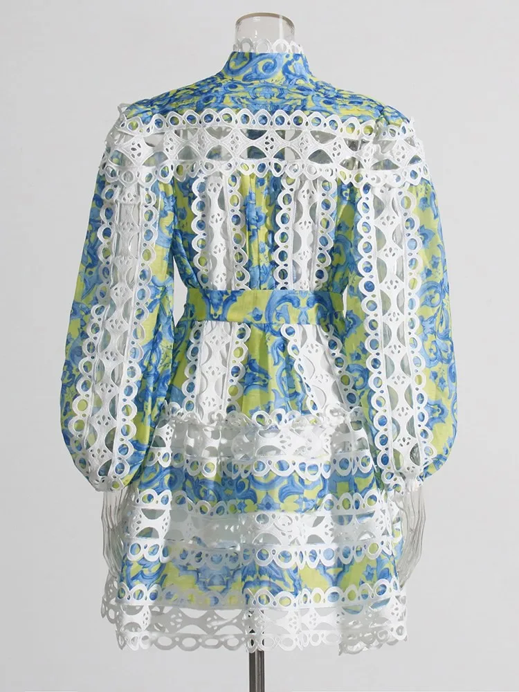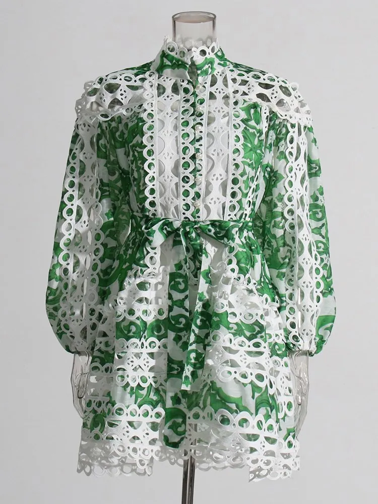 TWOTWINSTYLE Hollow Out Hit Color Dresses For Women Lapel Long Sleeve High Waist Spliced Lace Up Printing Mini Dress Female New