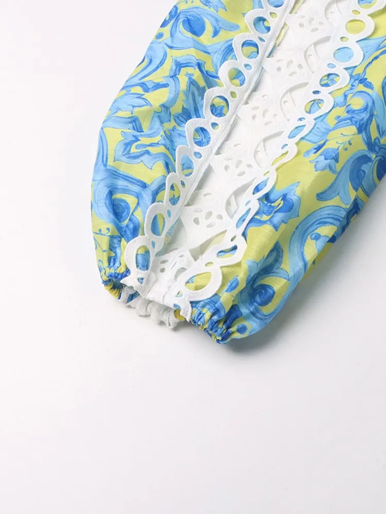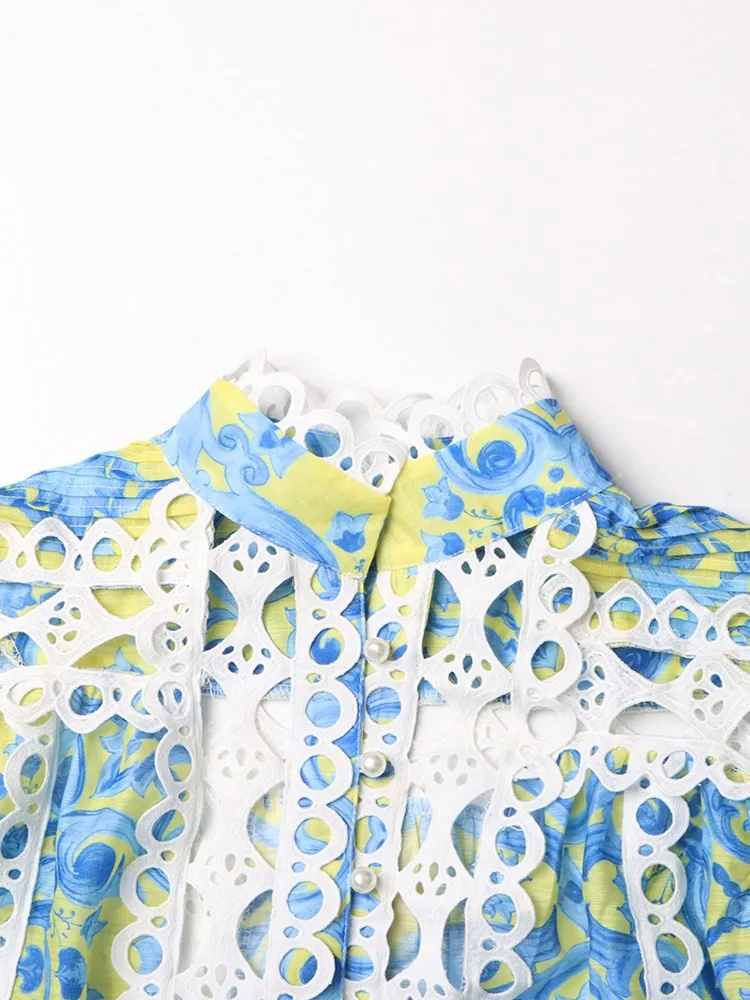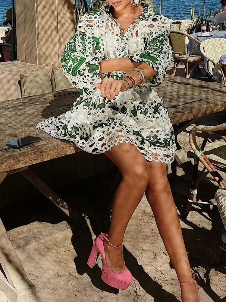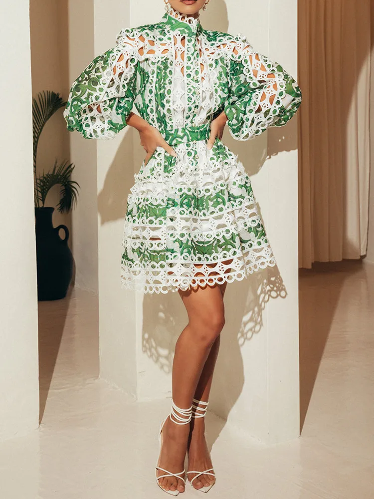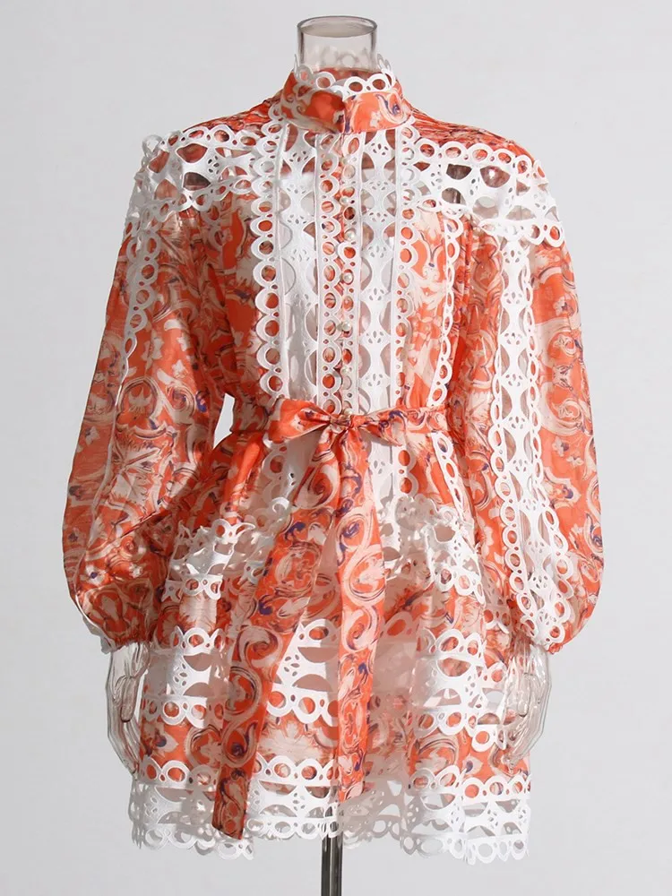 TWOTWINSTYLE Hollow Out Hit Color Dresses For Women Lapel Long Sleeve High Waist Spliced Lace Up Printing Mini Dress Female New
