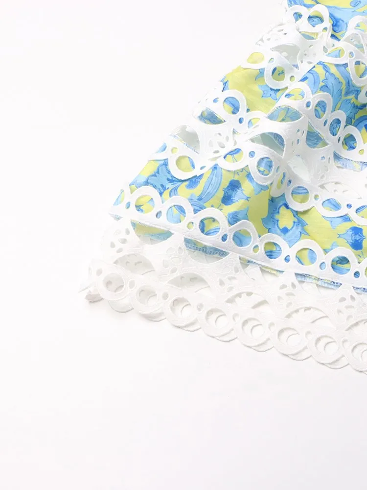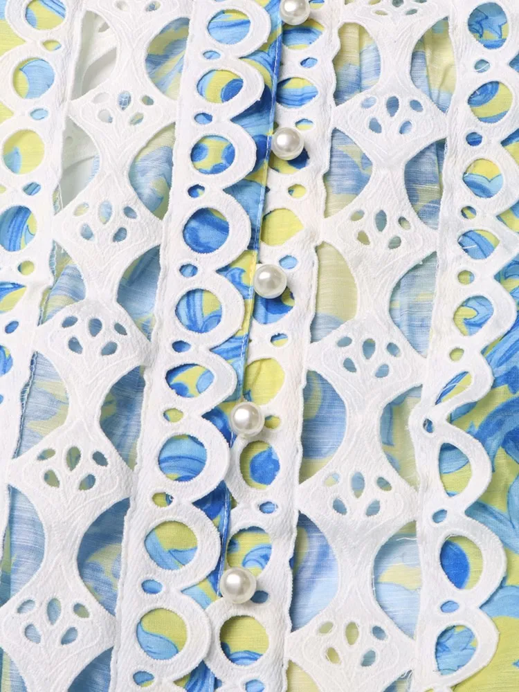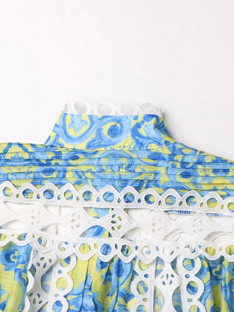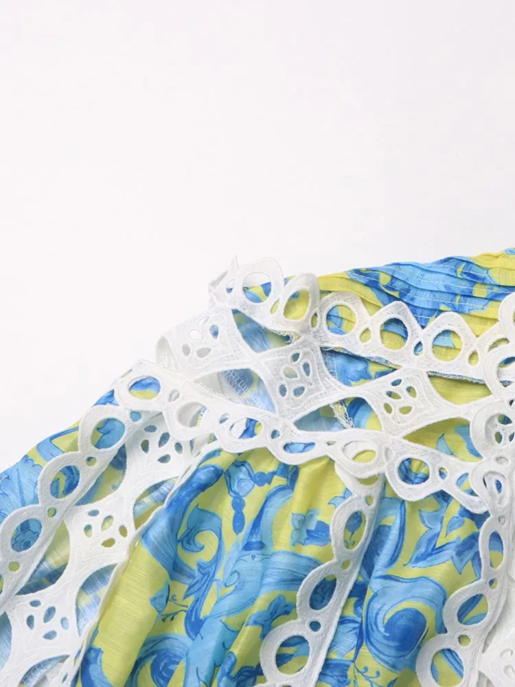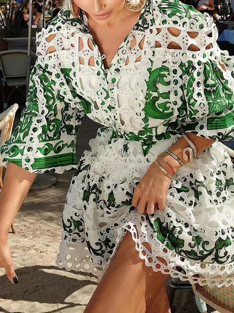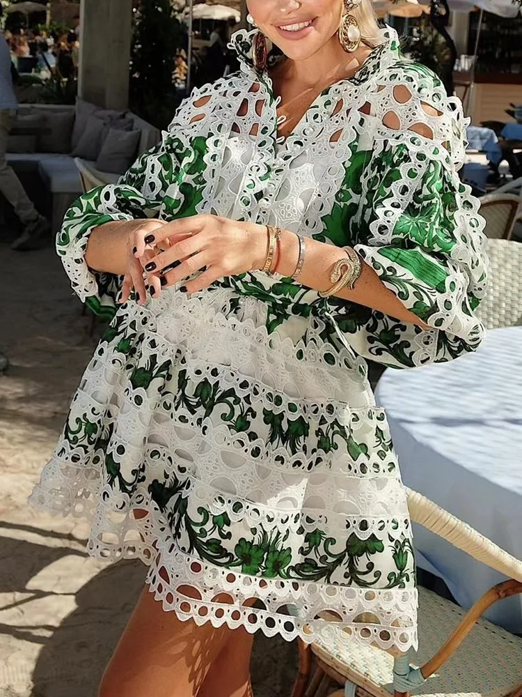 TWOTWINSTYLE Hollow Out Hit Color Dresses For Women Lapel Long Sleeve High Waist Spliced Lace Up Printing Mini Dress Female New