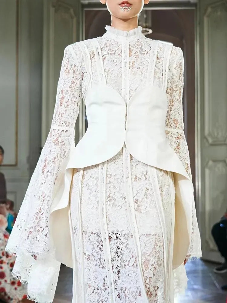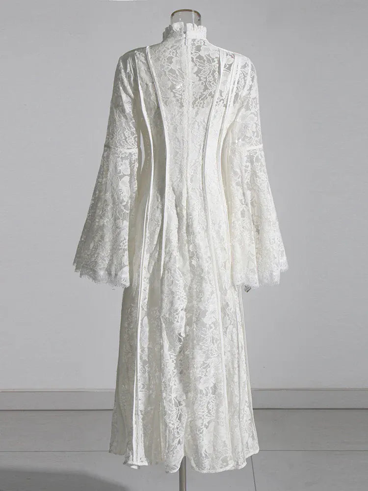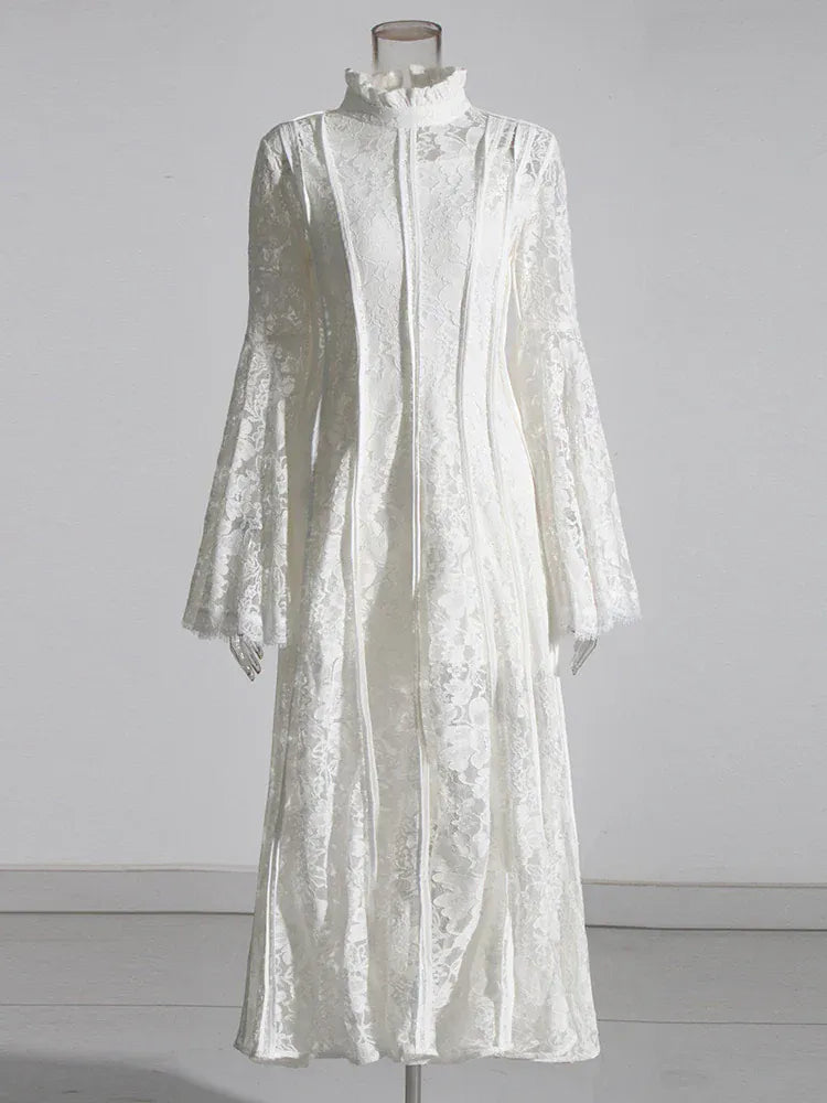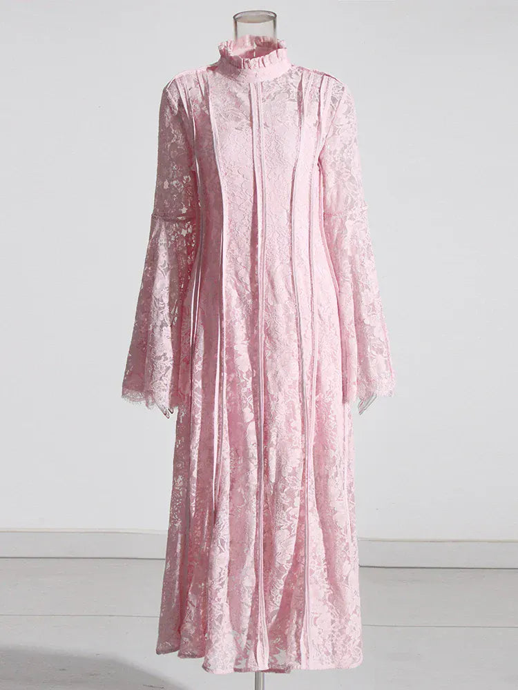 TWOTWINSTYLE Patchwork Lace Slimming Dresses For Women Stand Collar Flare Sleeve High Waist Solid Elegant Dress Female Fashion