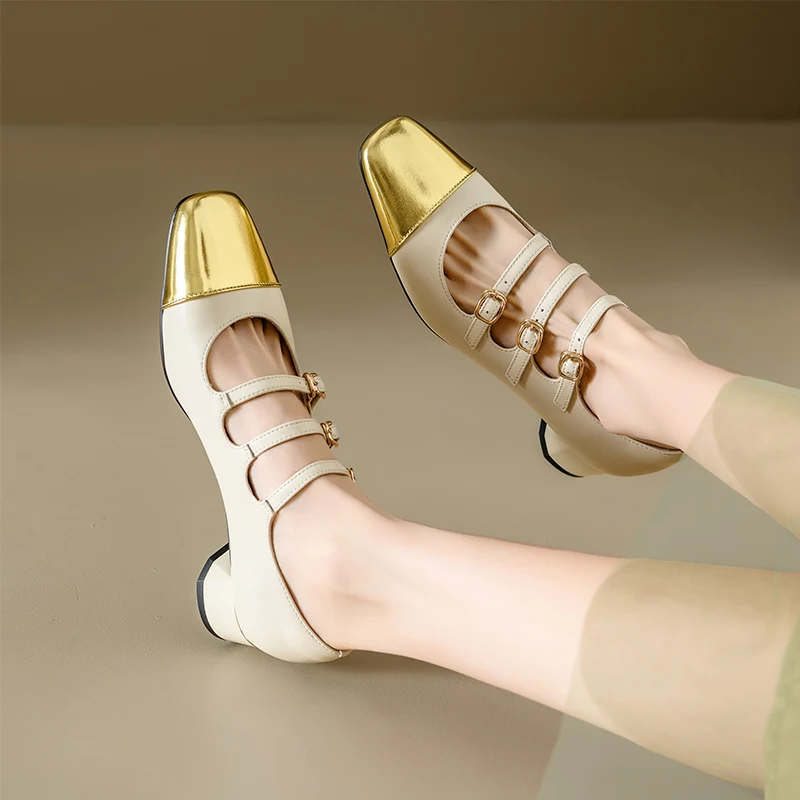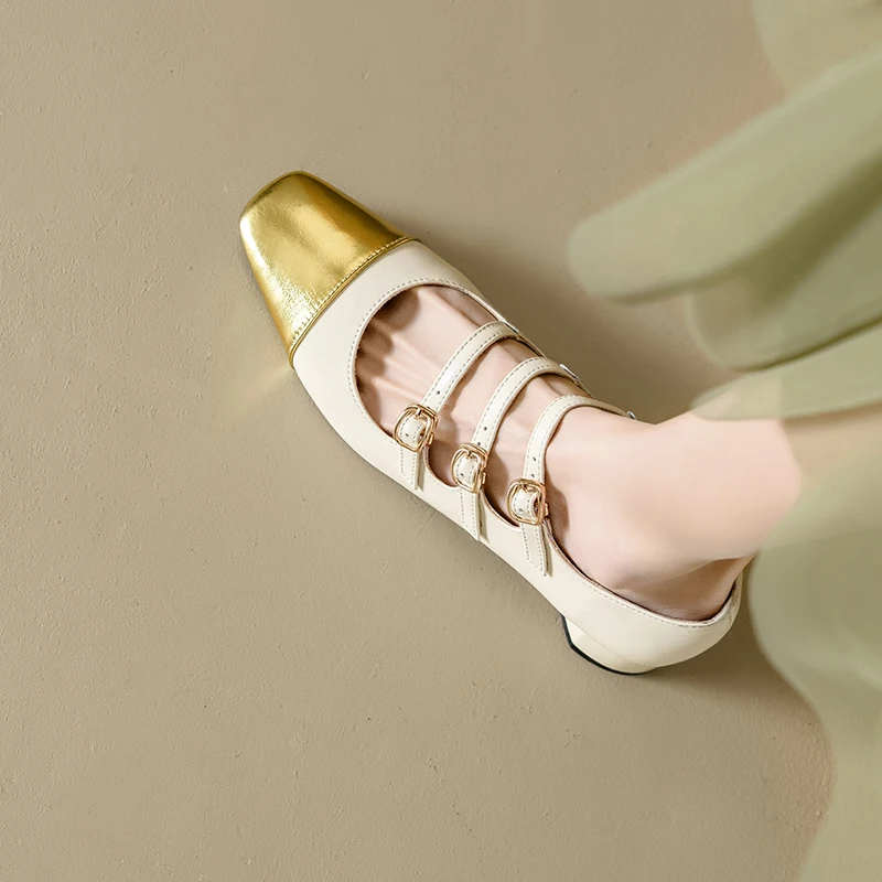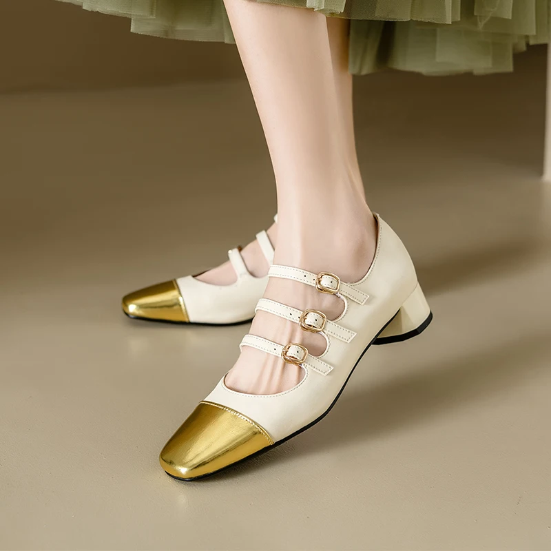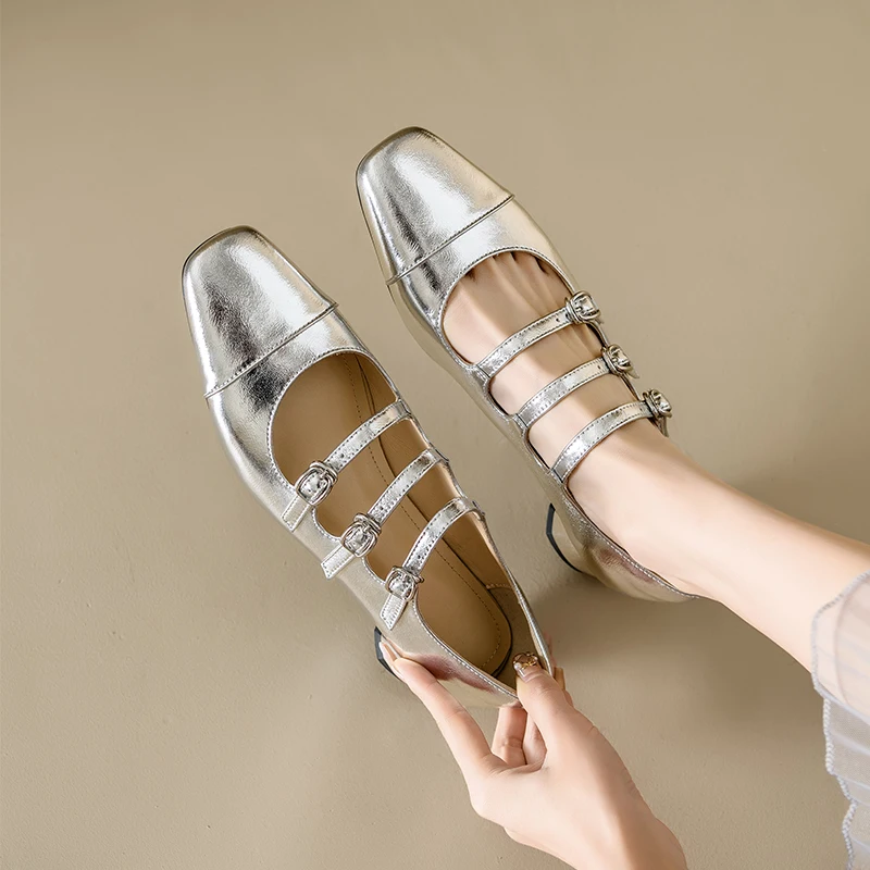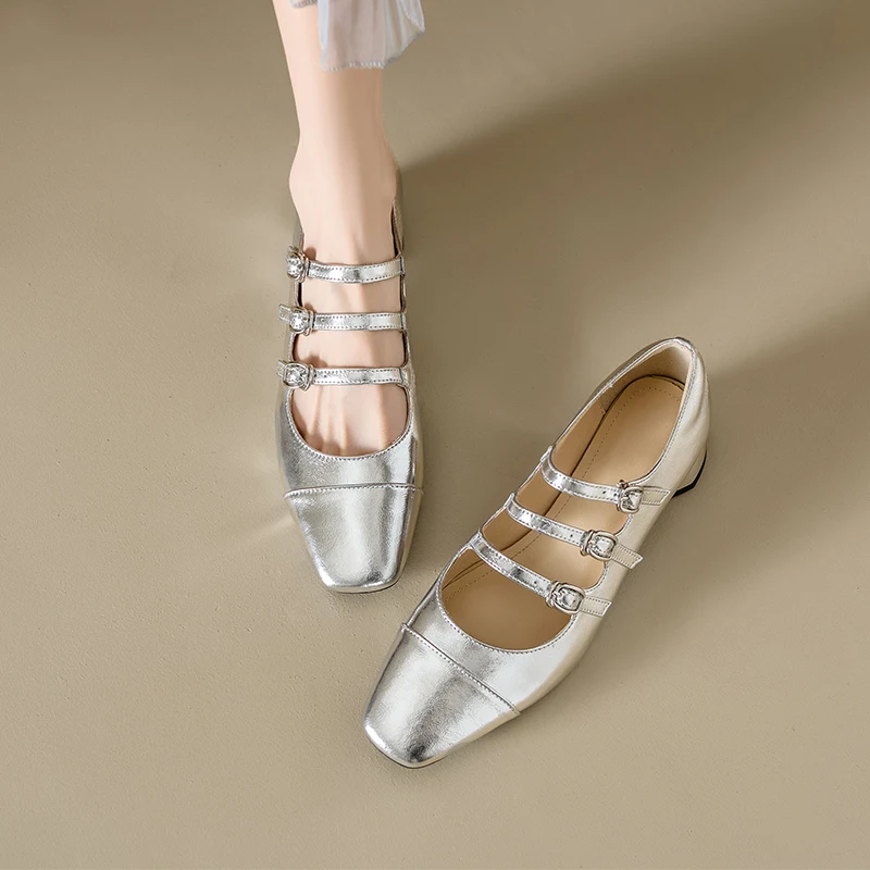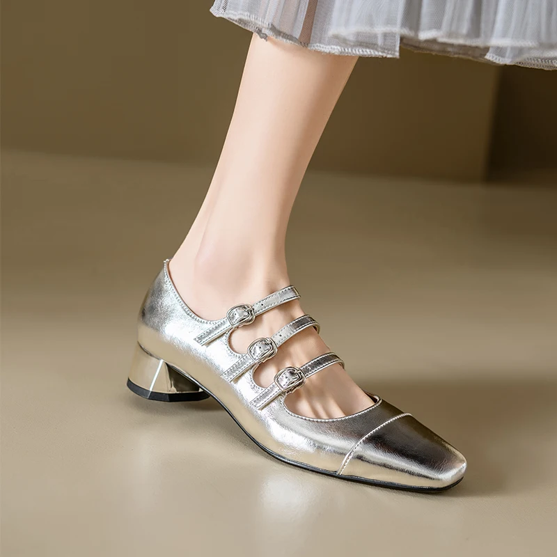 Ubililia Customized genuine leather new silver three strap shallow square round toe single shoes for women mid block heels pumps
