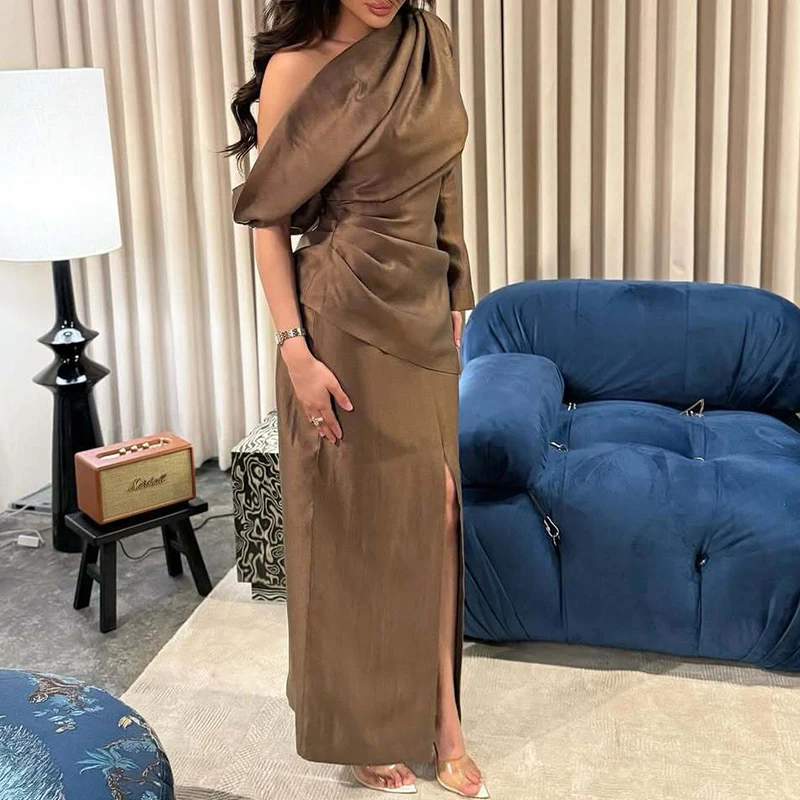 Unique Solid Hollow Off Shoulder Evening Dress New Autumn Long Sleeved Women Banquet Dress Casual High Waist Split A-line Dress