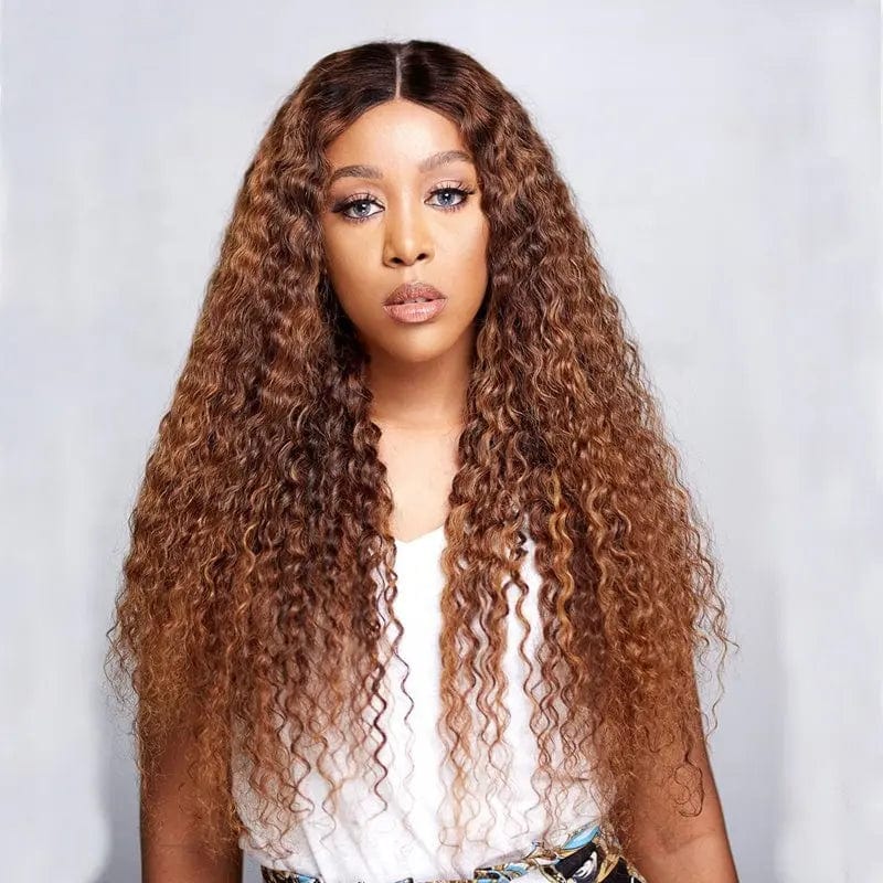 Unprocessed Cambodian Human Virgin Hair Kinky Curly Ombre Brown Cuticle Aligned Transparent Lace Front Wig