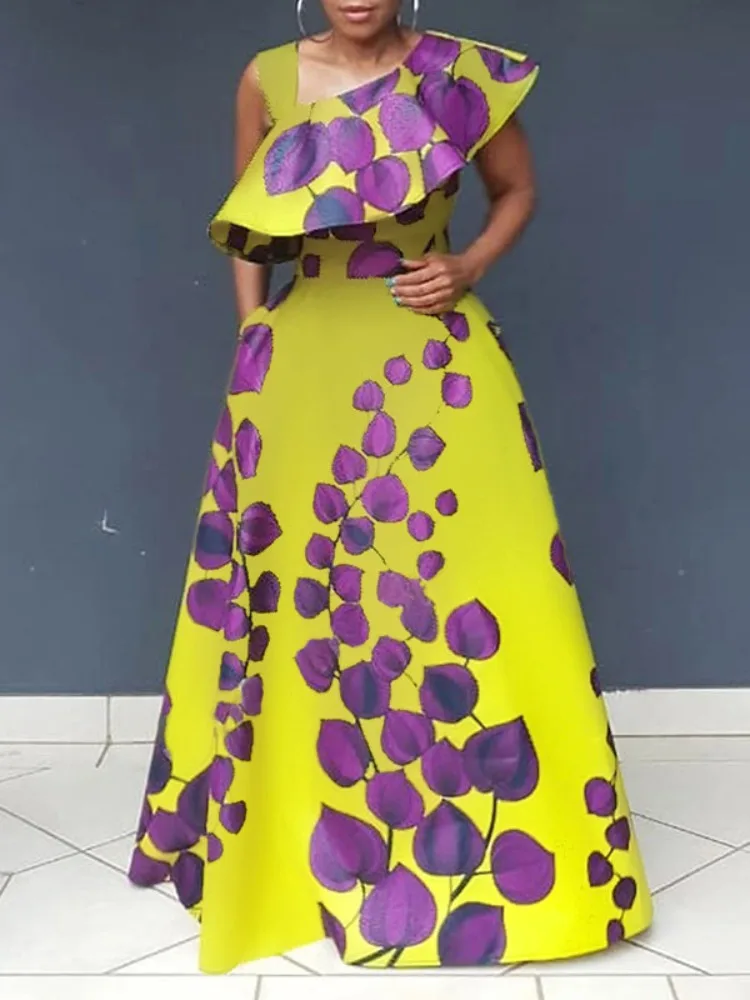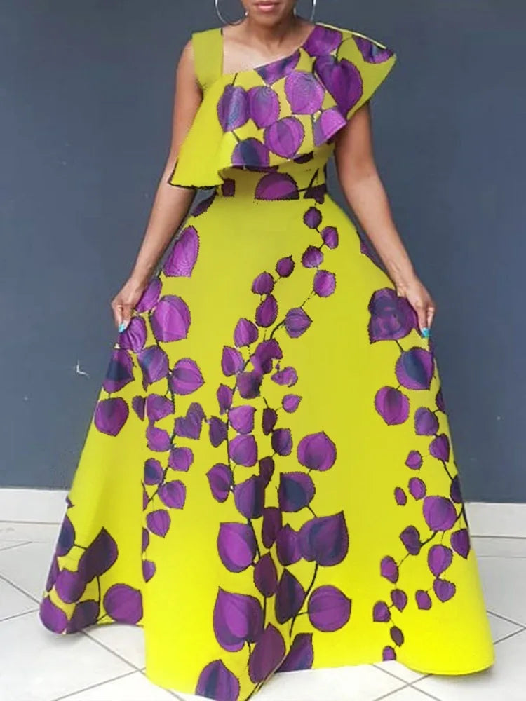 UOOZEE Women's One Shoulder Leaf Printed A-Line Dress 2025 New Sleeveless Asymmetric Collar Elegant Party Evening Maxi Dresses