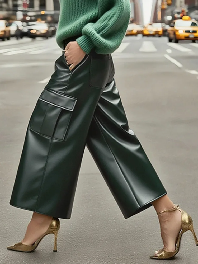 UOOZEE Women's PU Leather Pockets High Waisted Straight Leg Pants Fashion High Street Solid Color Casual Trendy Trousers Bottoms